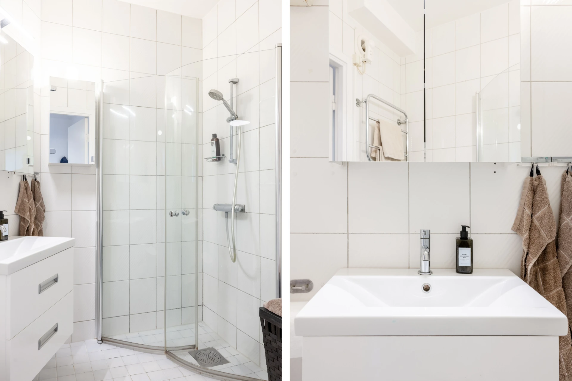 Vit klinker och vitt kakel. Badrummet är utrustat med toalett, handfat med kommod, spegelskåp med belysning, dusch med duschdörrar samt handdukstork.