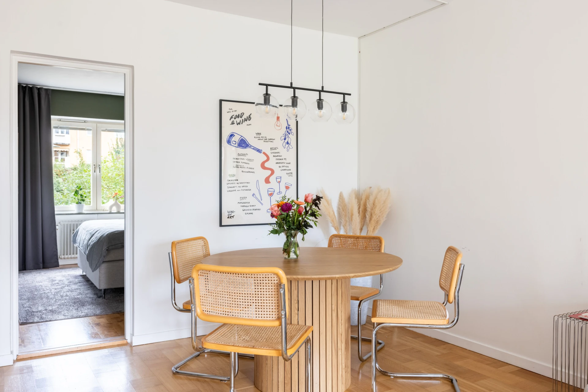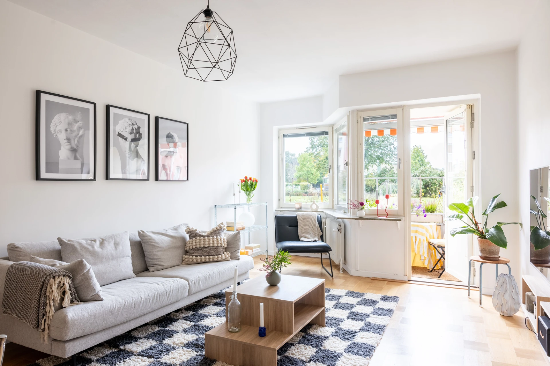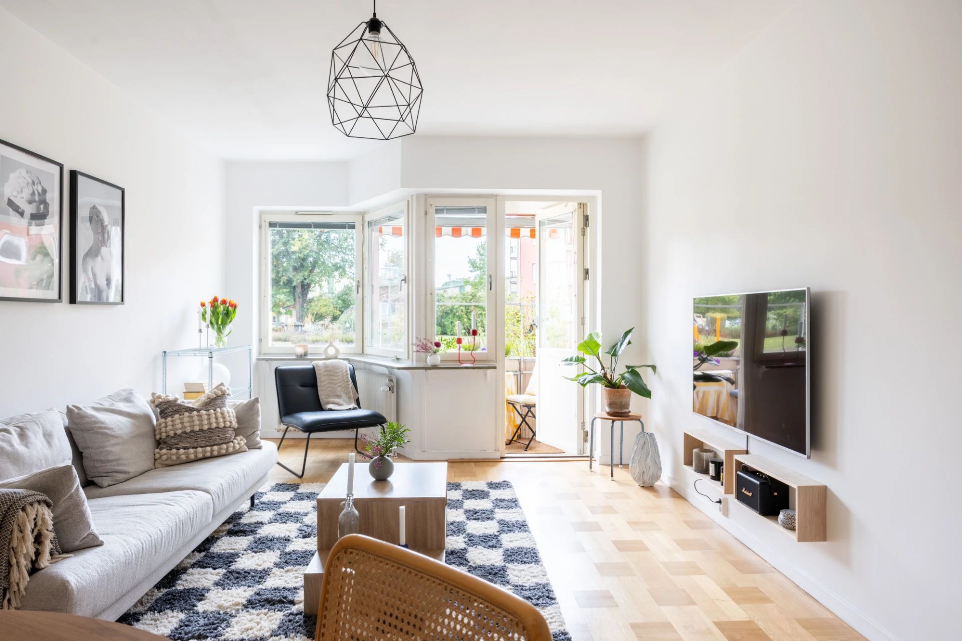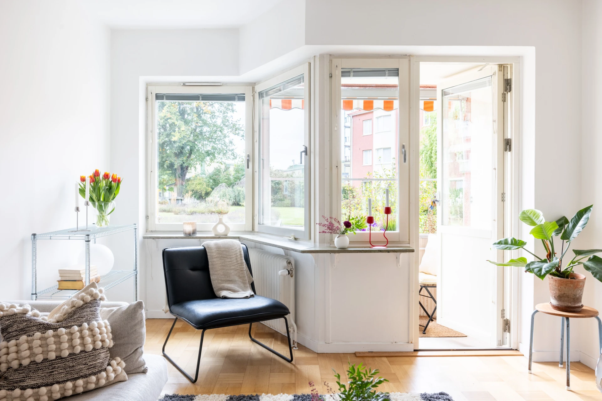Parkettgolv och vita väggar. Utgång till balkong i söderläge.