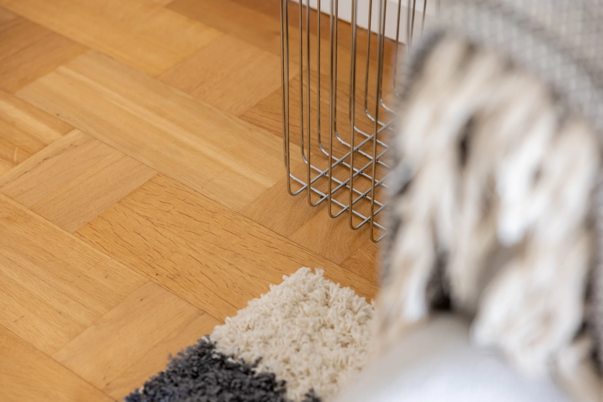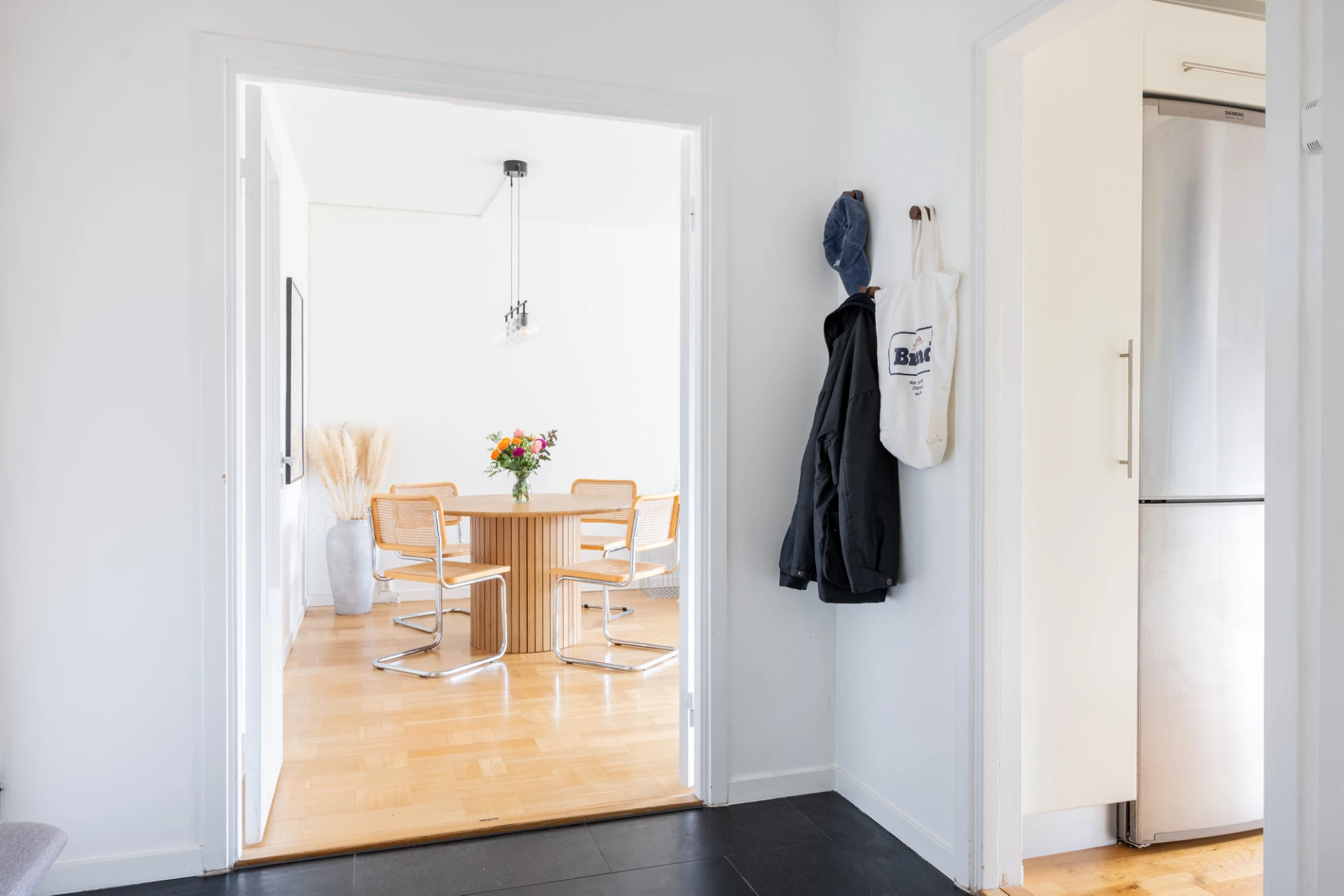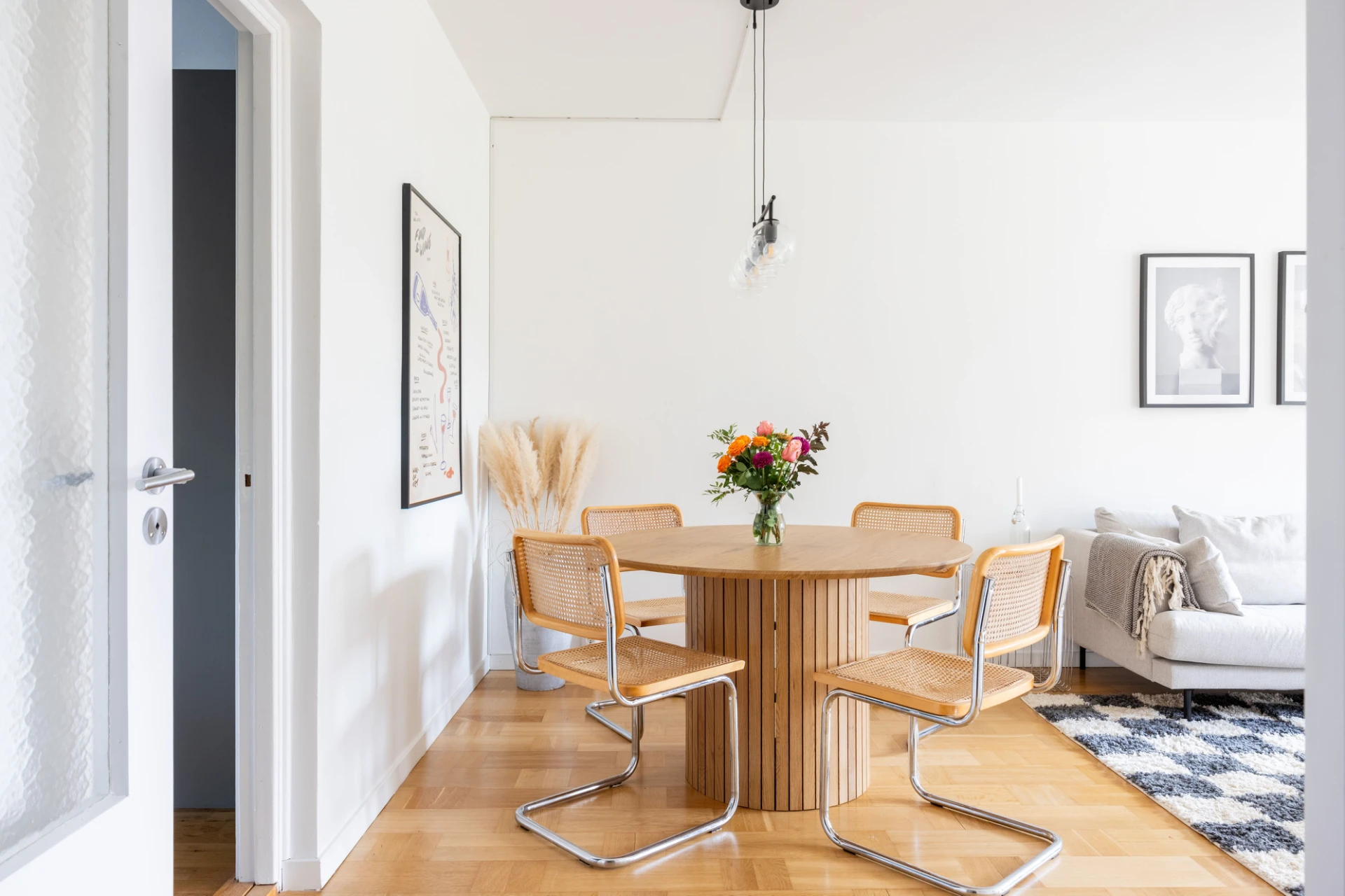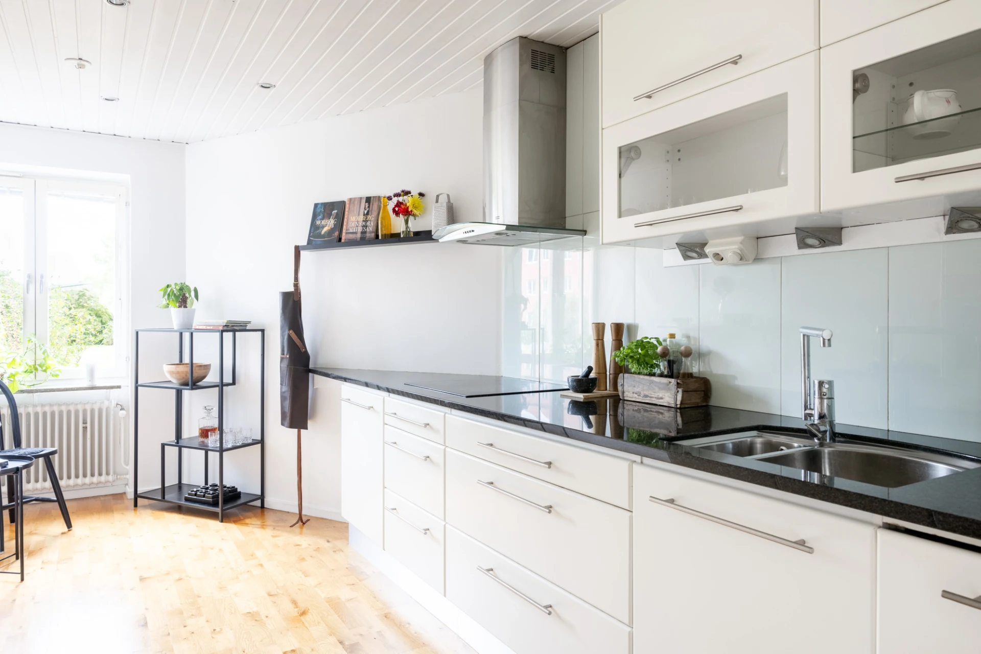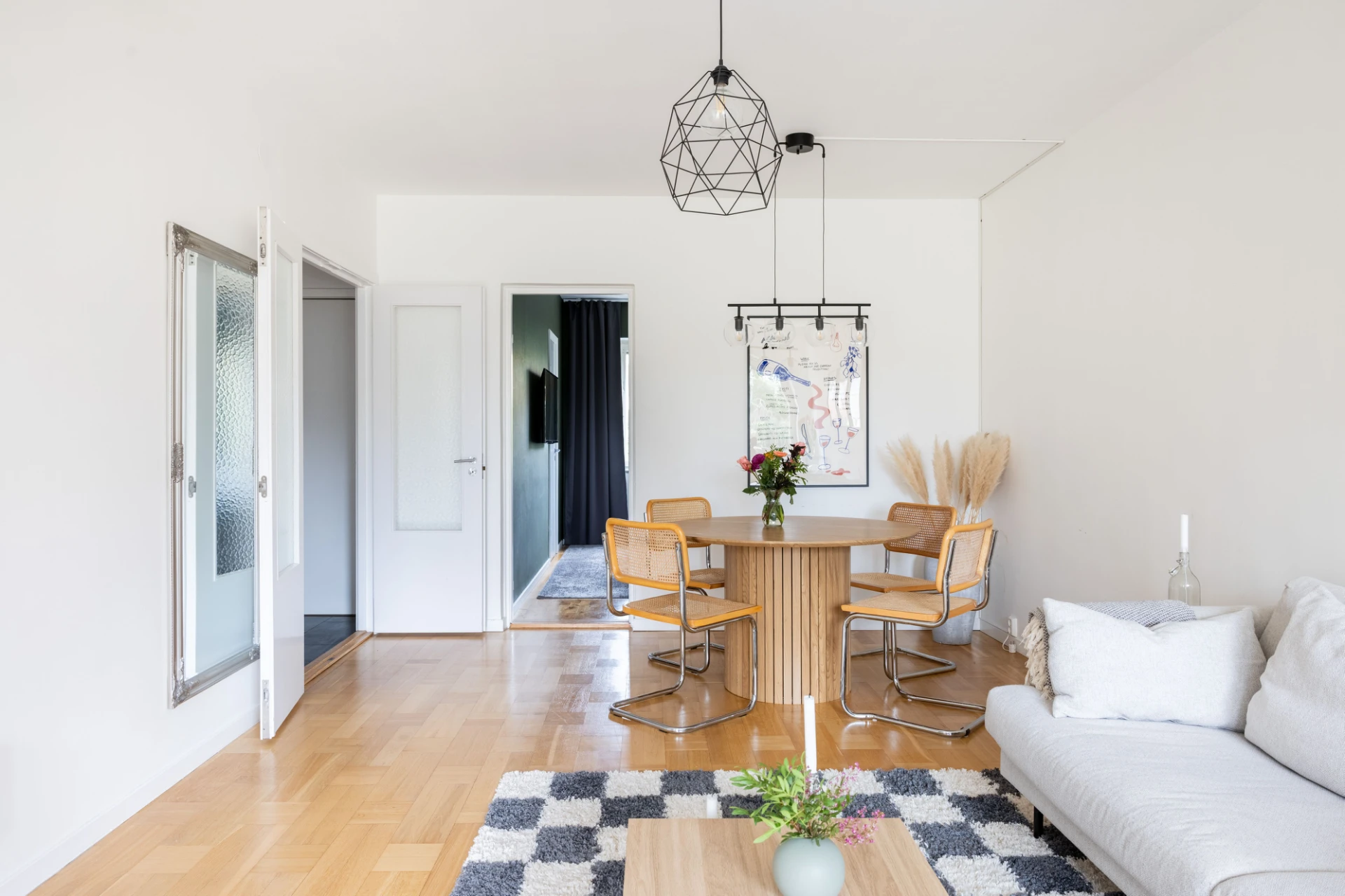 Parkettgolv och vita väggar. Utgång till balkong i söderläge.