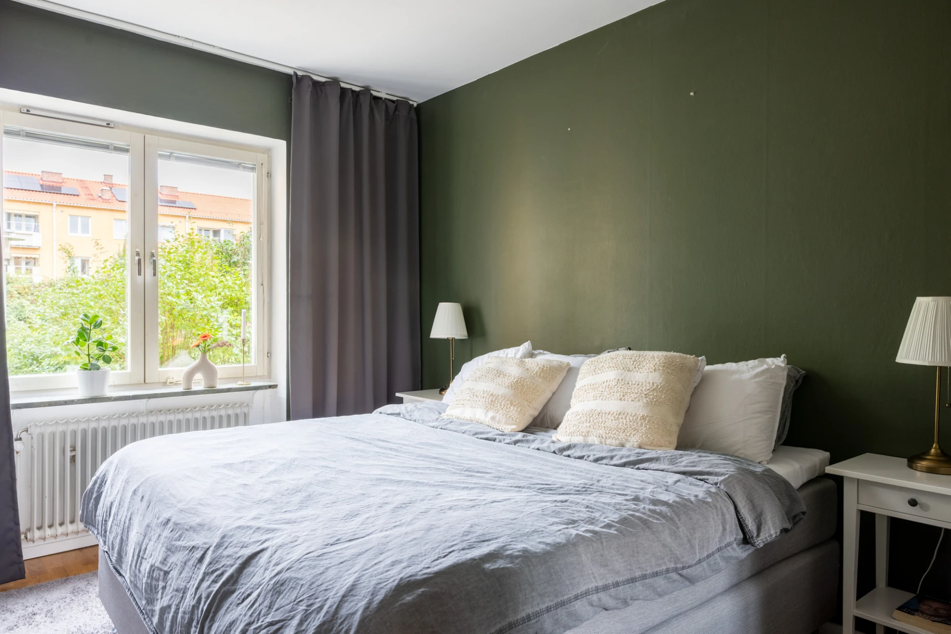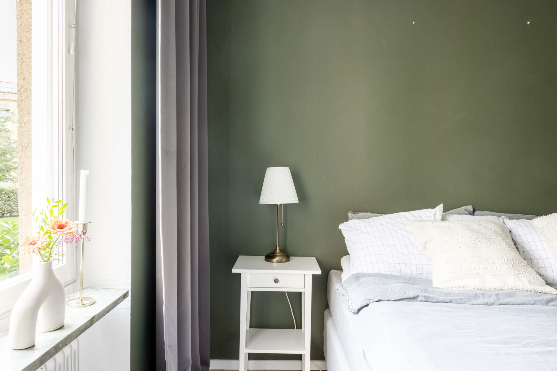 Parkettgolv och gröna väggar. I sovrummet finns klädkammare och platsbyggd garderob.