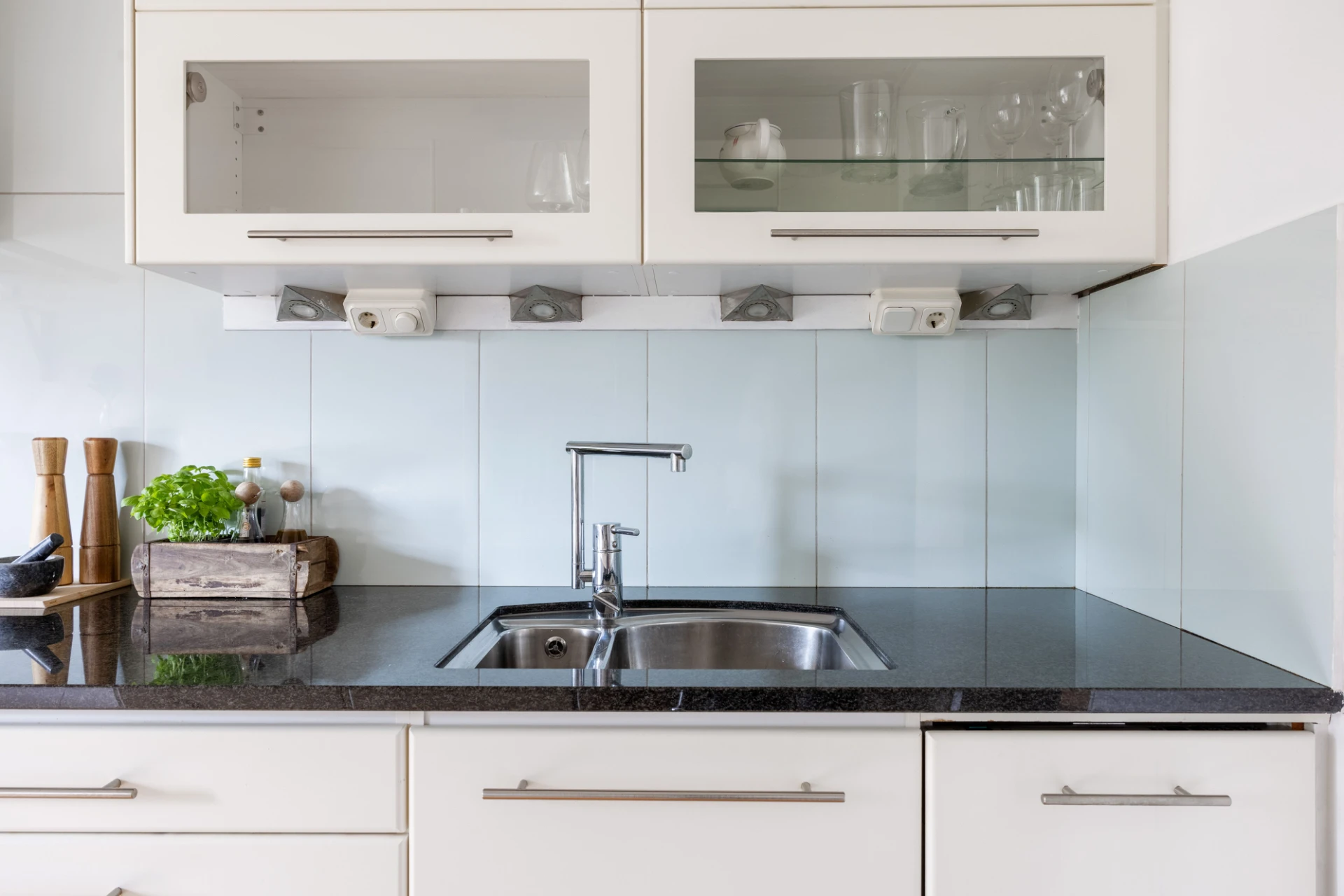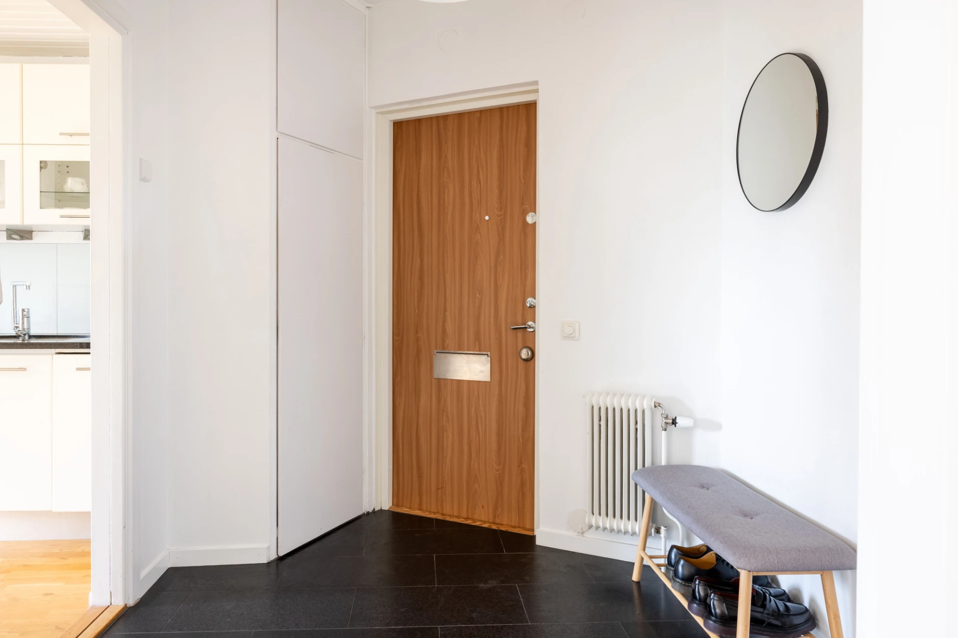Svart klinker och vita väggar. Plats för avhängning.