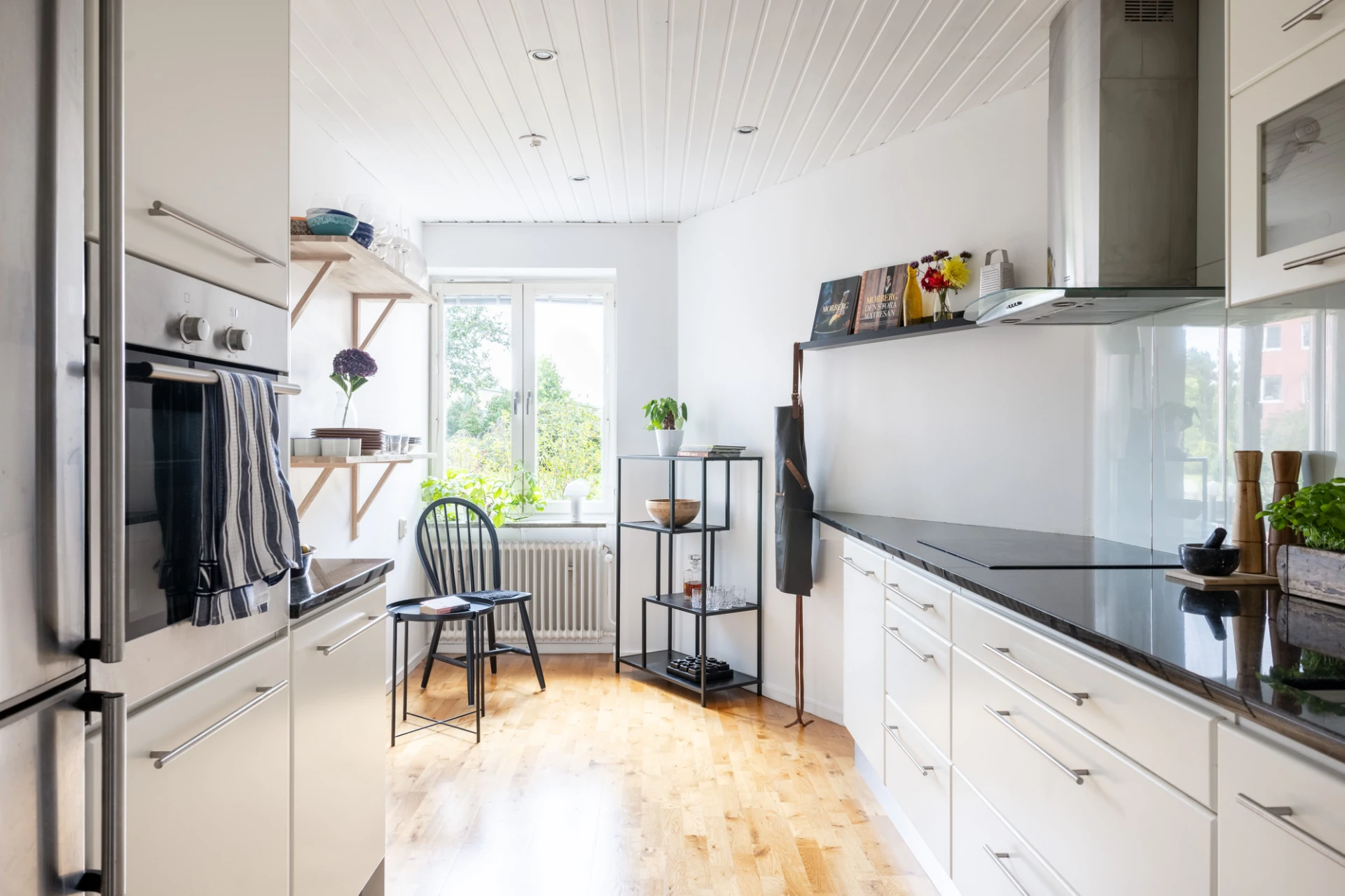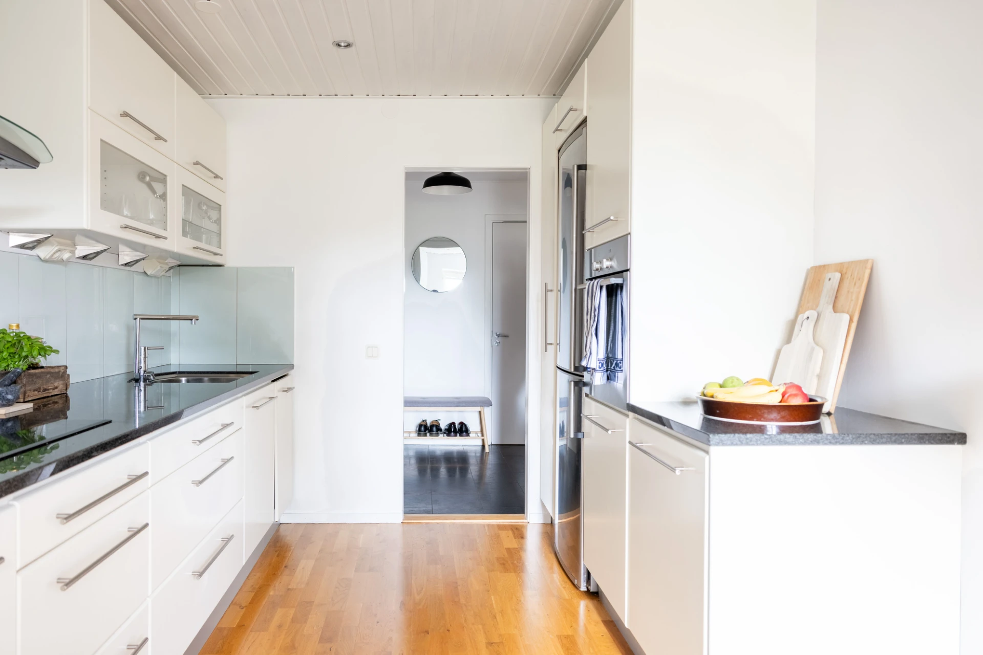 Parkettgolv och vita väggar. Köket är utrustat med spishäll, köksfläkt, kyl/frys, ugn samt inbyggd diskmaskin.