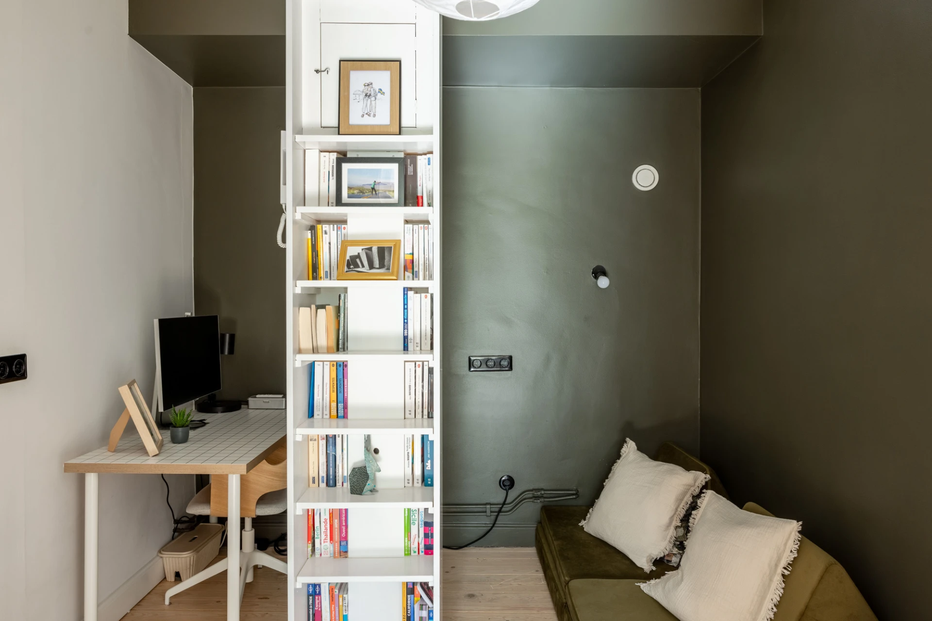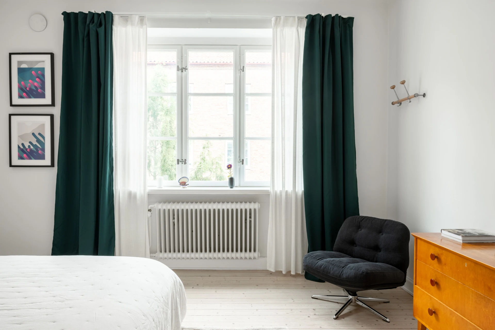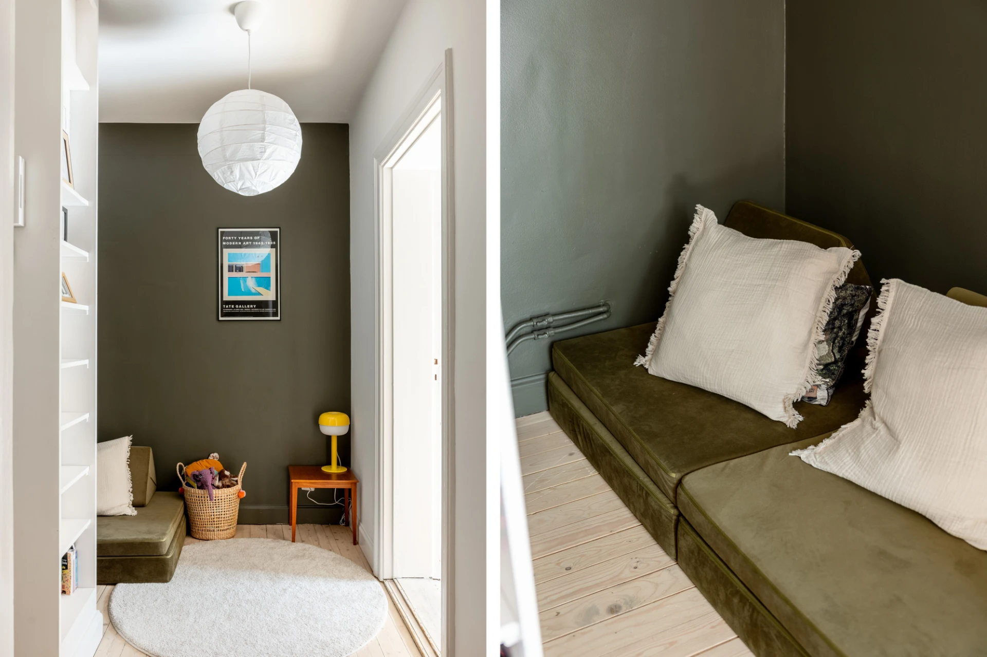 Brädgolv och vita samt målade väggar i mörkgrön nyans.