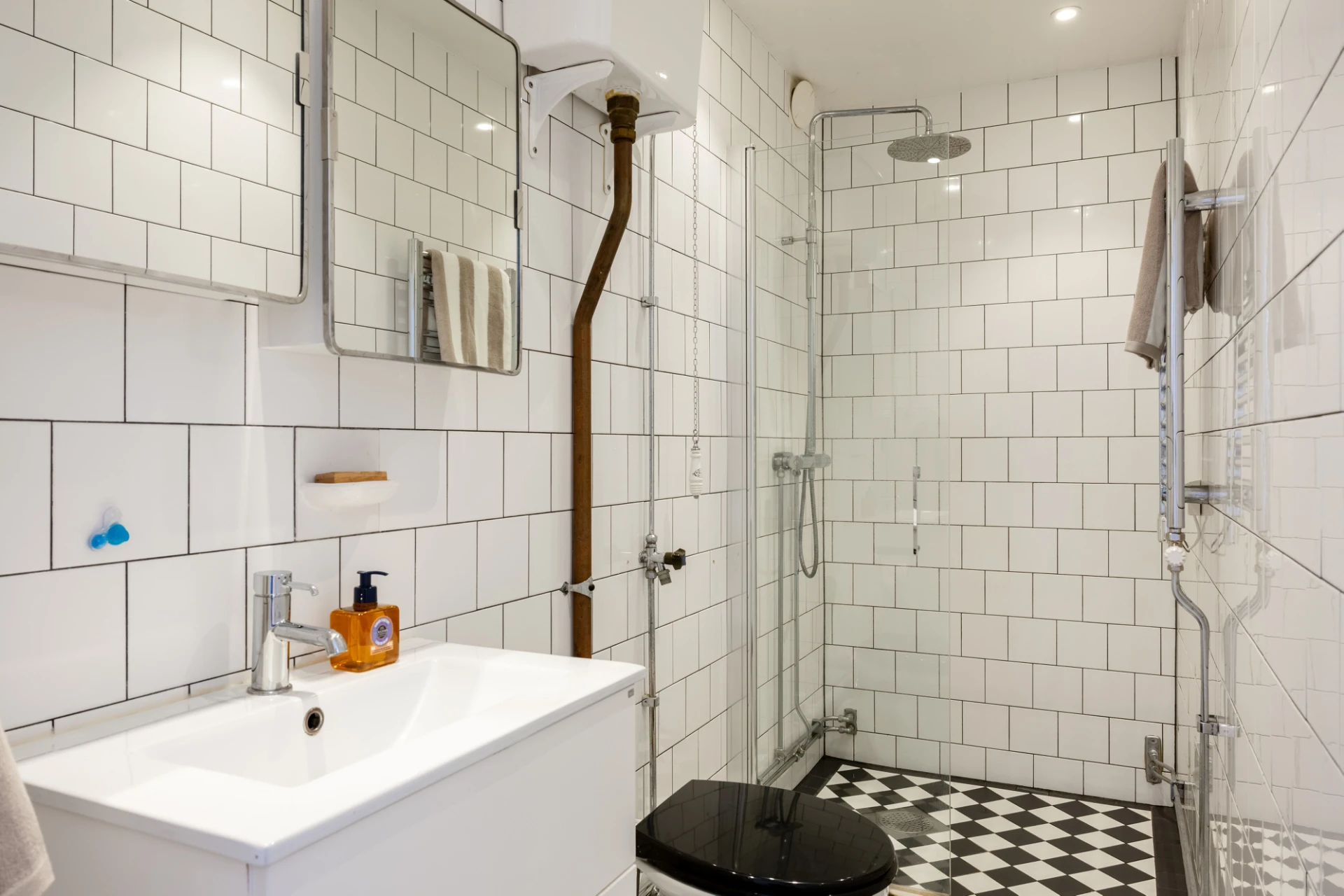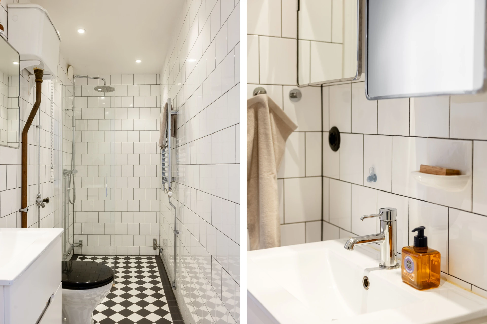 Helkaklat badrum i svart och vitt. Här finns WC, handfat med kommod, spegelskåp, handdukstork och dusch med skiljevägg i glas.