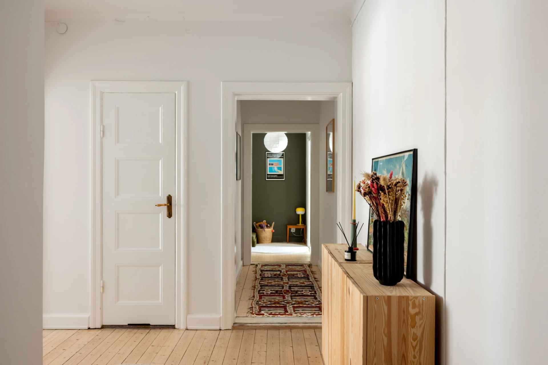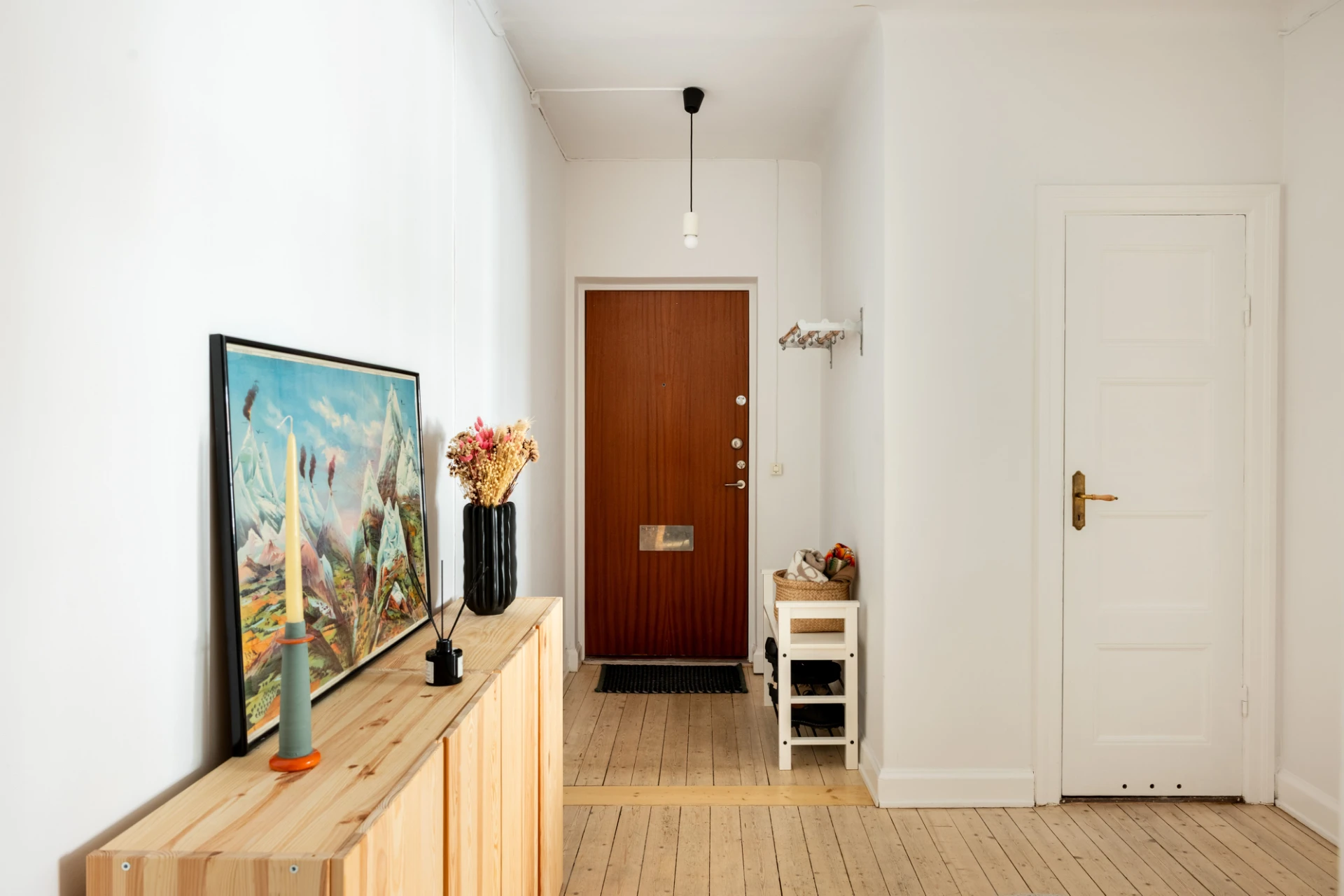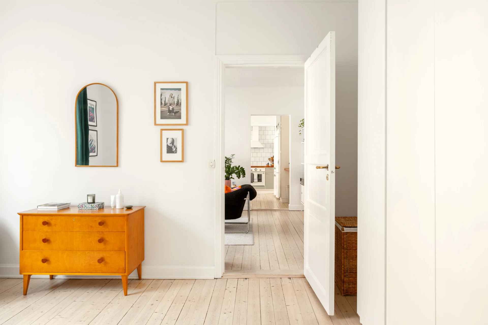 Brädgolv och vita väggar. Förvaring i flera garderober.