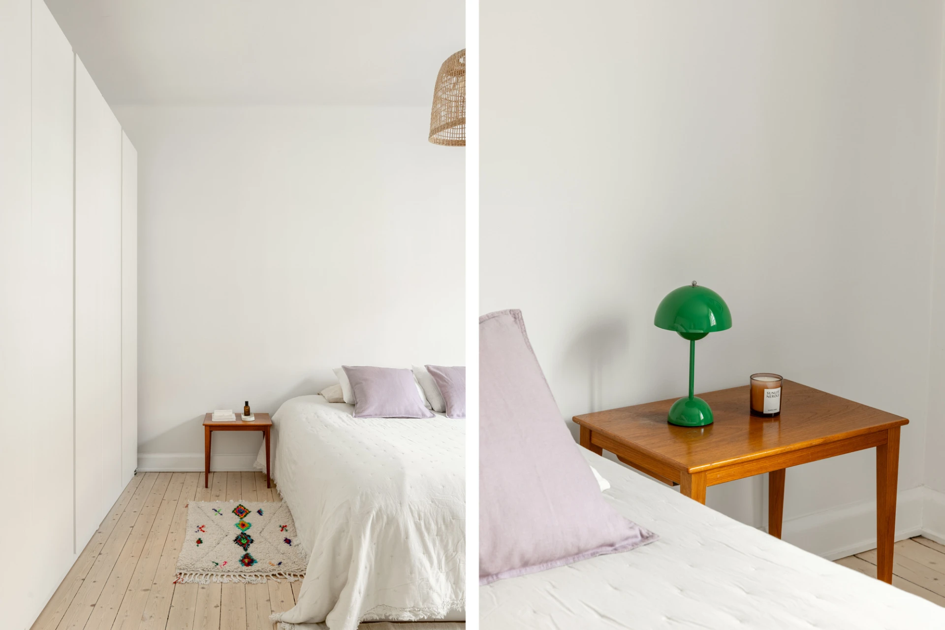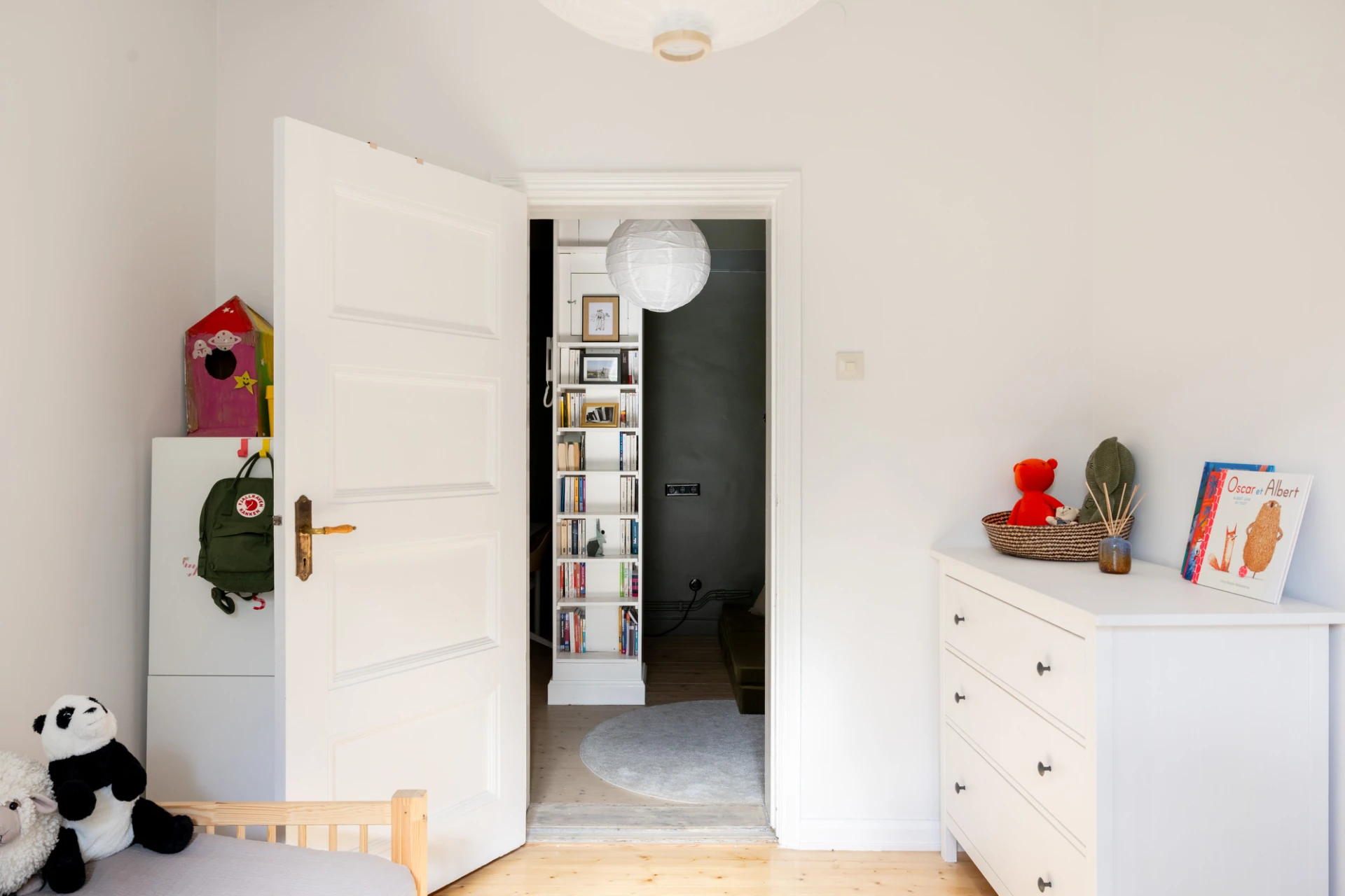 Brädgolv och vita väggar. Förvaring i inbyggd garderob.
