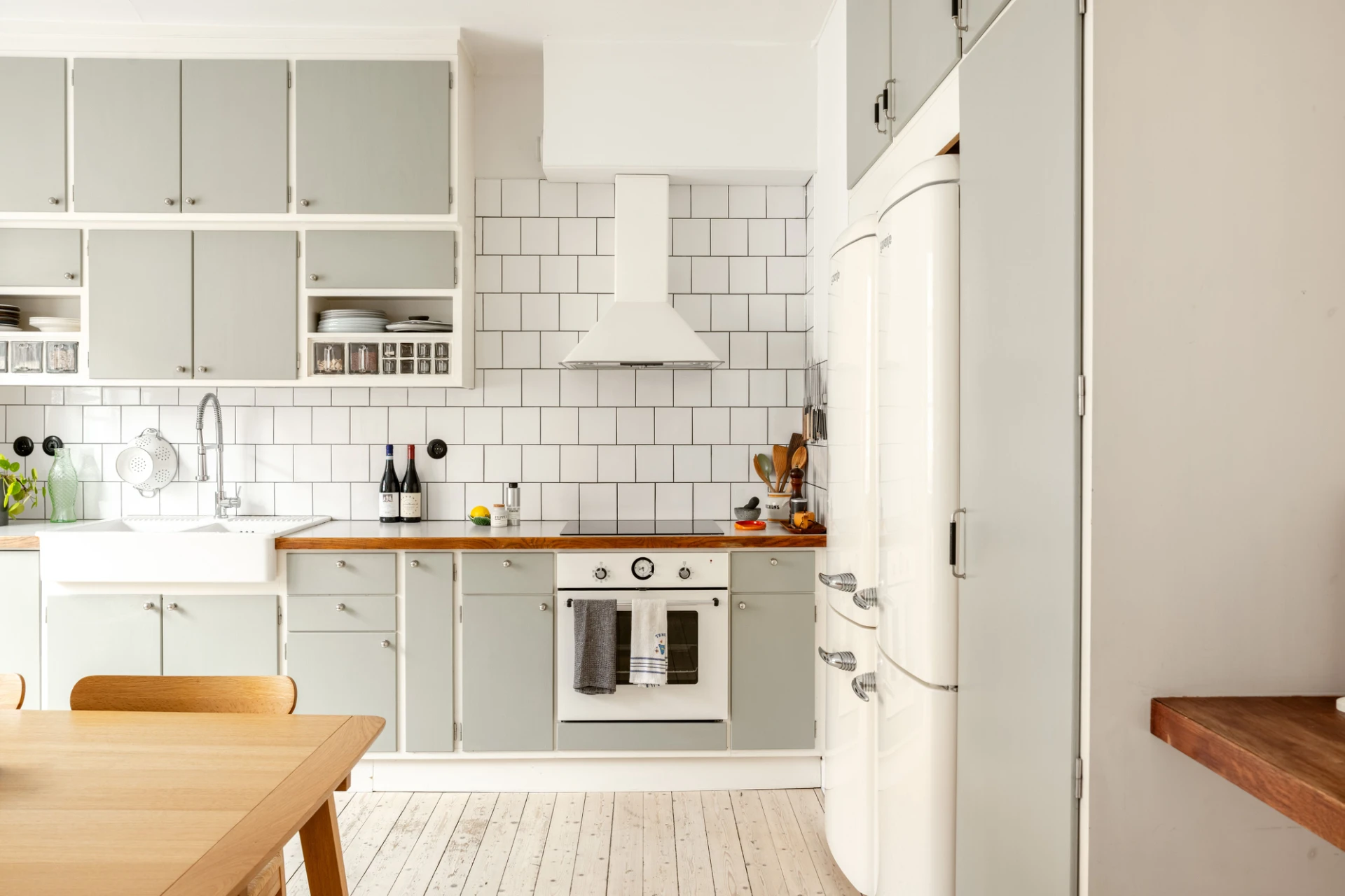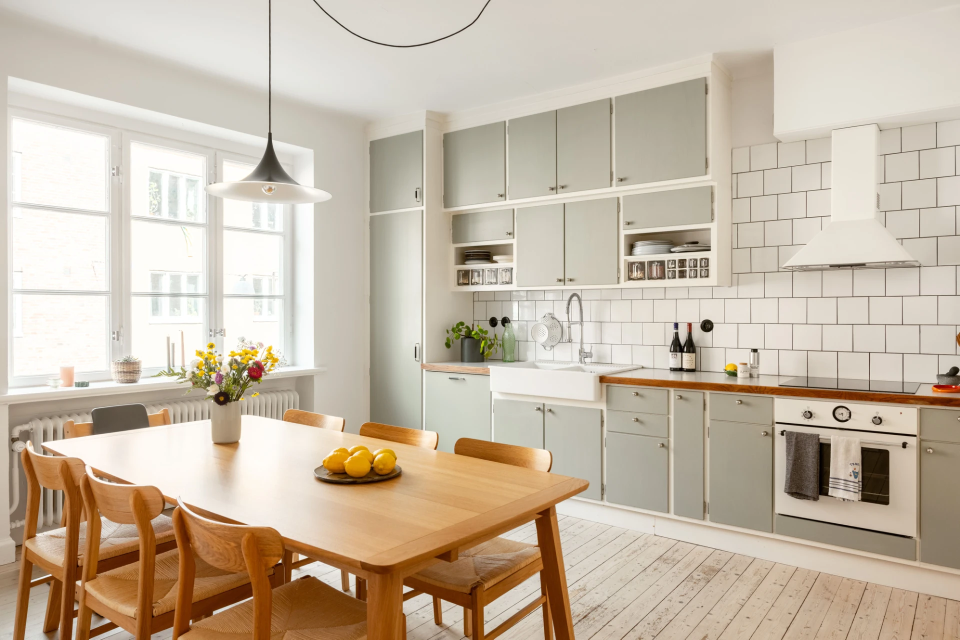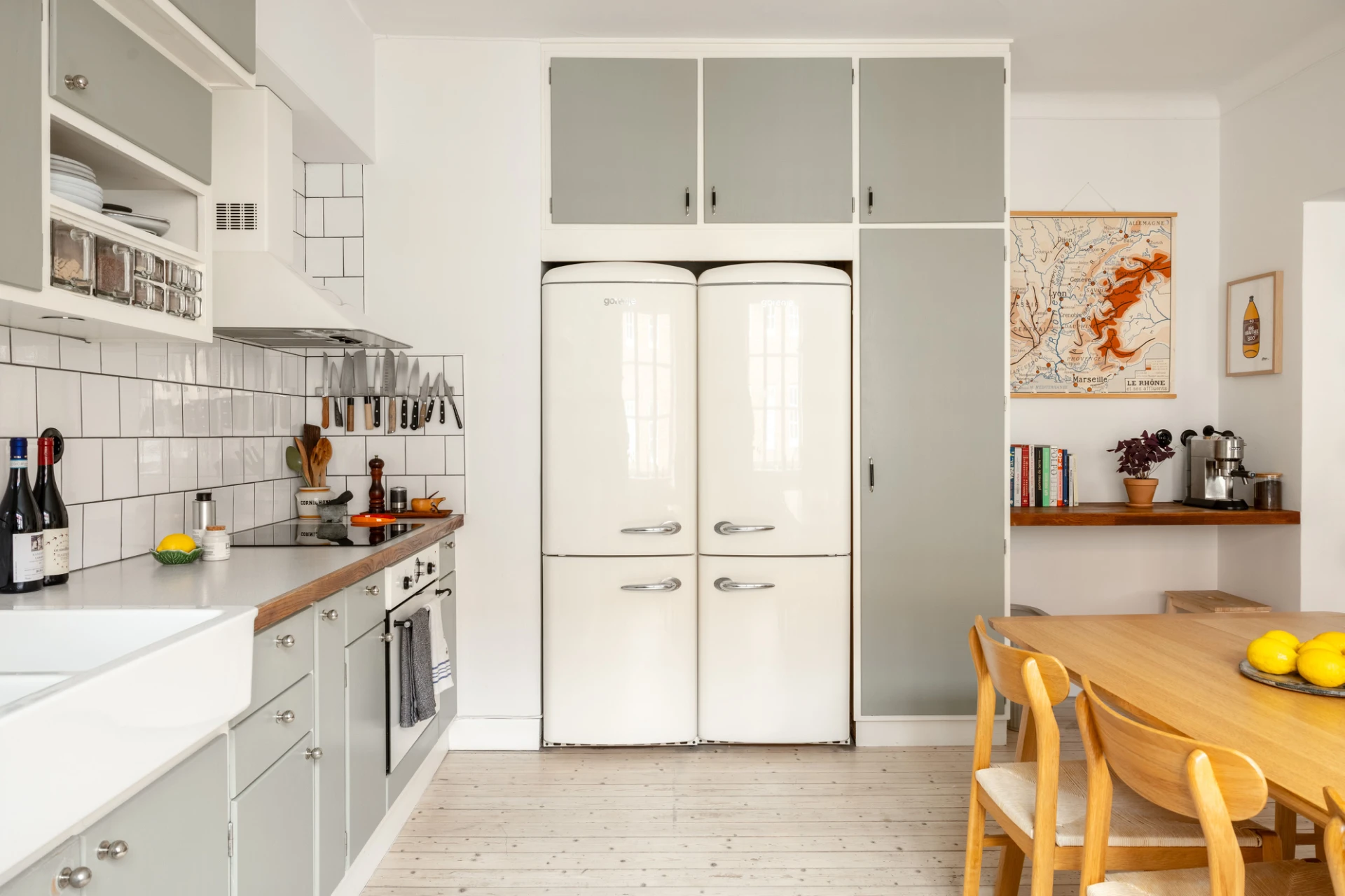 Brädgolv och vita väggar. Grå köksinredning och vitt kakel ovan arbetsytor i vit laminat. Köket är utrustat med dubbla kyl/frysar, spis, ugn, fläkt och integrerad diskmaskin. Här finns även plats för stort matbord.