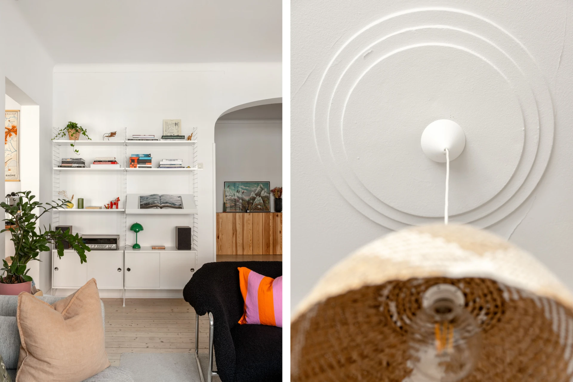 Brädgolv och vita väggar. I taket finns en vacker lamprosett.