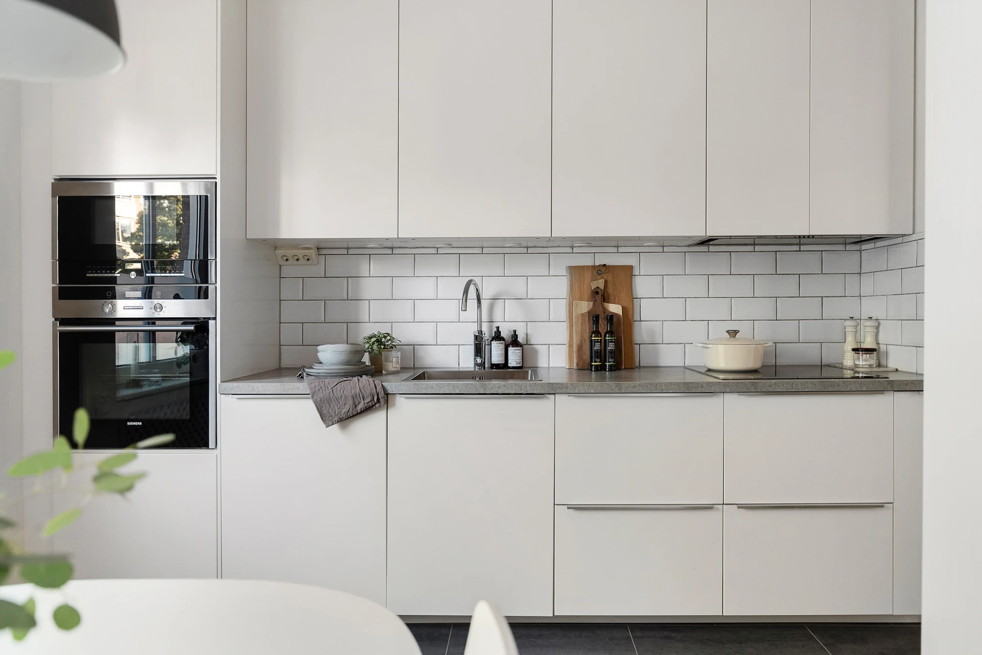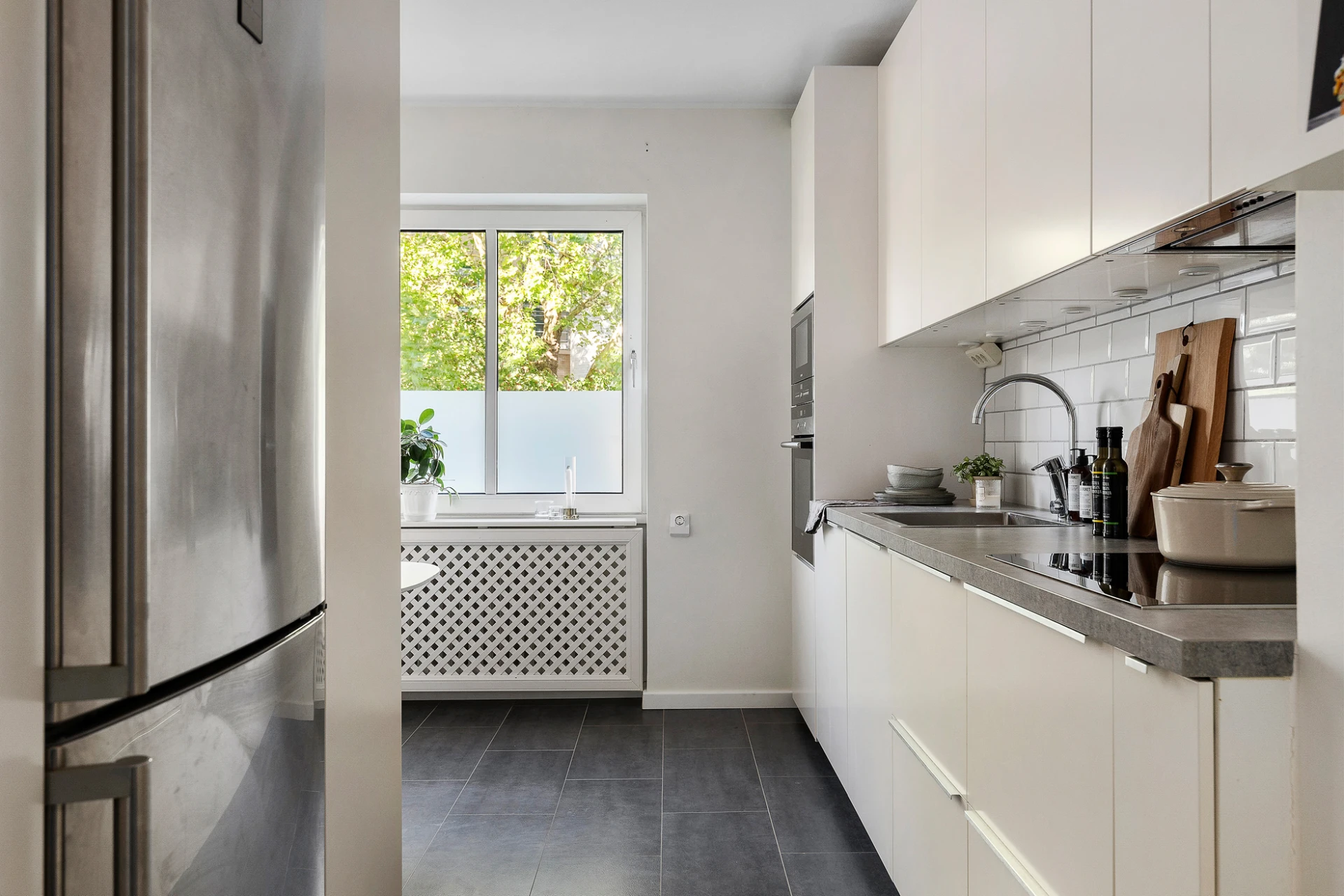 Laminatgolv och vita väggar. Vit köksinredning och vitt kakel ovan grå bänkskiva. Köket är utrustat med kyl/frys, spishäll, diskmaskin, inbyggd ugn och inbyggd mikrovågsugn.