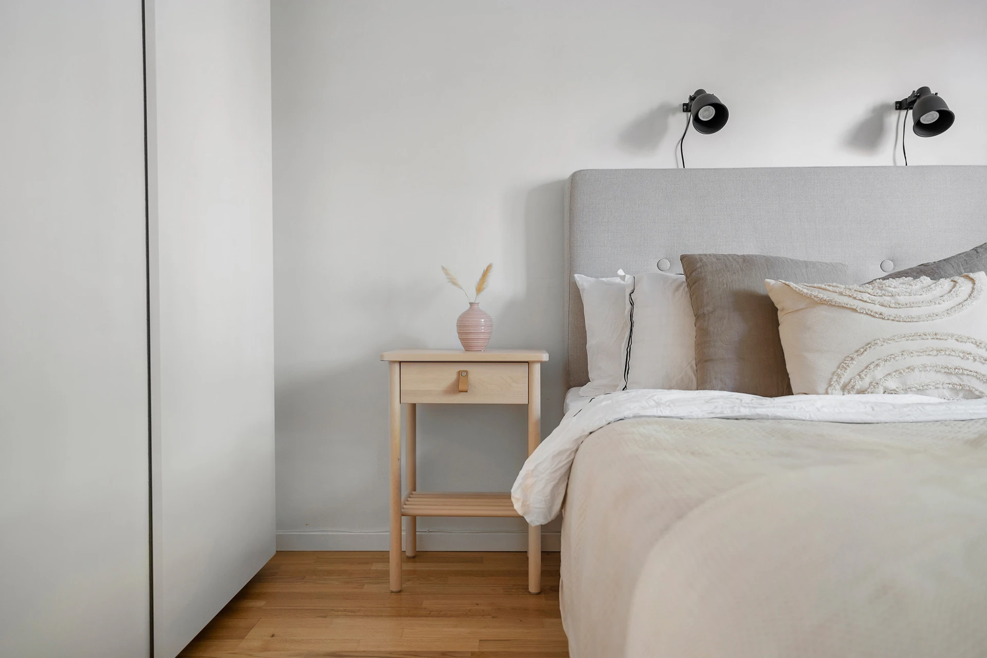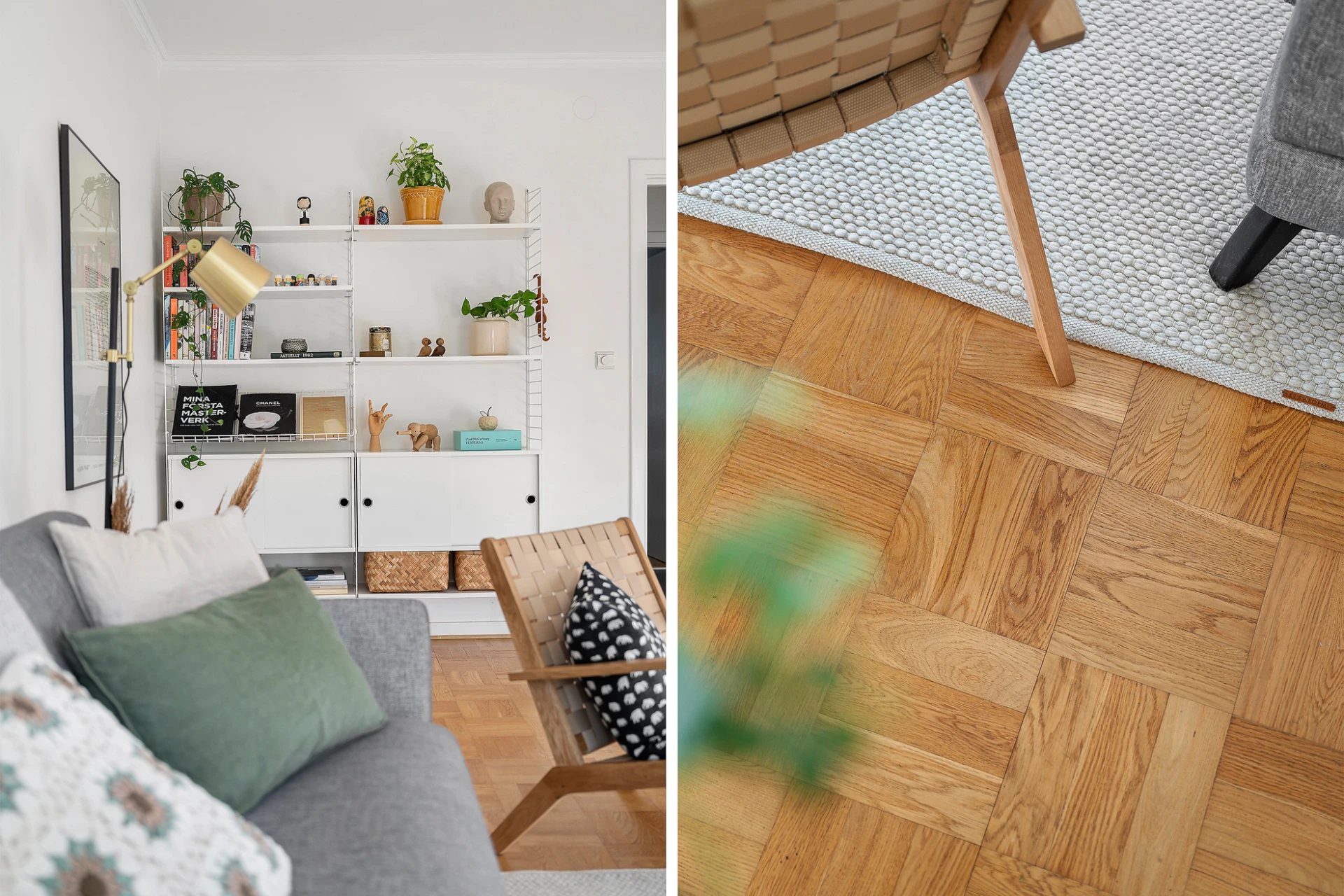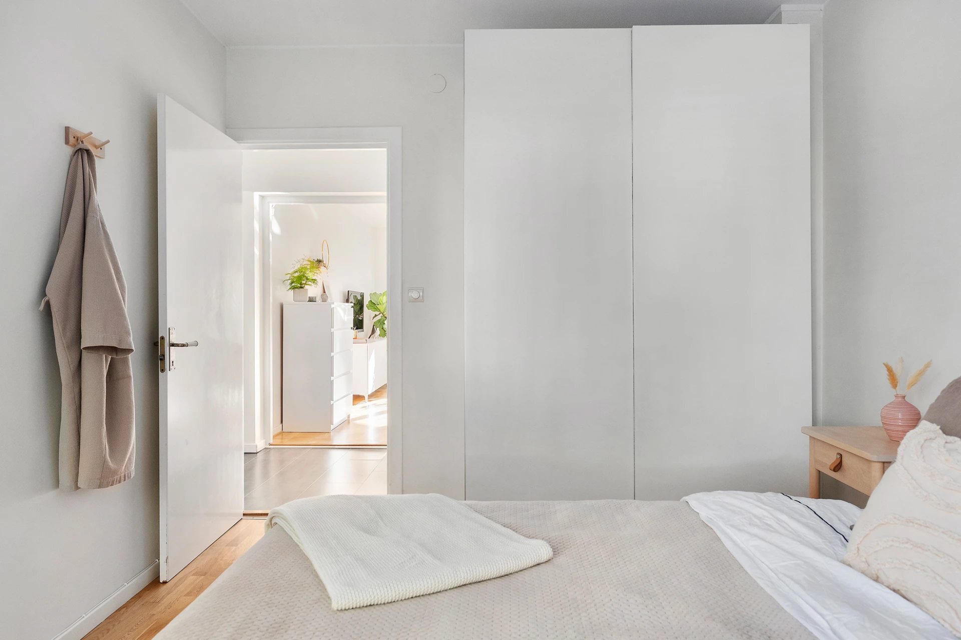 Parkettgolv och vita väggar. Förvaring i två fristående garderober.