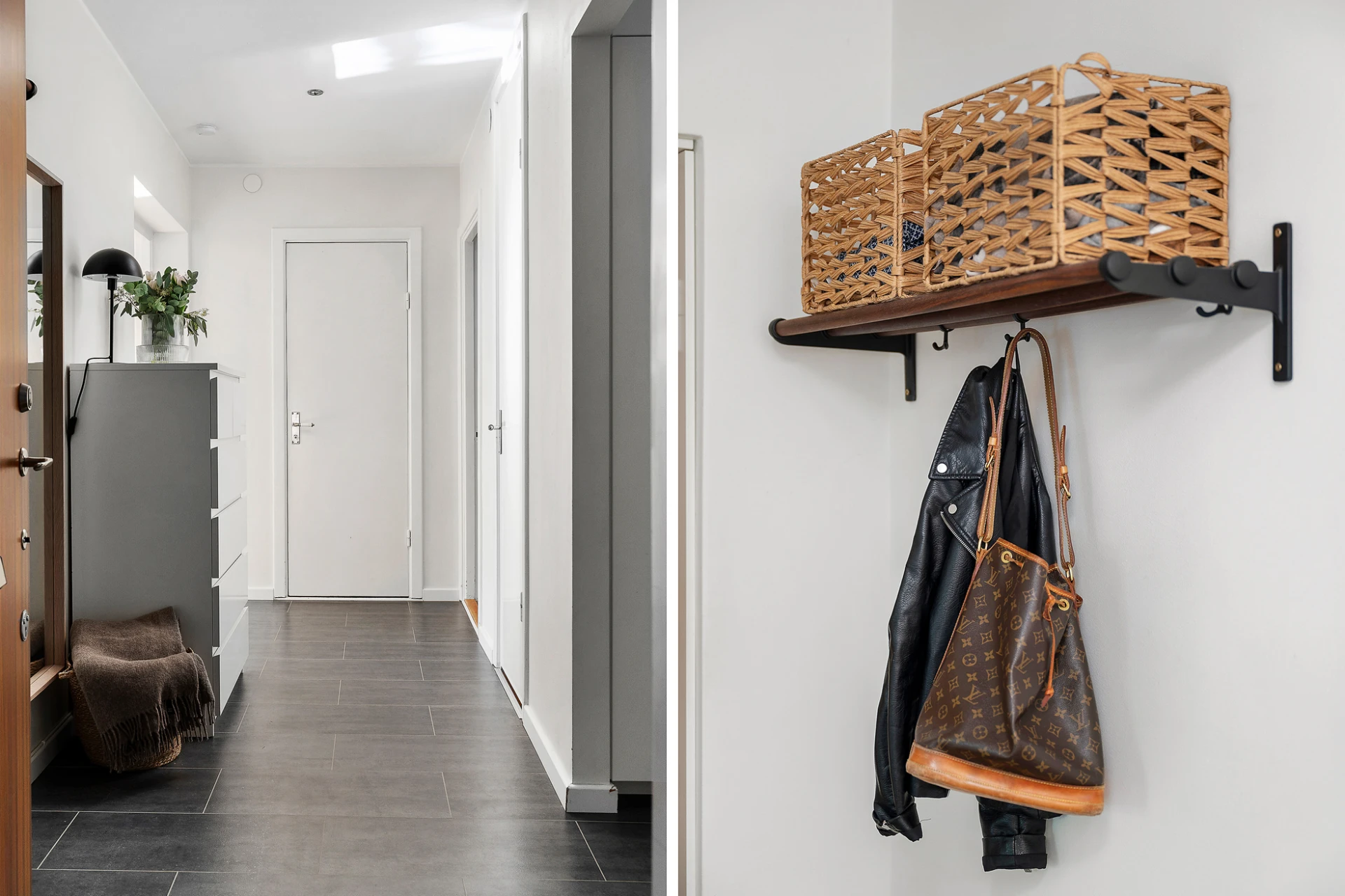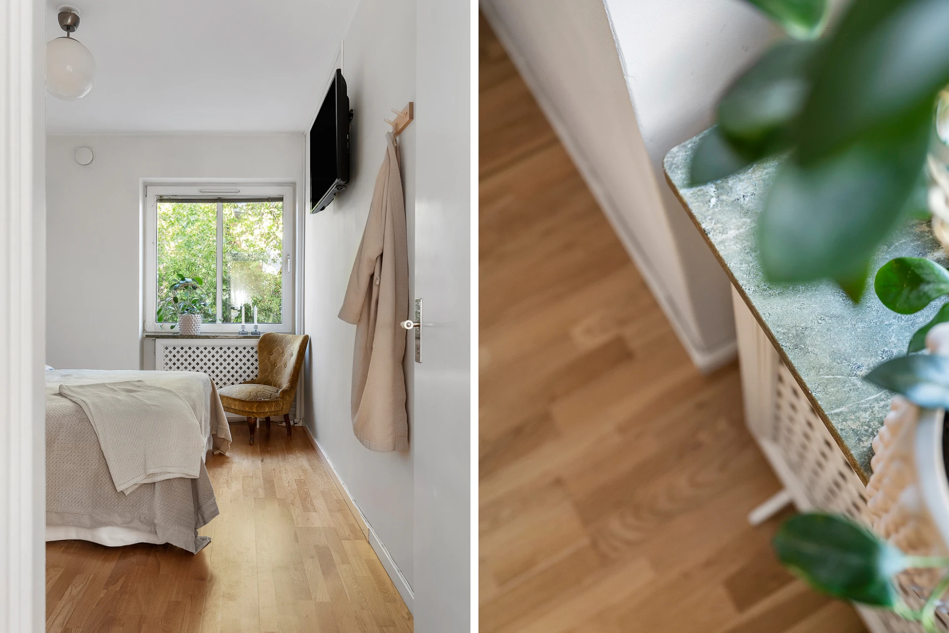 Laminatgolv och vita väggar. Goda avhängningsmöjligheter.