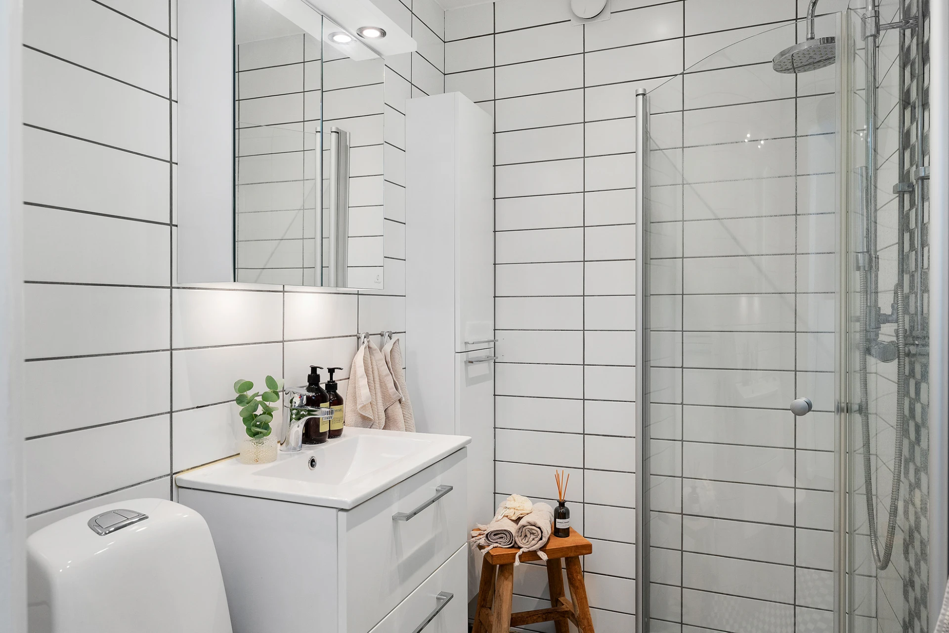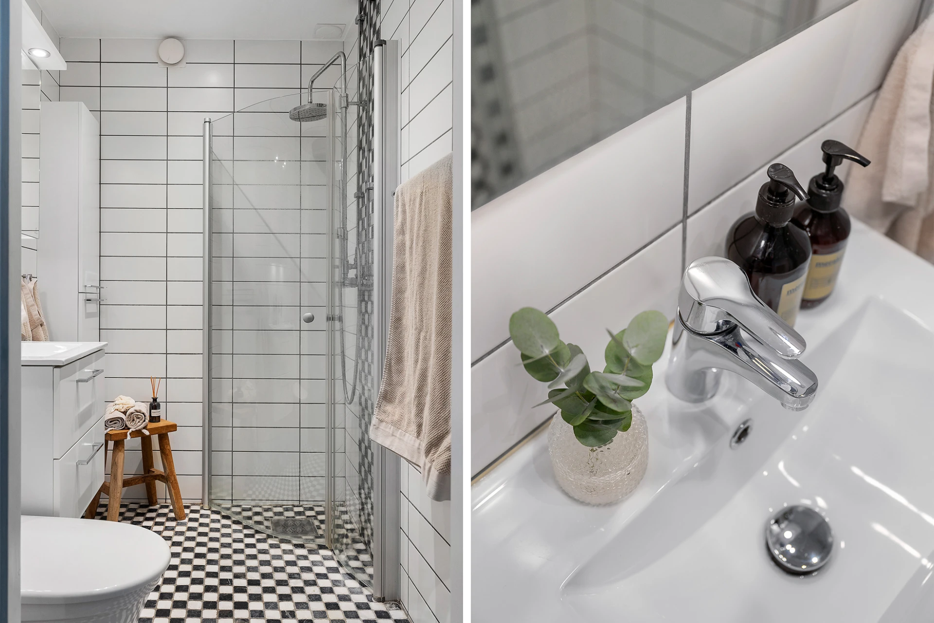 Svart/vitt klinkergolv och vita kaklade väggar. Badrummet är utrustat med WC, handfat med kommod, spegelskåp och takdusch med vikbara glasväggar.