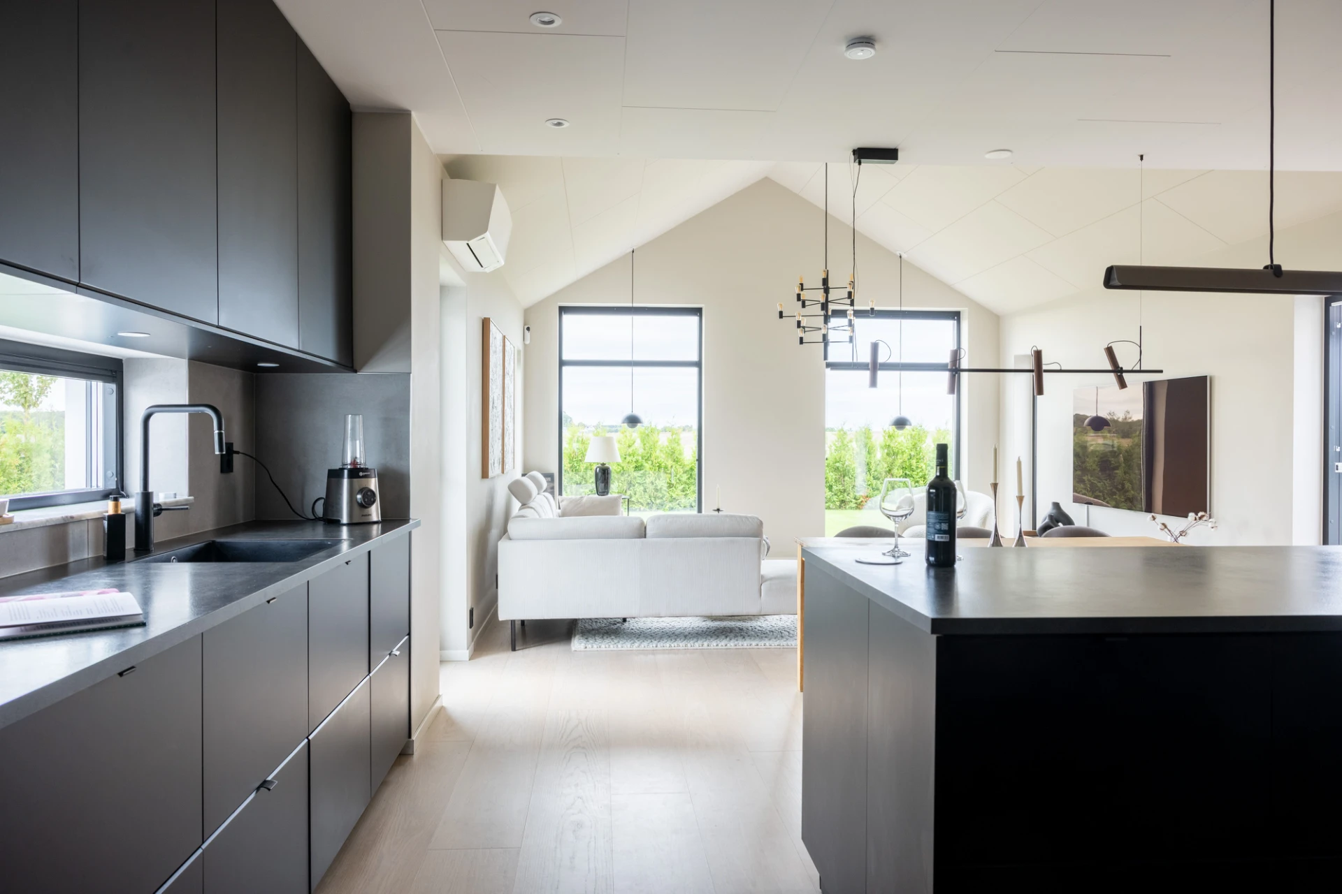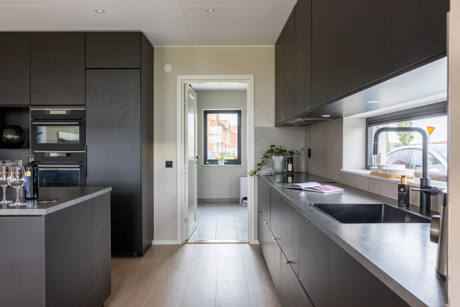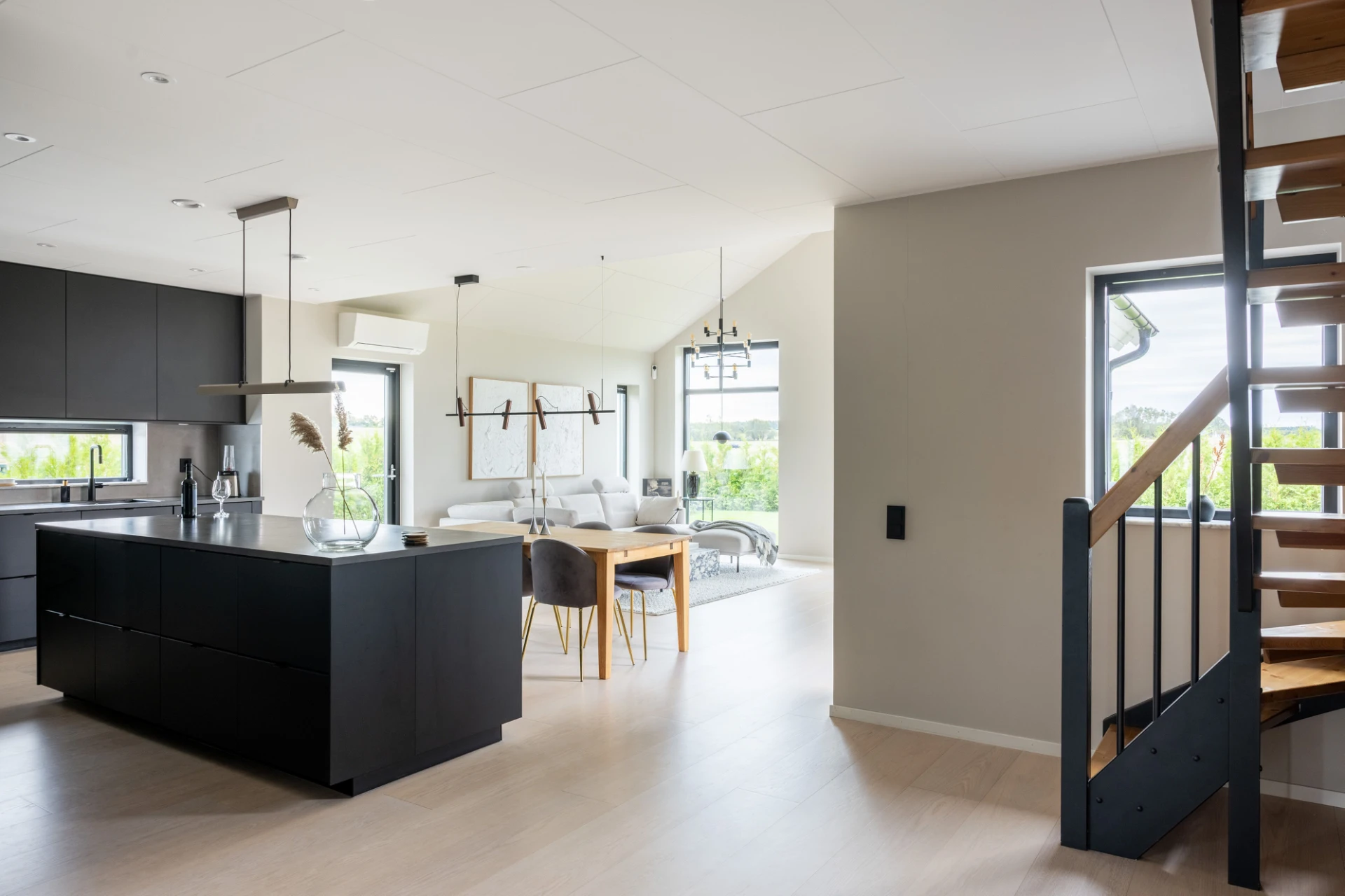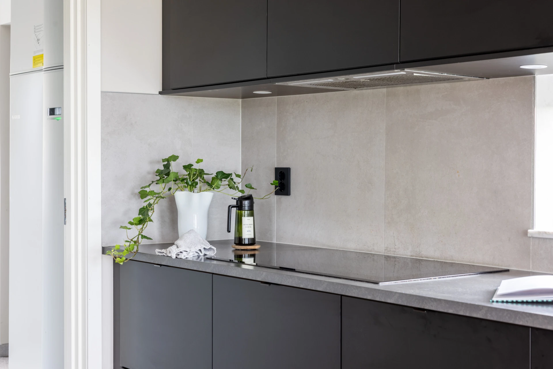 Ljus enstavs ekparkett och beige väggar. Svart matt köksinredning och ljusgrått klinker ovan grå laminat bänkskiva. Köket är utrustat med integrerad kyl och frys, inbyggd ugn, inbyggd mikrovågsugn, induktionshäll, fläkt och integrerad diskmaskin.