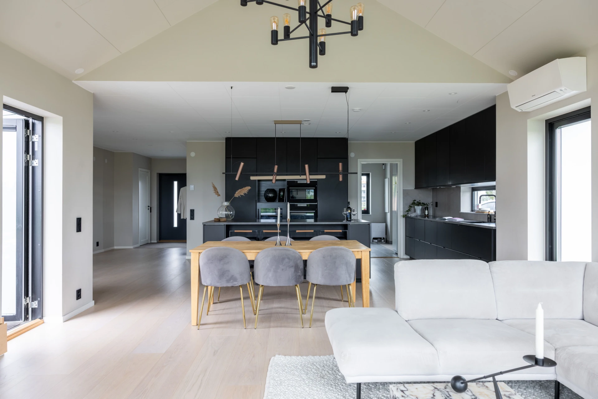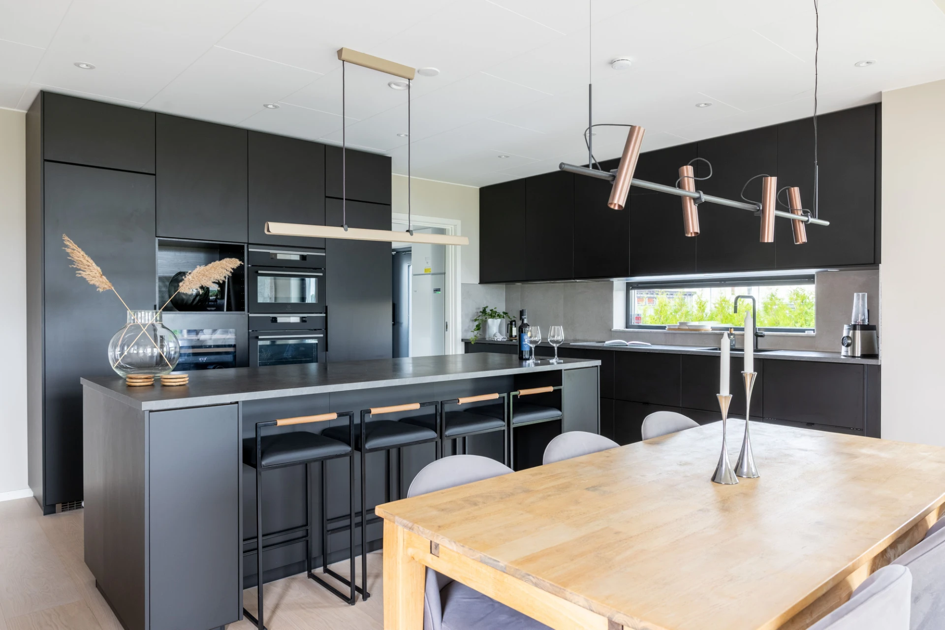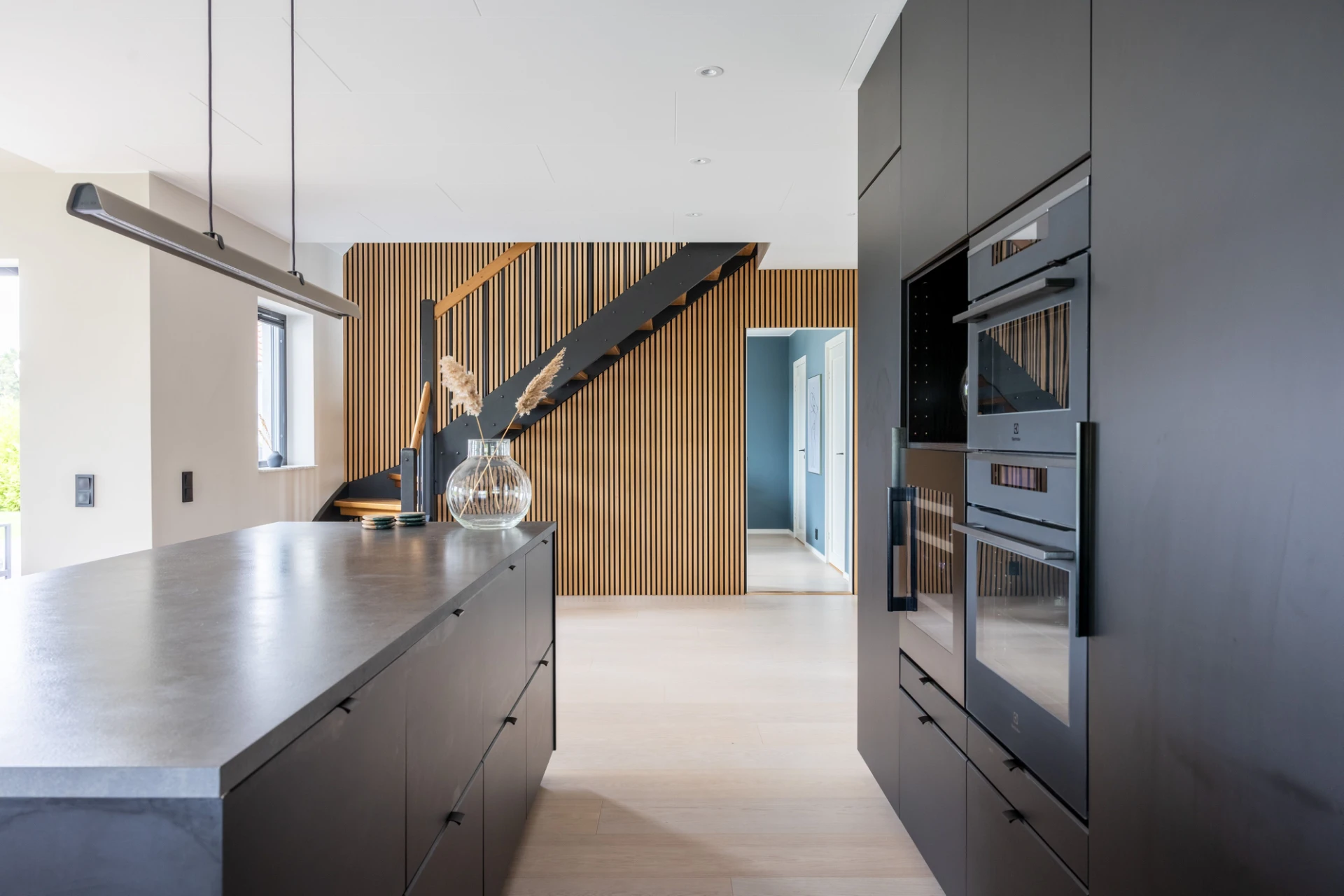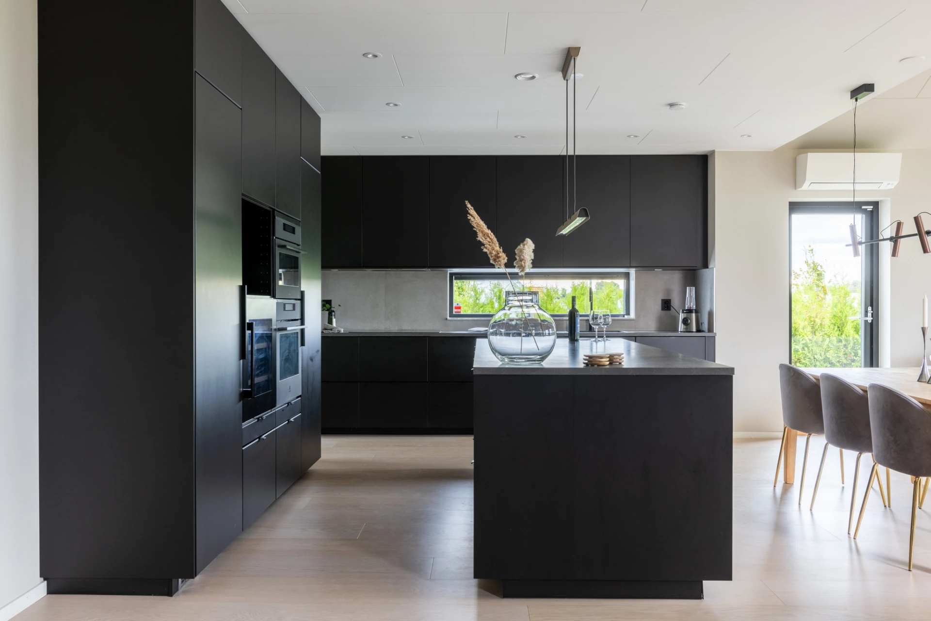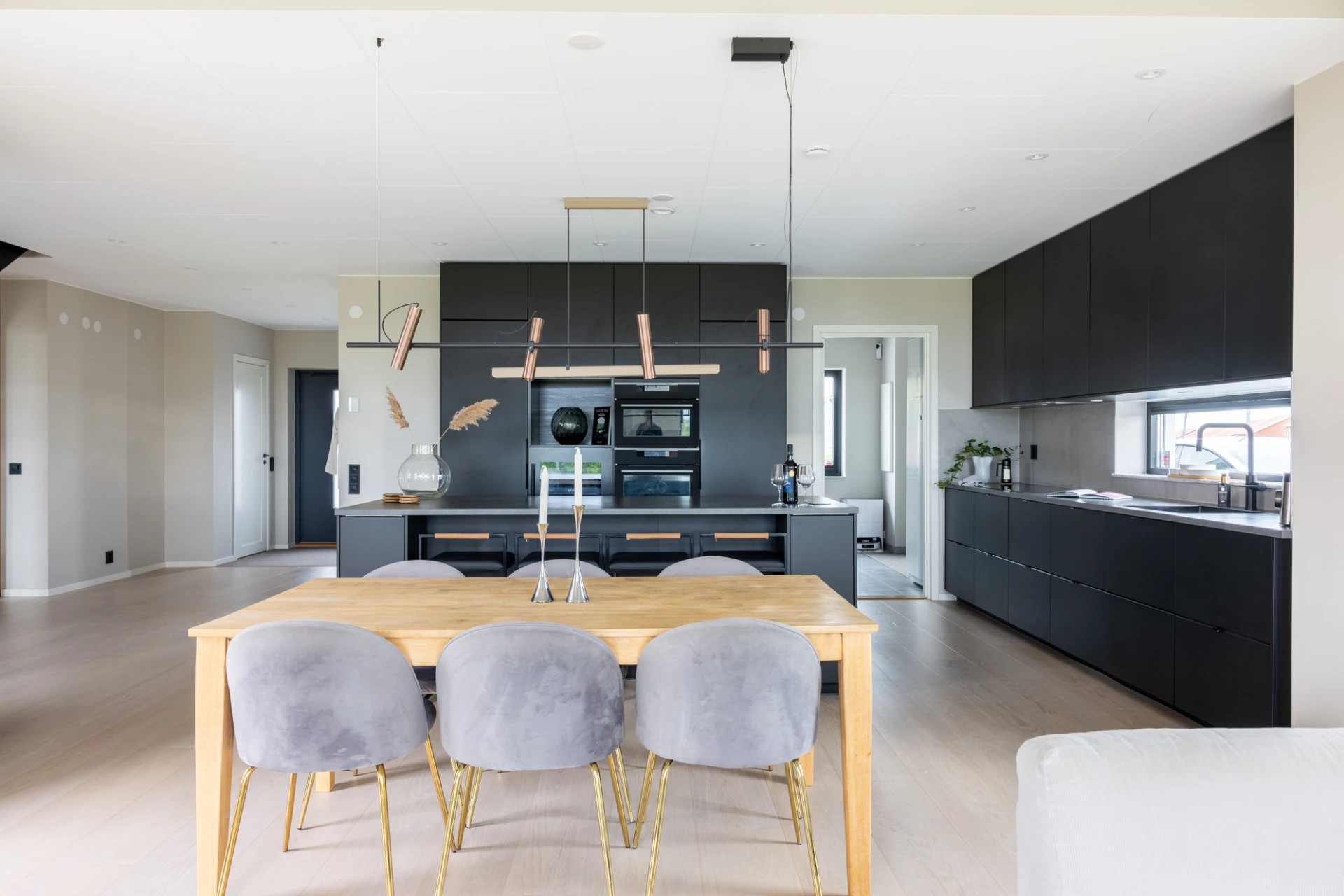 Ljus enstavs ekparkett och beige väggar. Svart matt köksinredning och ljusgrått klinker ovan grå laminat bänkskiva. Köket är utrustat med integrerad kyl och frys, inbyggd ugn, inbyggd mikrovågsugn, induktionshäll, fläkt och integrerad diskmaskin.