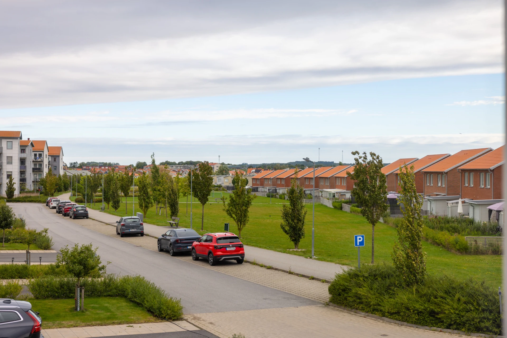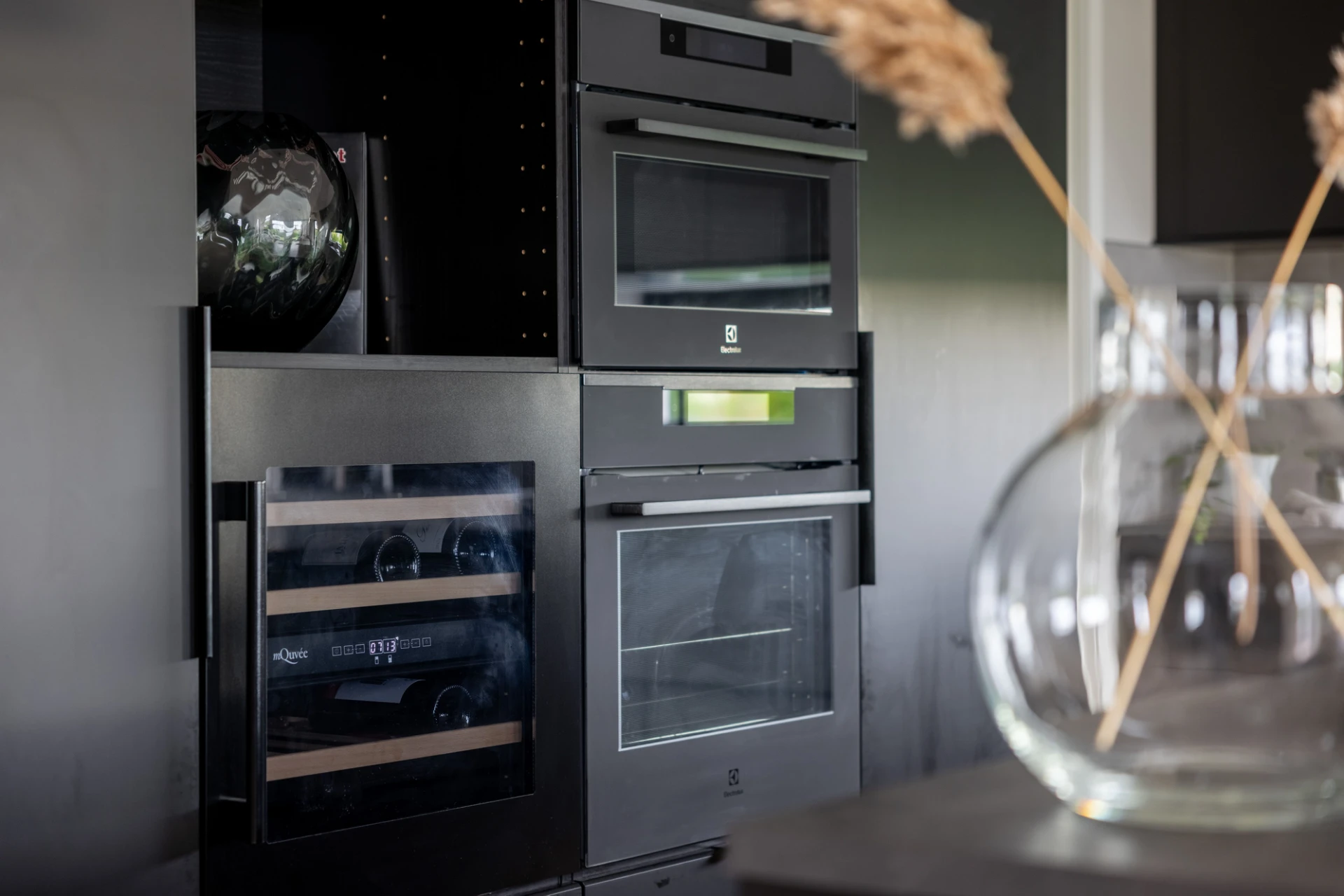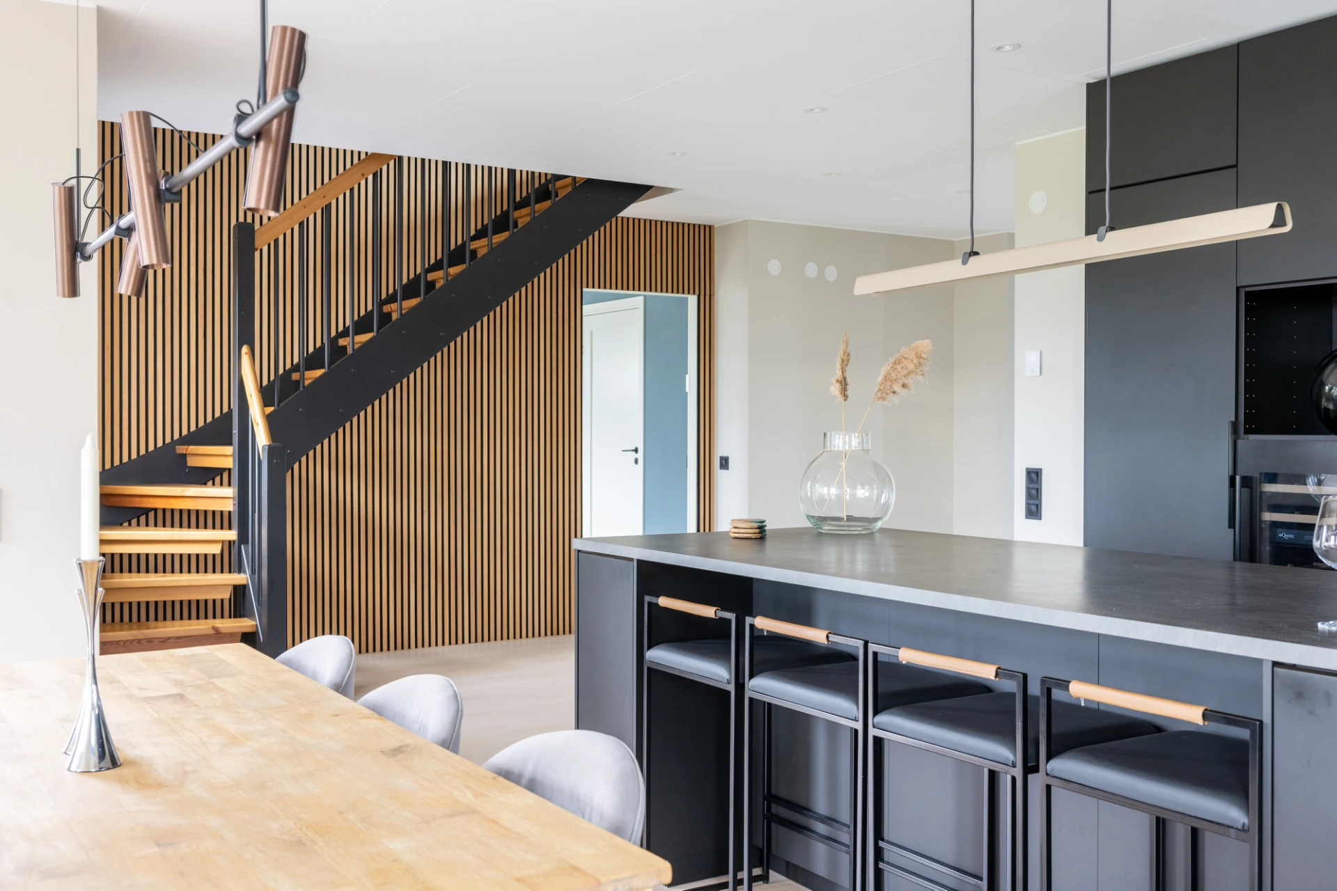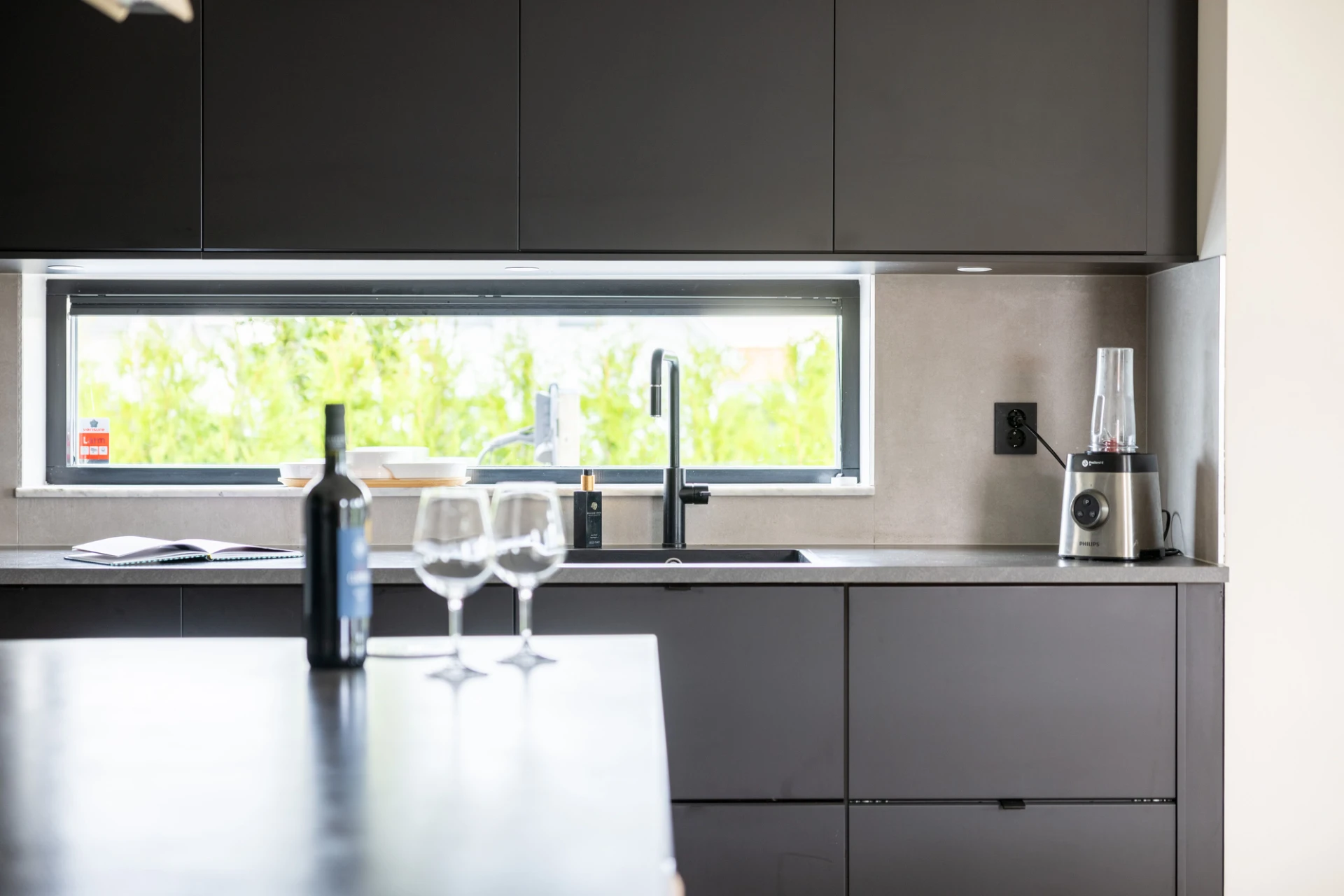 Ljus enstavs ekparkett och beige väggar. Svart matt köksinredning och ljusgrått klinker ovan grå laminat bänkskiva. Köket är utrustat med integrerad kyl och frys, inbyggd ugn, inbyggd mikrovågsugn, induktionshäll, fläkt och integrerad diskmaskin.