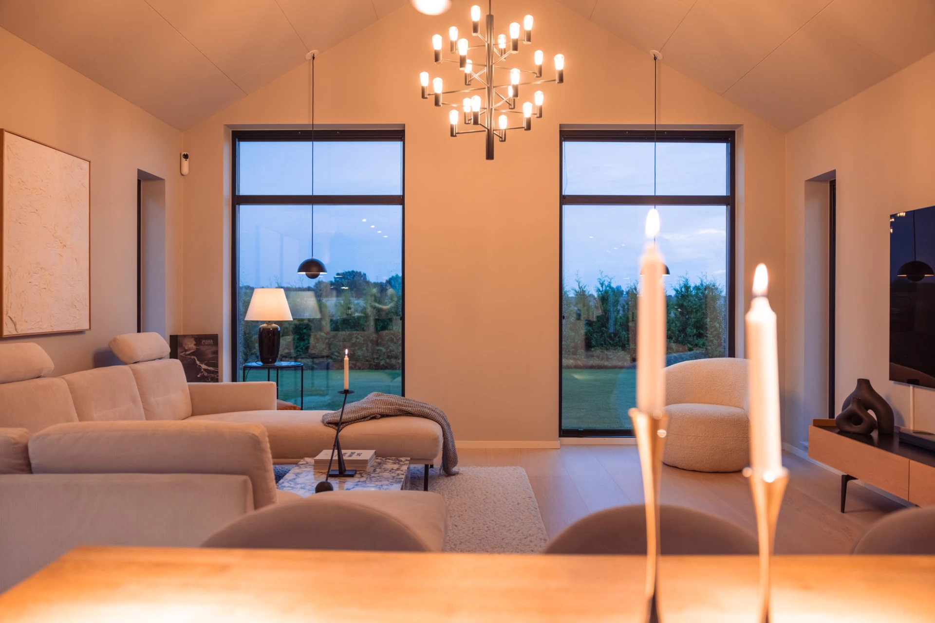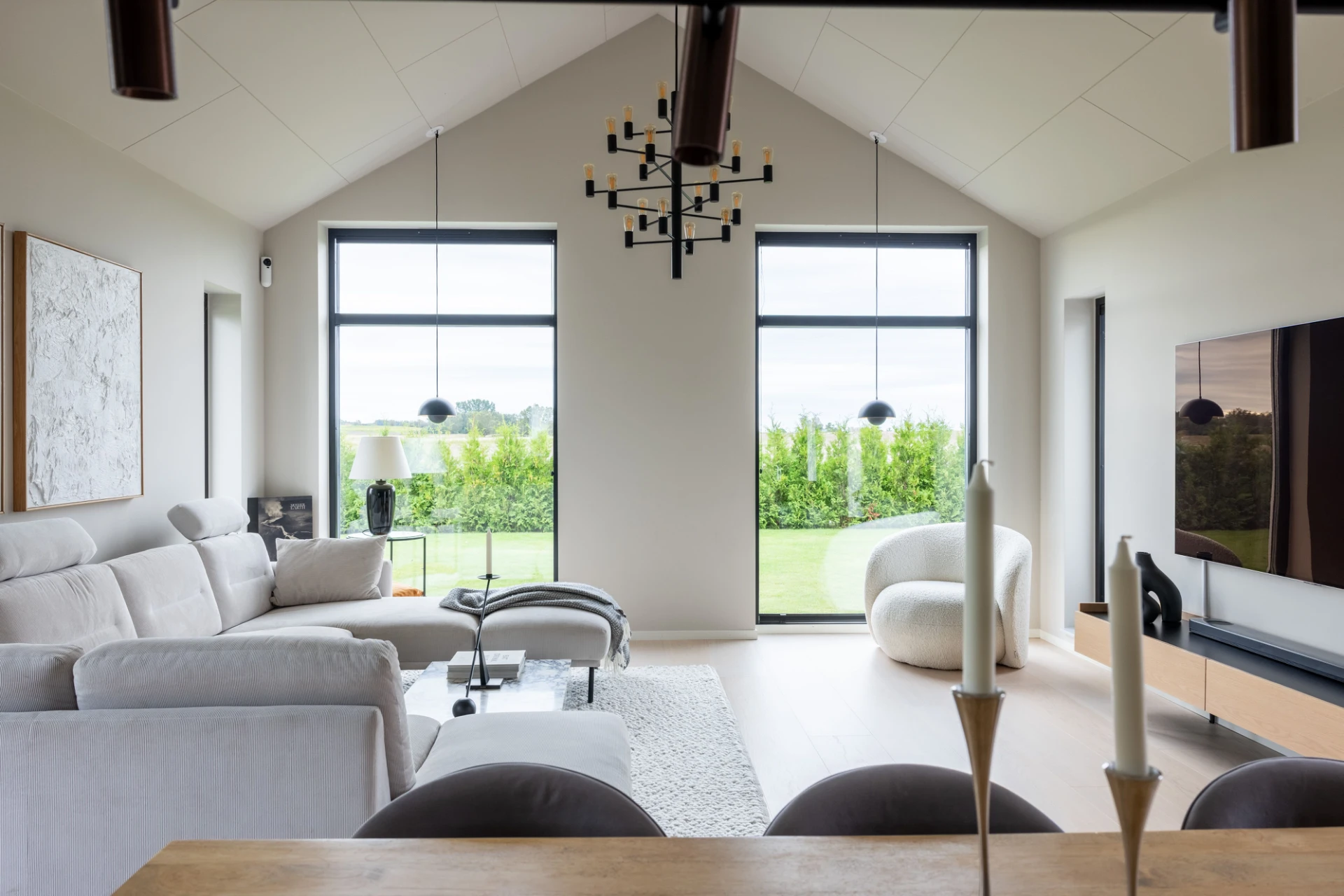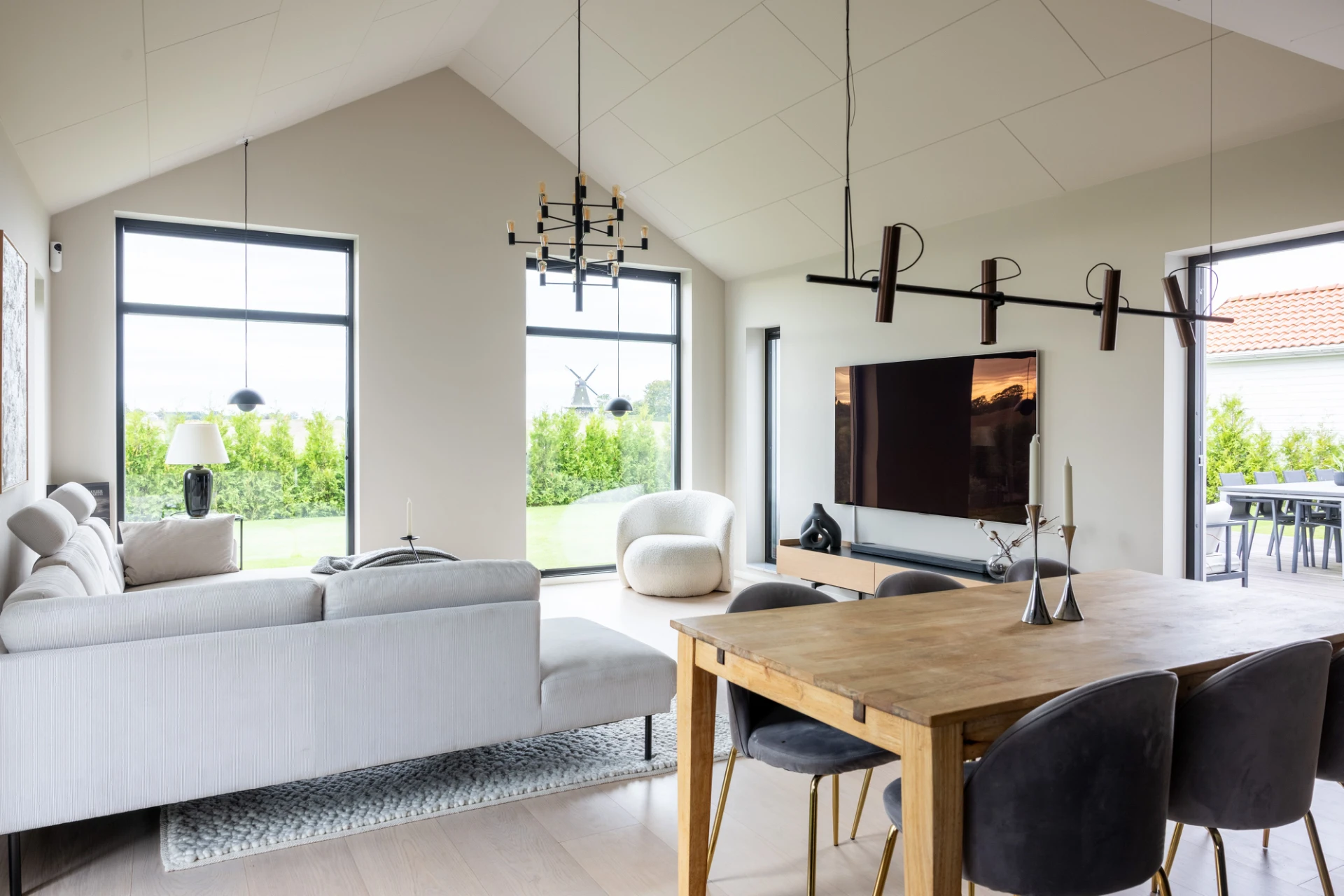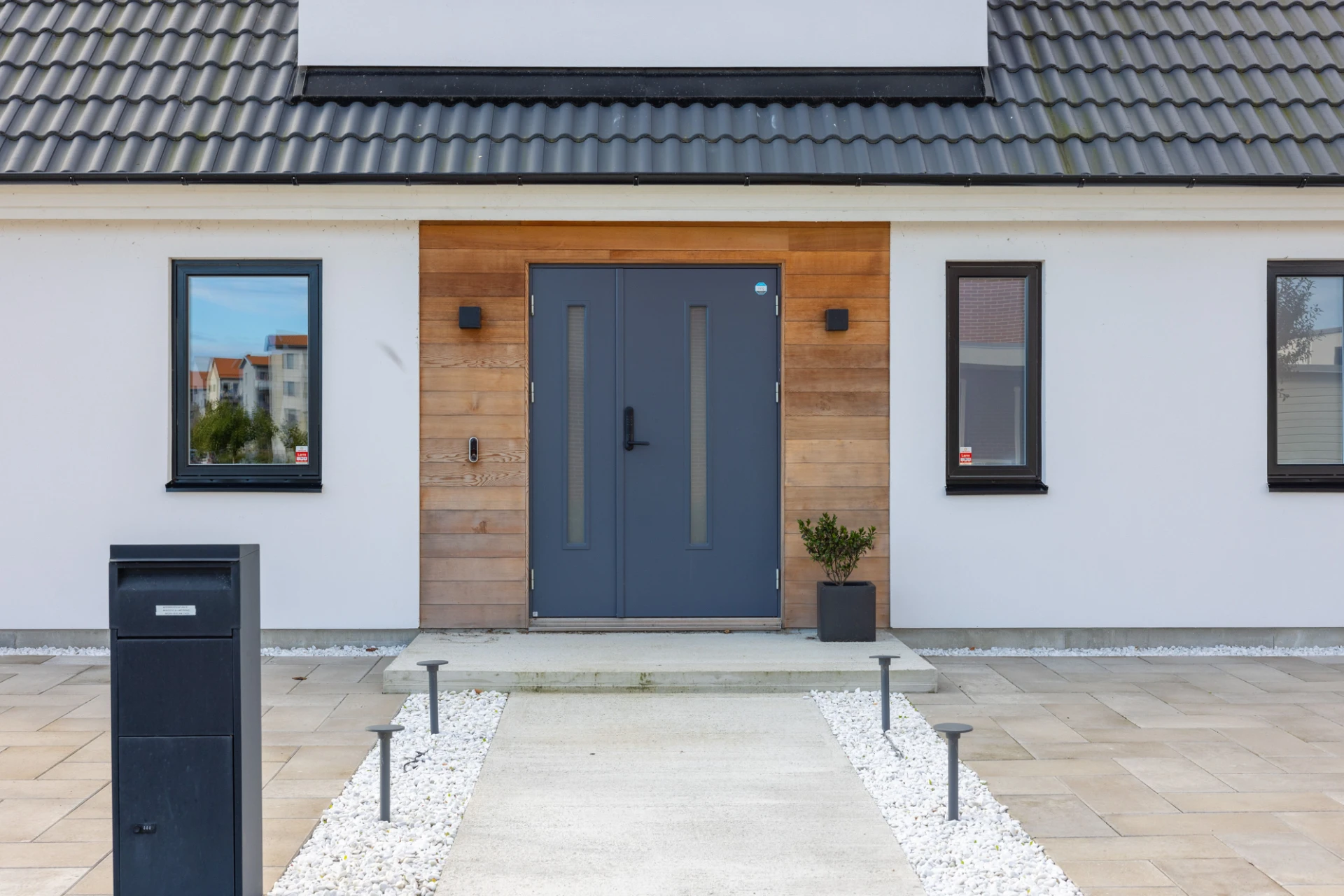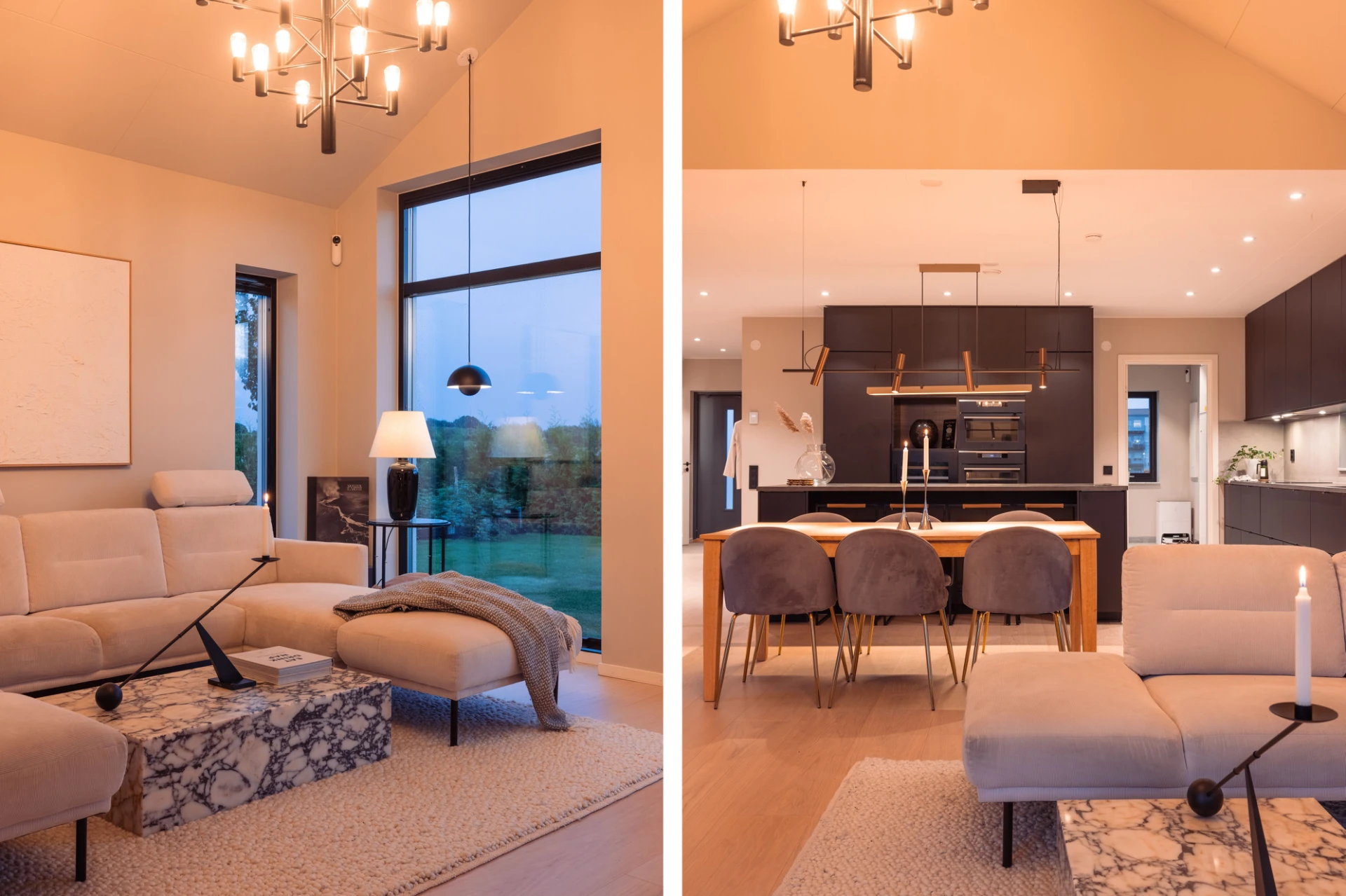 Ljus enstavs ekparkett och beige väggar. Svart matt köksinredning och ljusgrått klinker ovan grå laminat bänkskiva. Köket är utrustat med integrerad kyl och frys, inbyggd ugn, inbyggd mikrovågsugn, induktionshäll, fläkt och integrerad diskmaskin.
