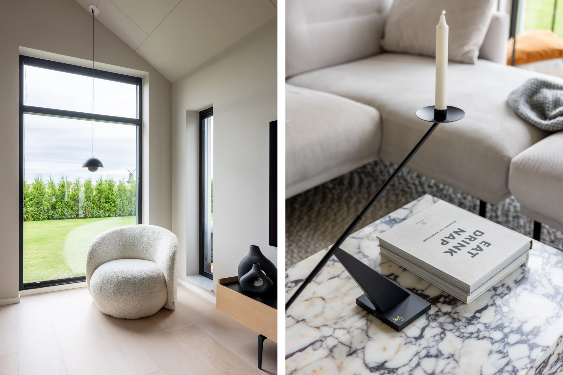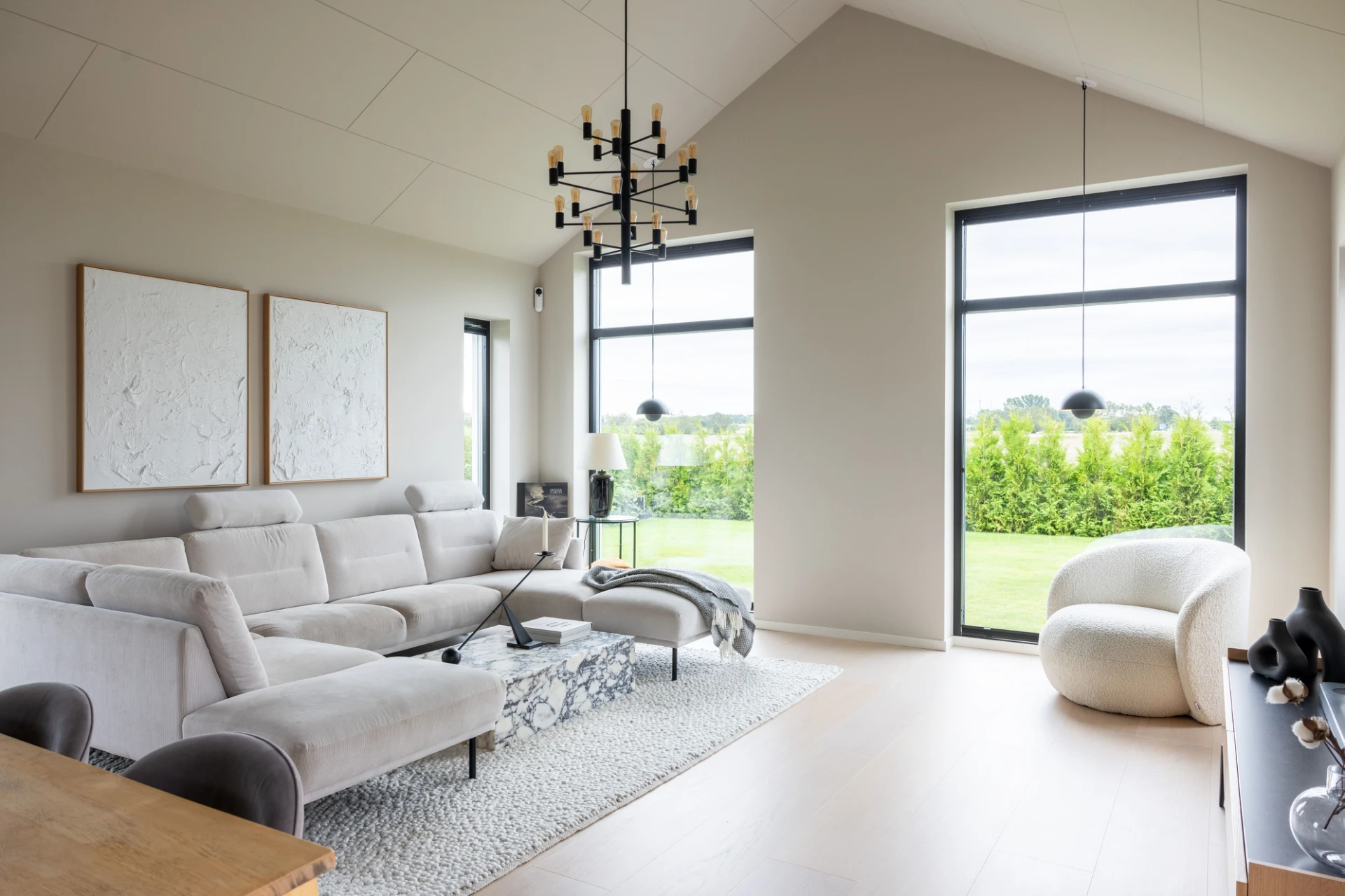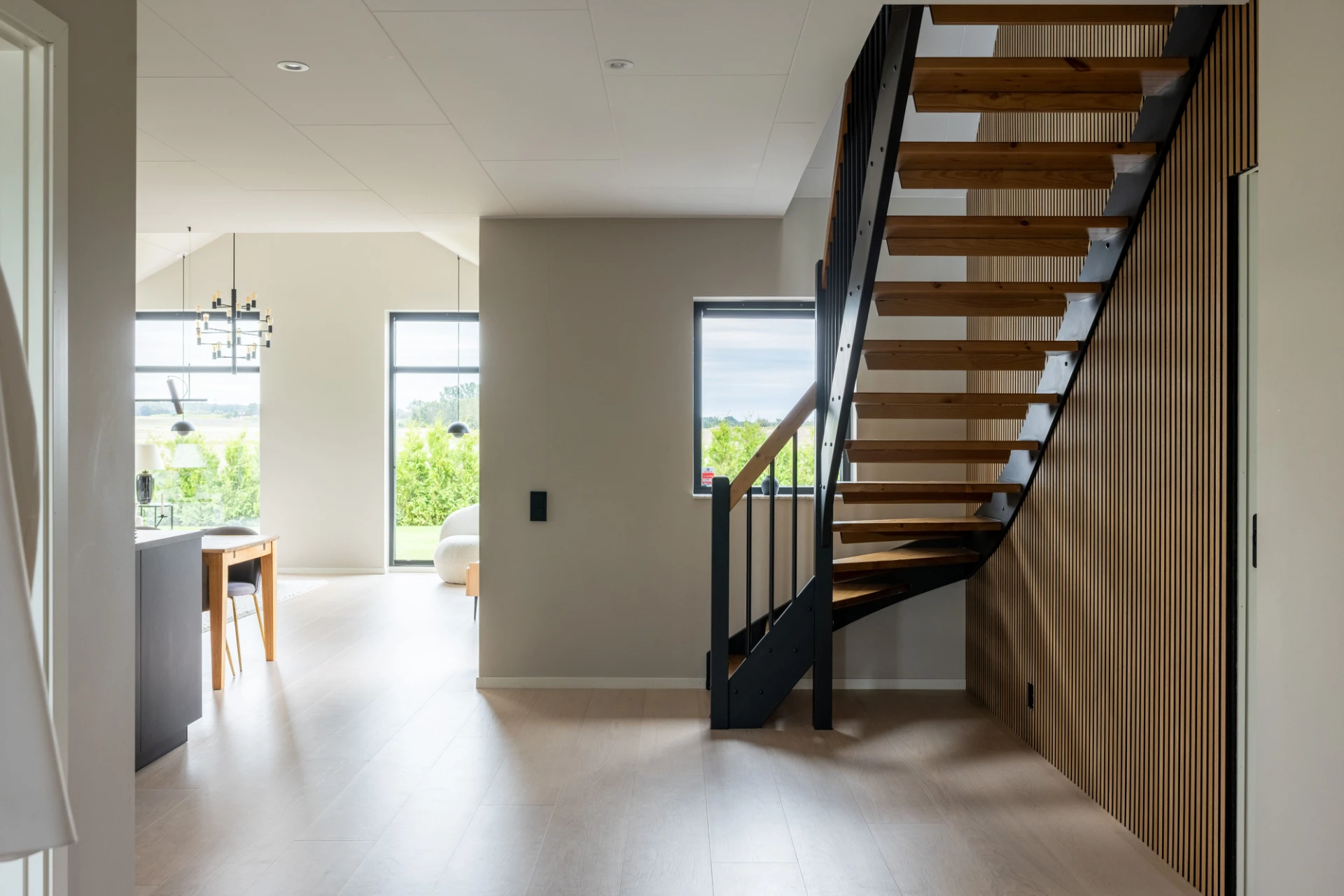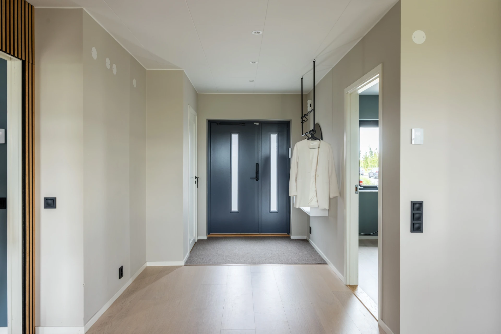 Grå klinkergolv, ljus enstavs ekparkett och beige väggar.