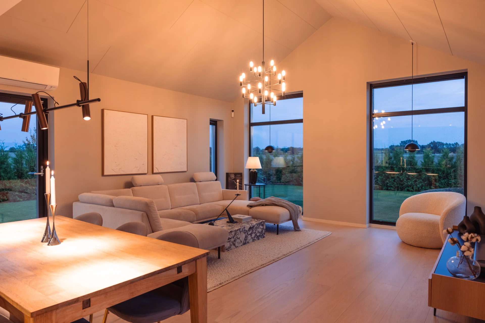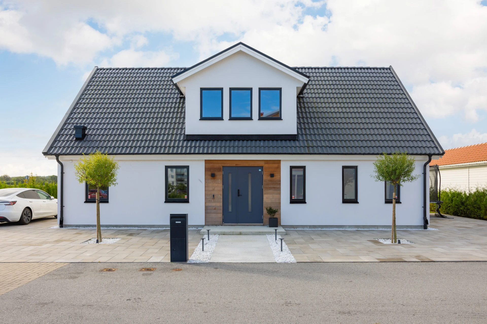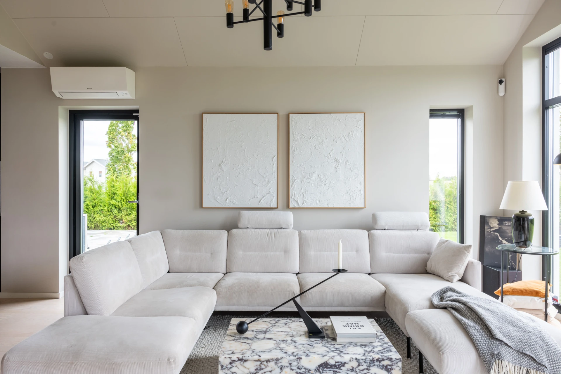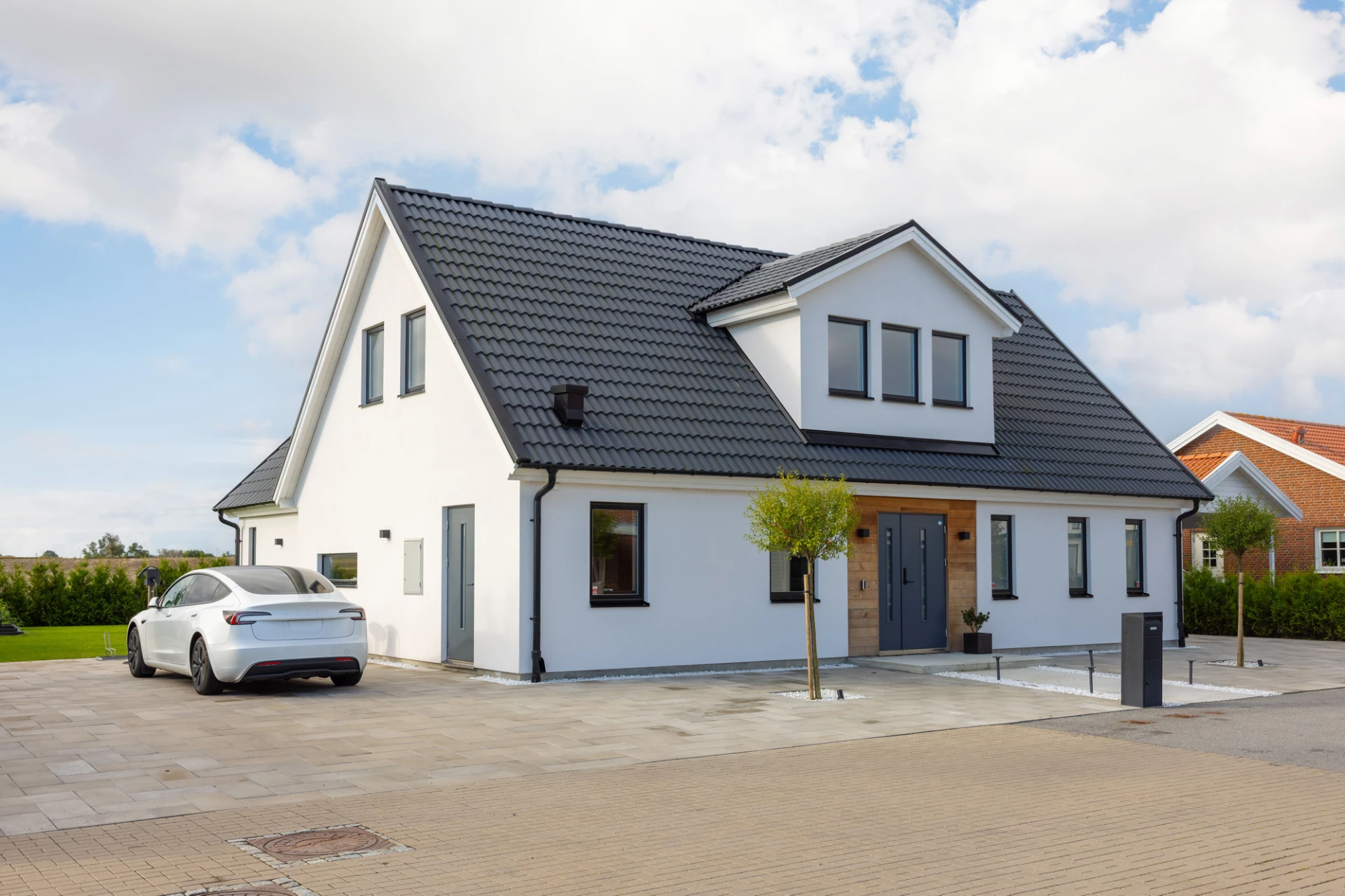 Grå klinkergolv, ljus enstavs ekparkett och beige väggar.