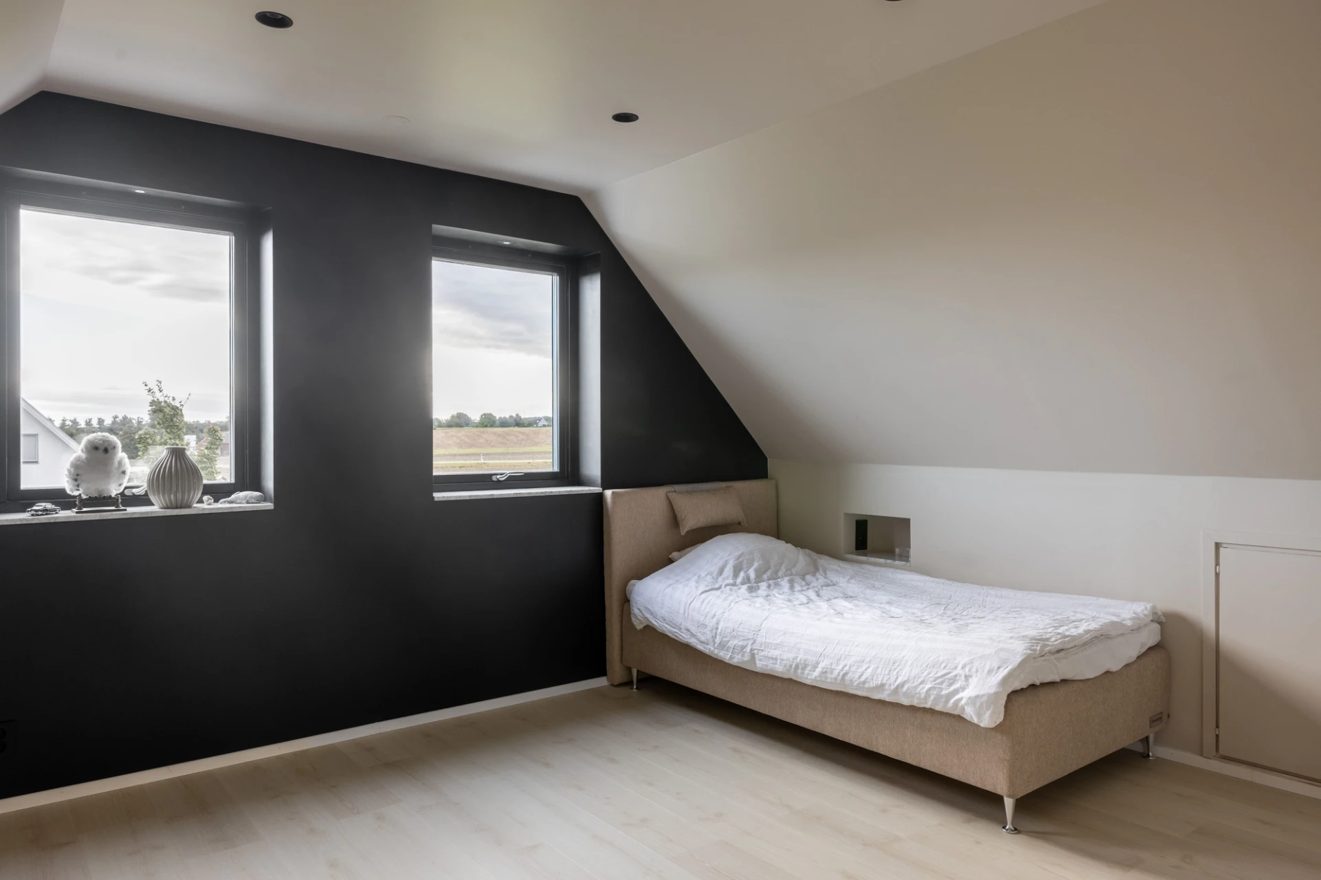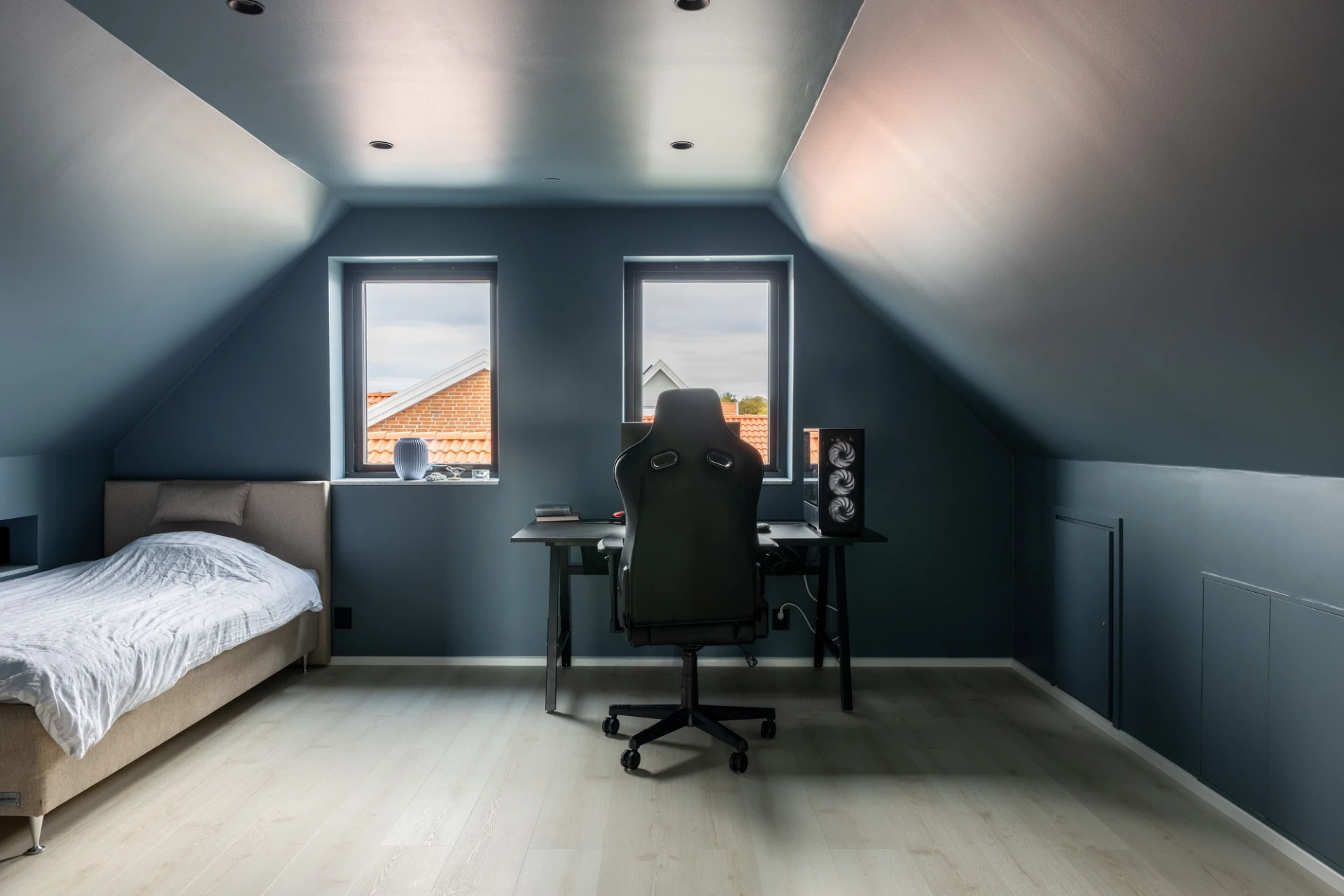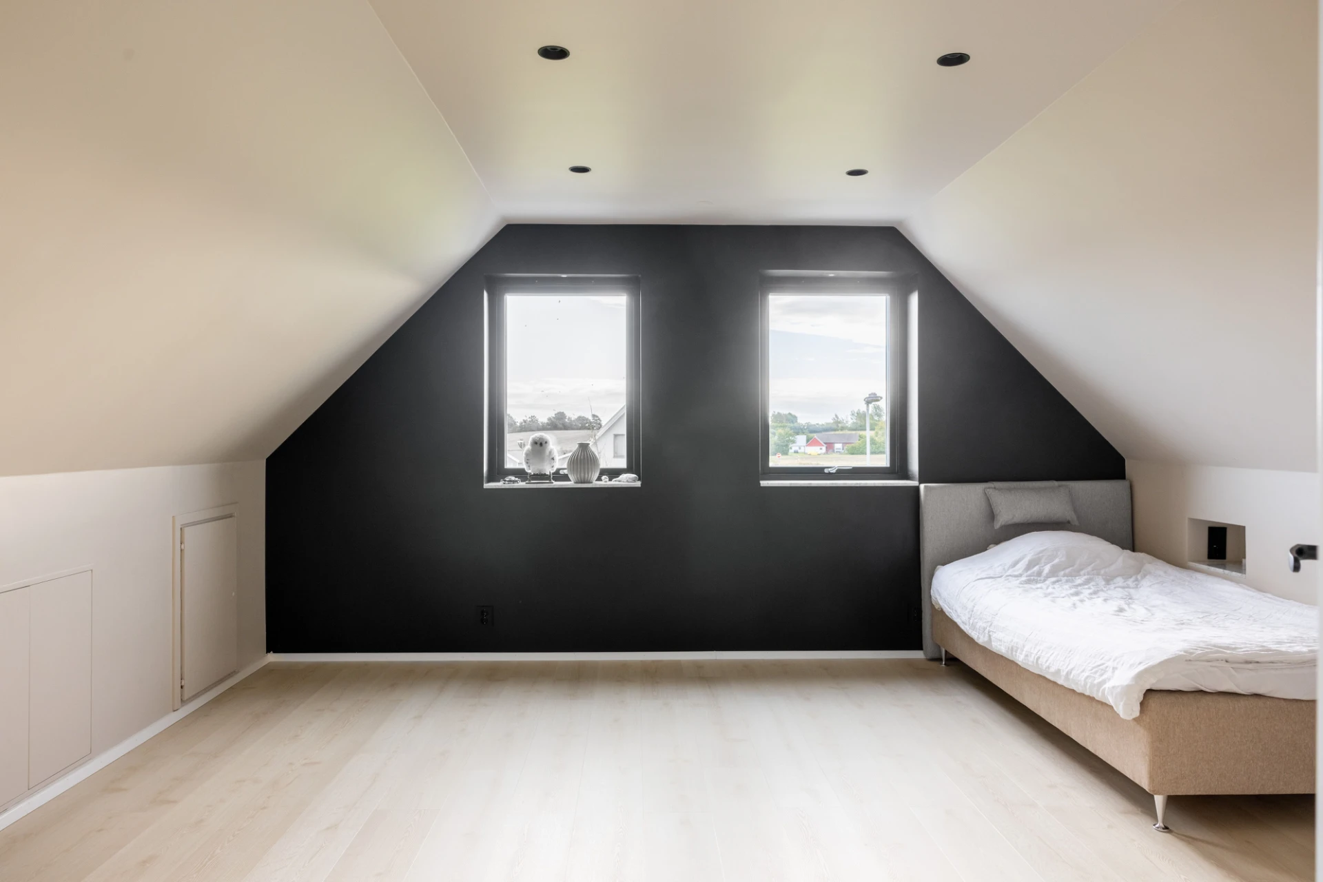 Ljus enstavs vinylgolv och beige samt svarta väggar. Förvaring i hyllor samt skåp i kattvind.