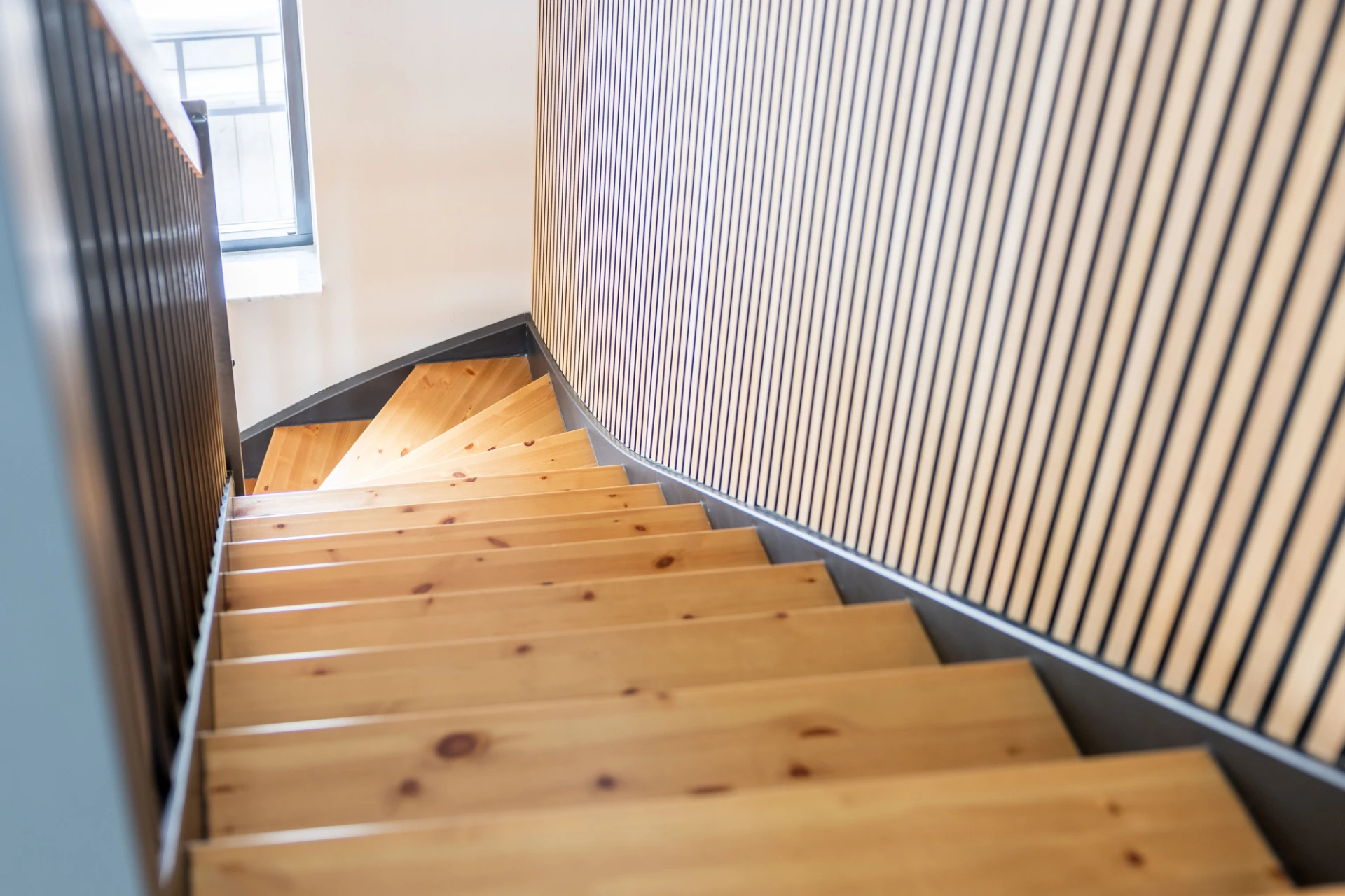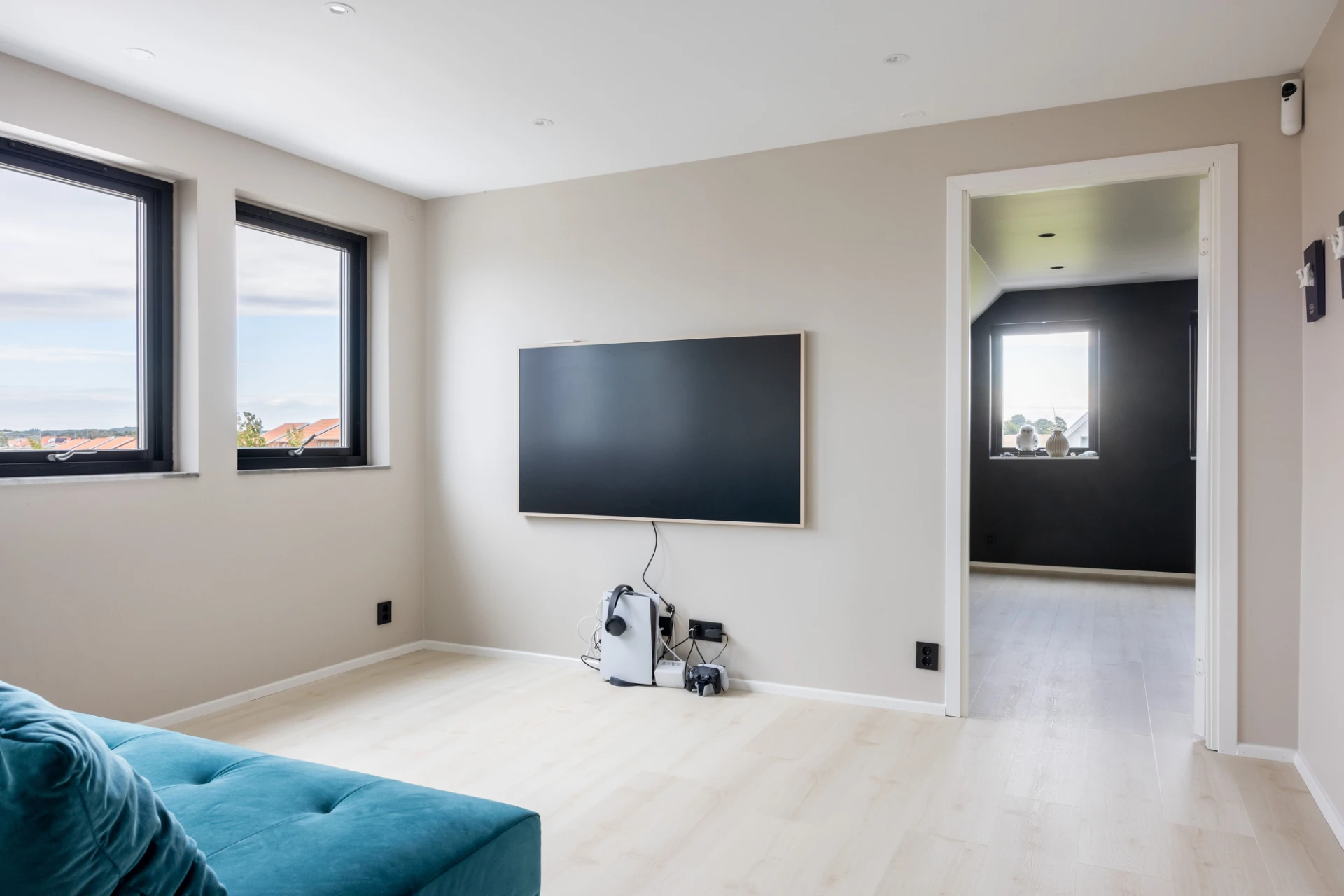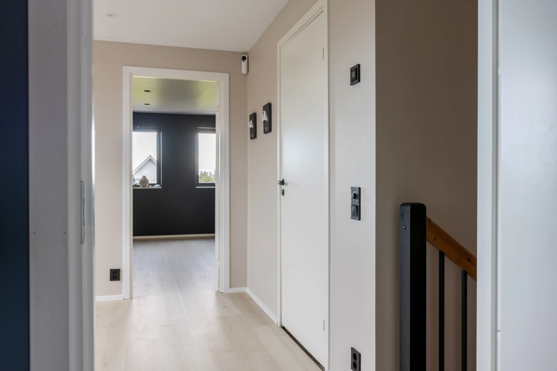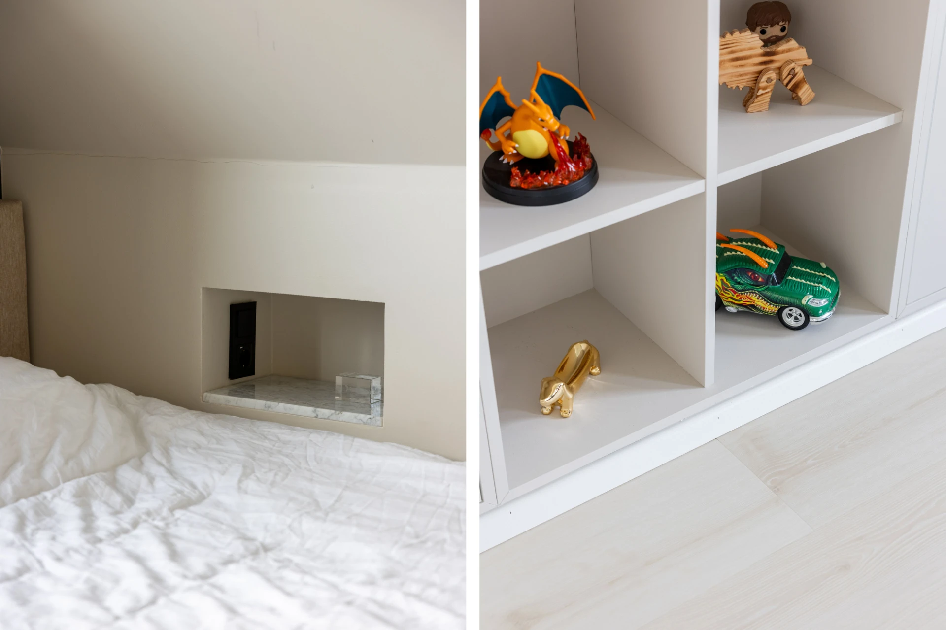 Ljus enstavs vinylgolv och beige samt svarta väggar. Förvaring i hyllor samt skåp i kattvind.