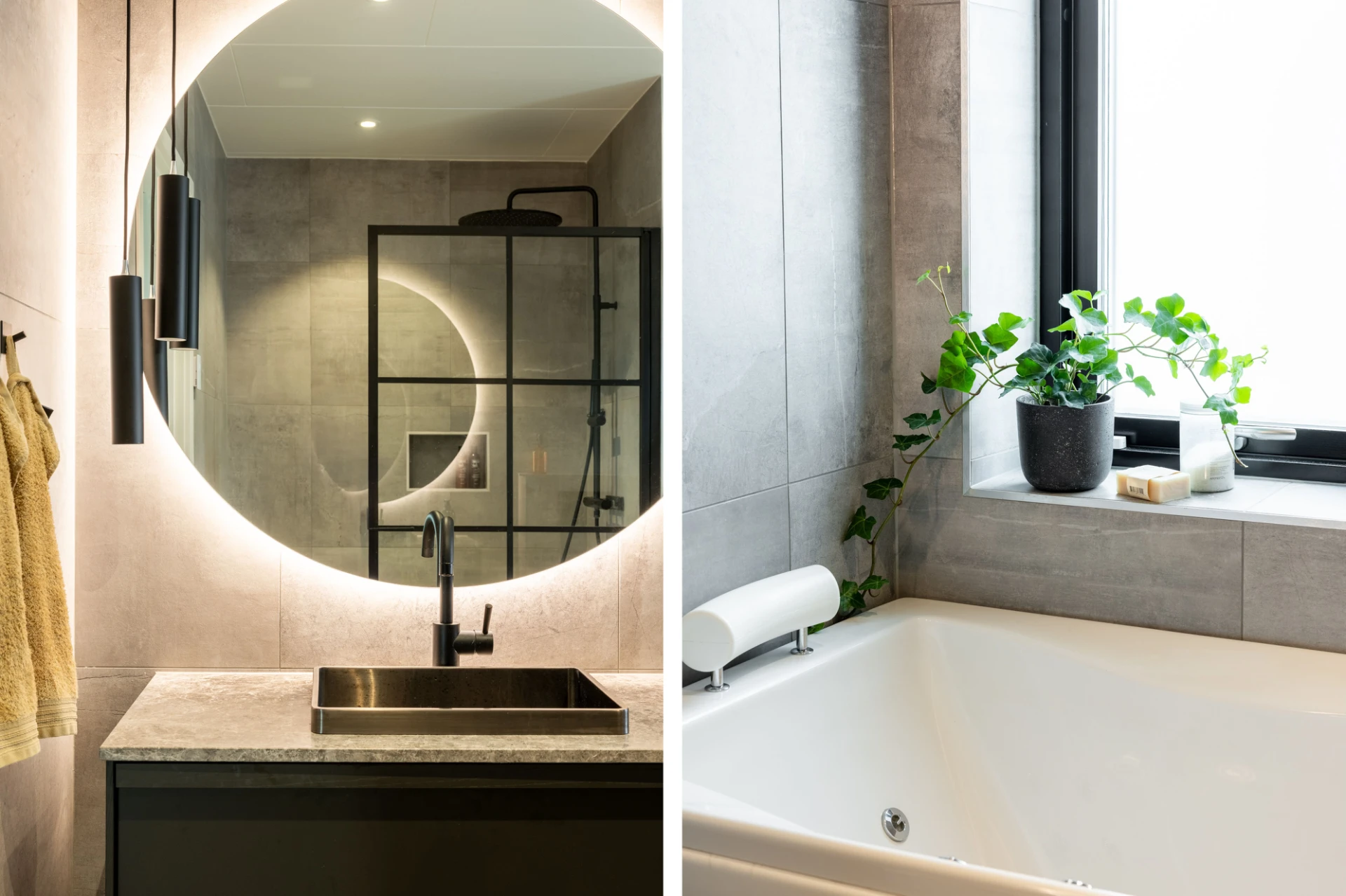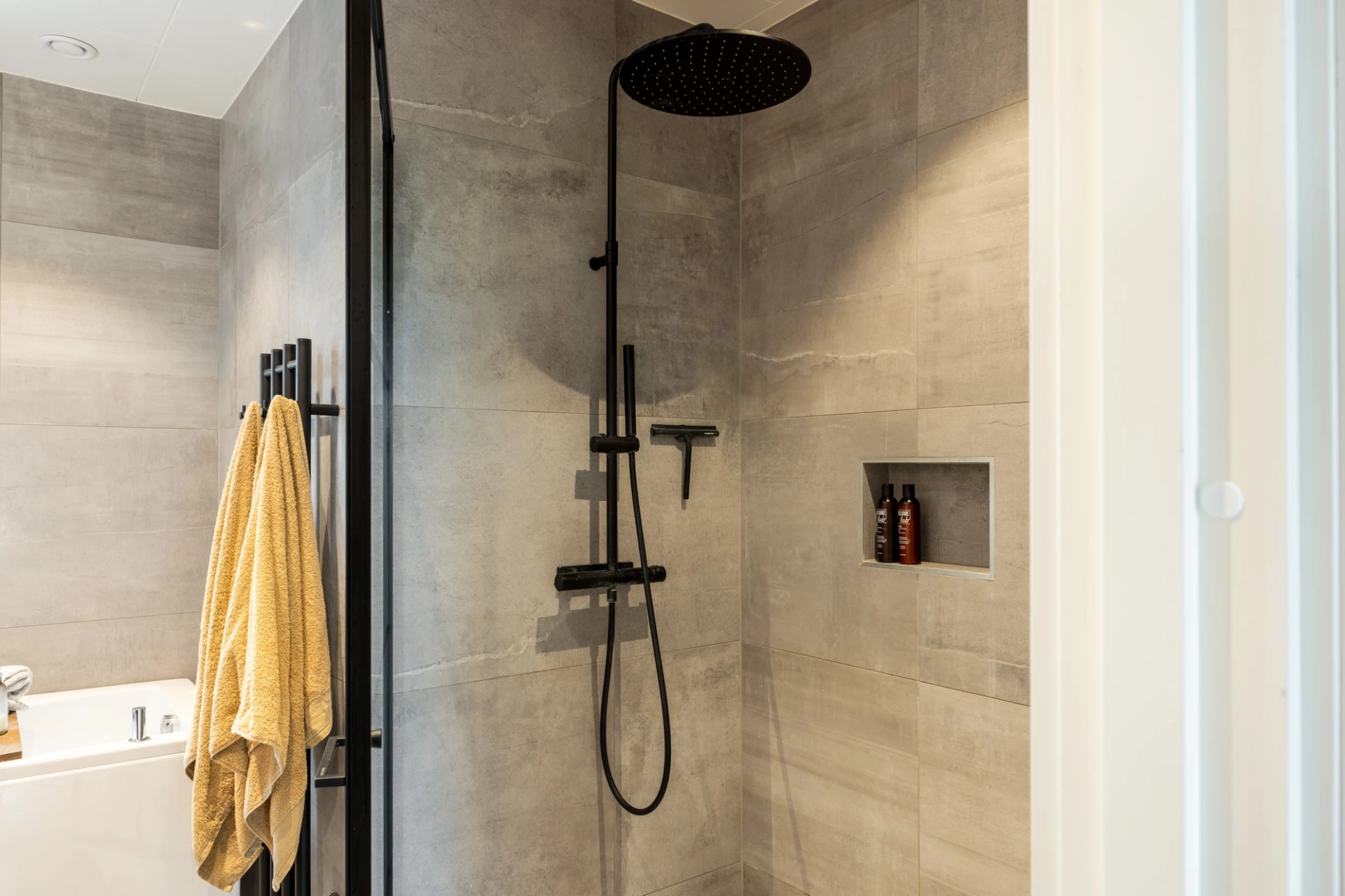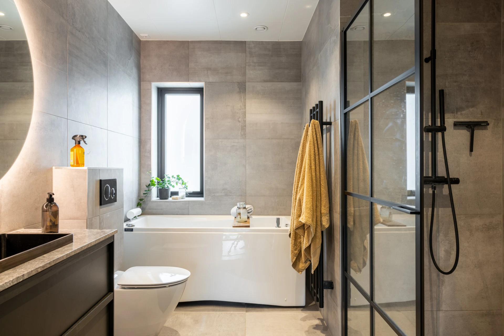 Helkaklat i grå nyans. Badrummet är utrustat med vägghängd WC, handfat med kommod, spegel, takdusch med vikbara glasväggar, spabad och handdukstork. Här finns även golvvärme (vattenburen).