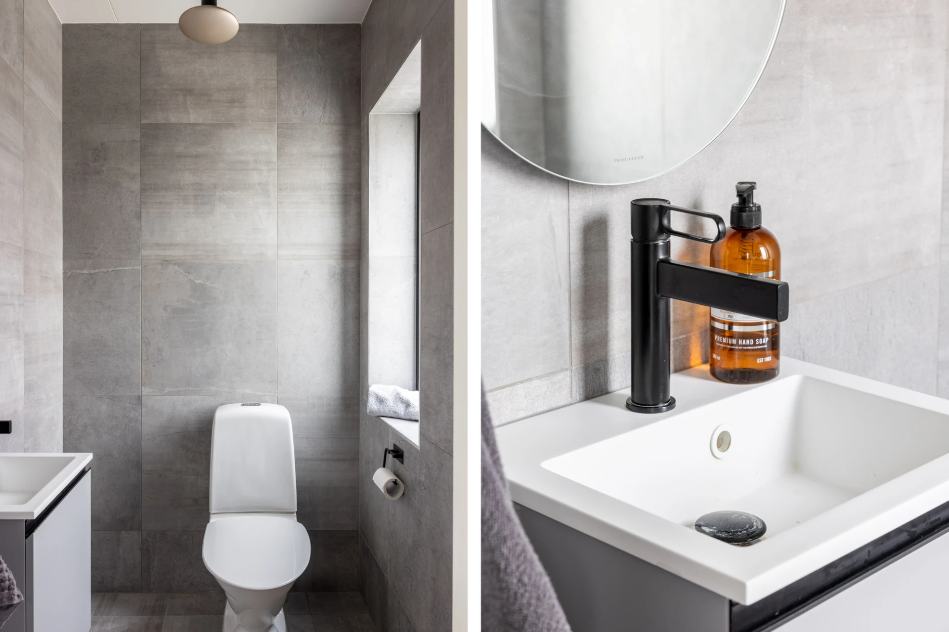 Helkaklat i grå nyans. Toaletten är utrustad med WC, handfat med kommod och spegel.