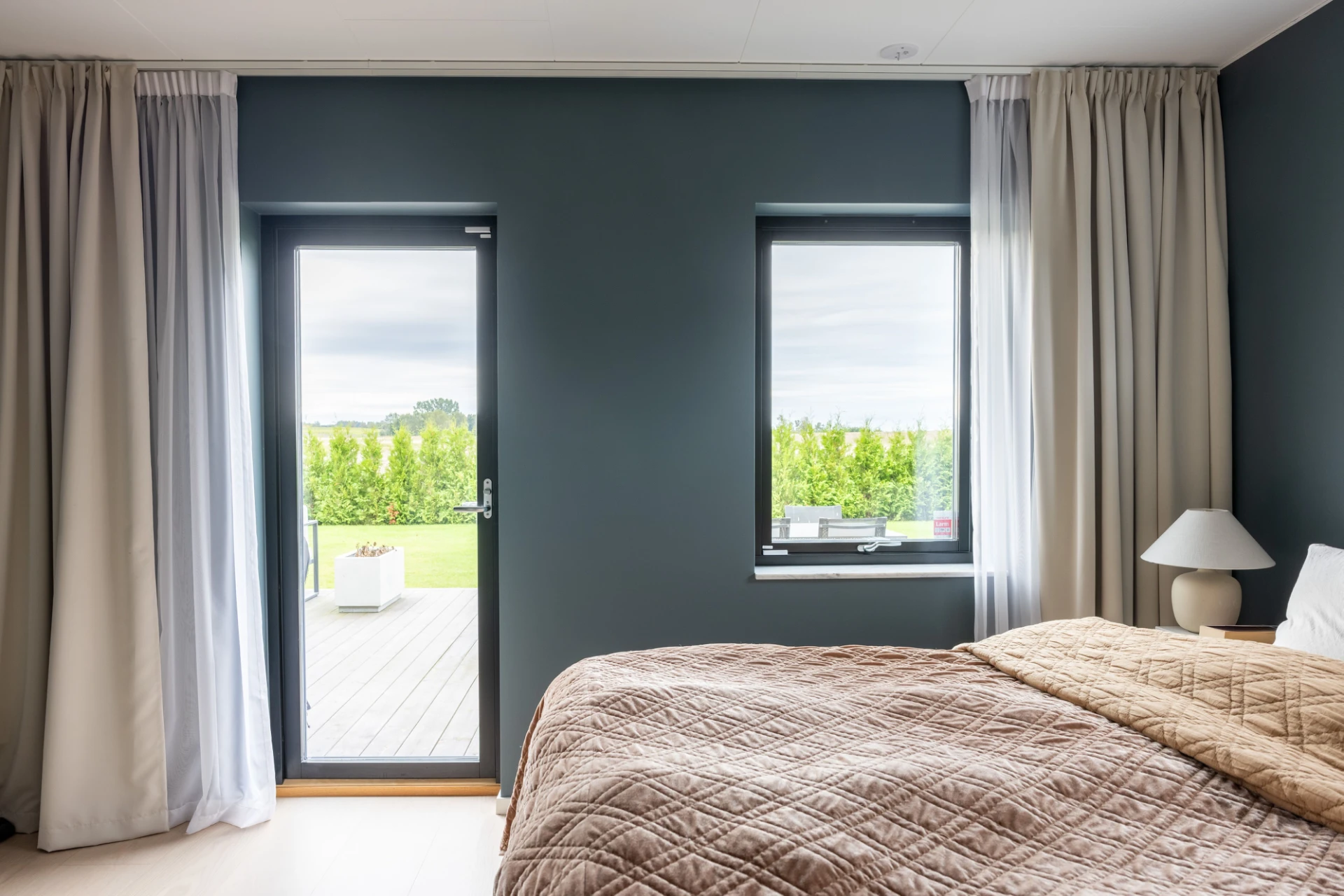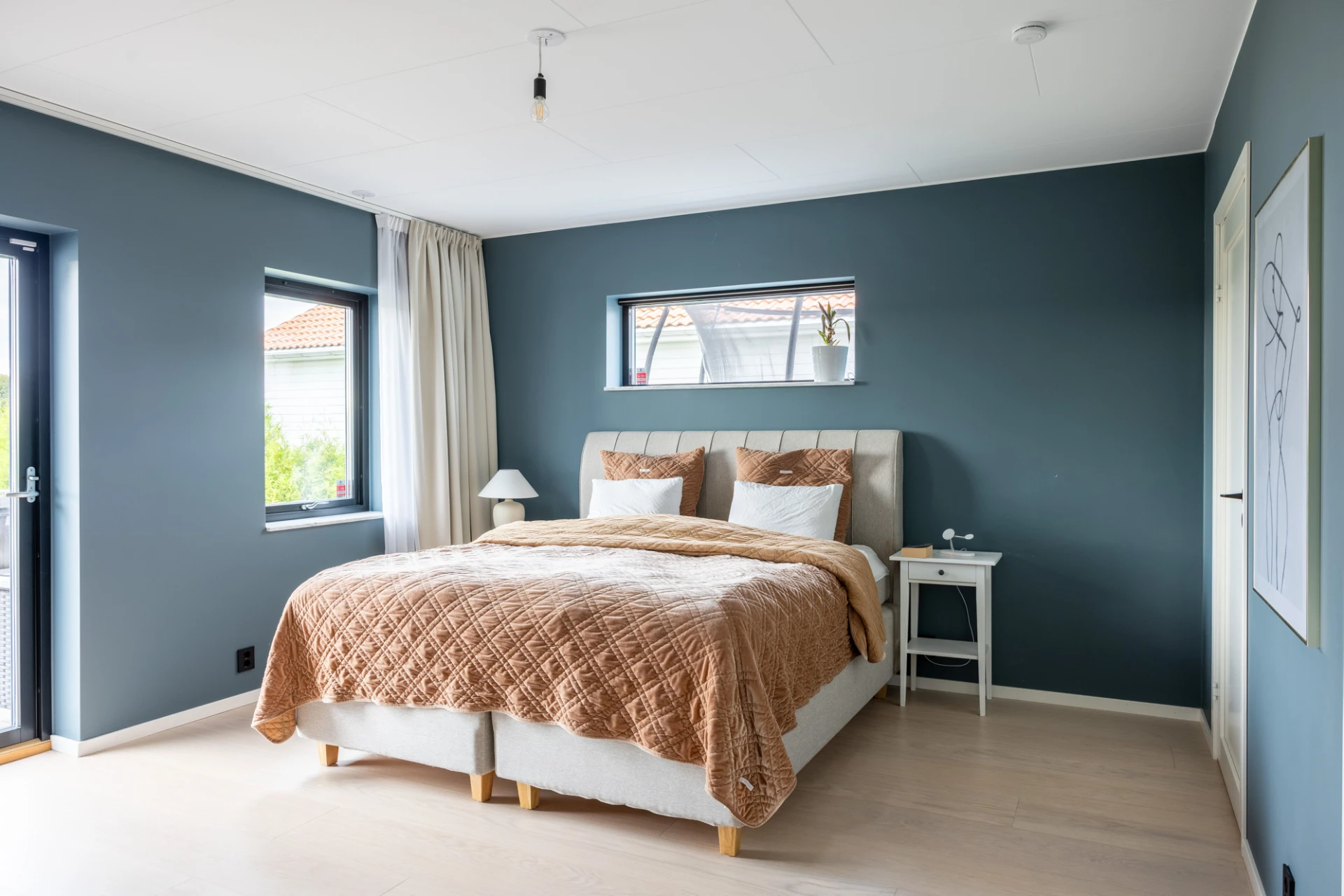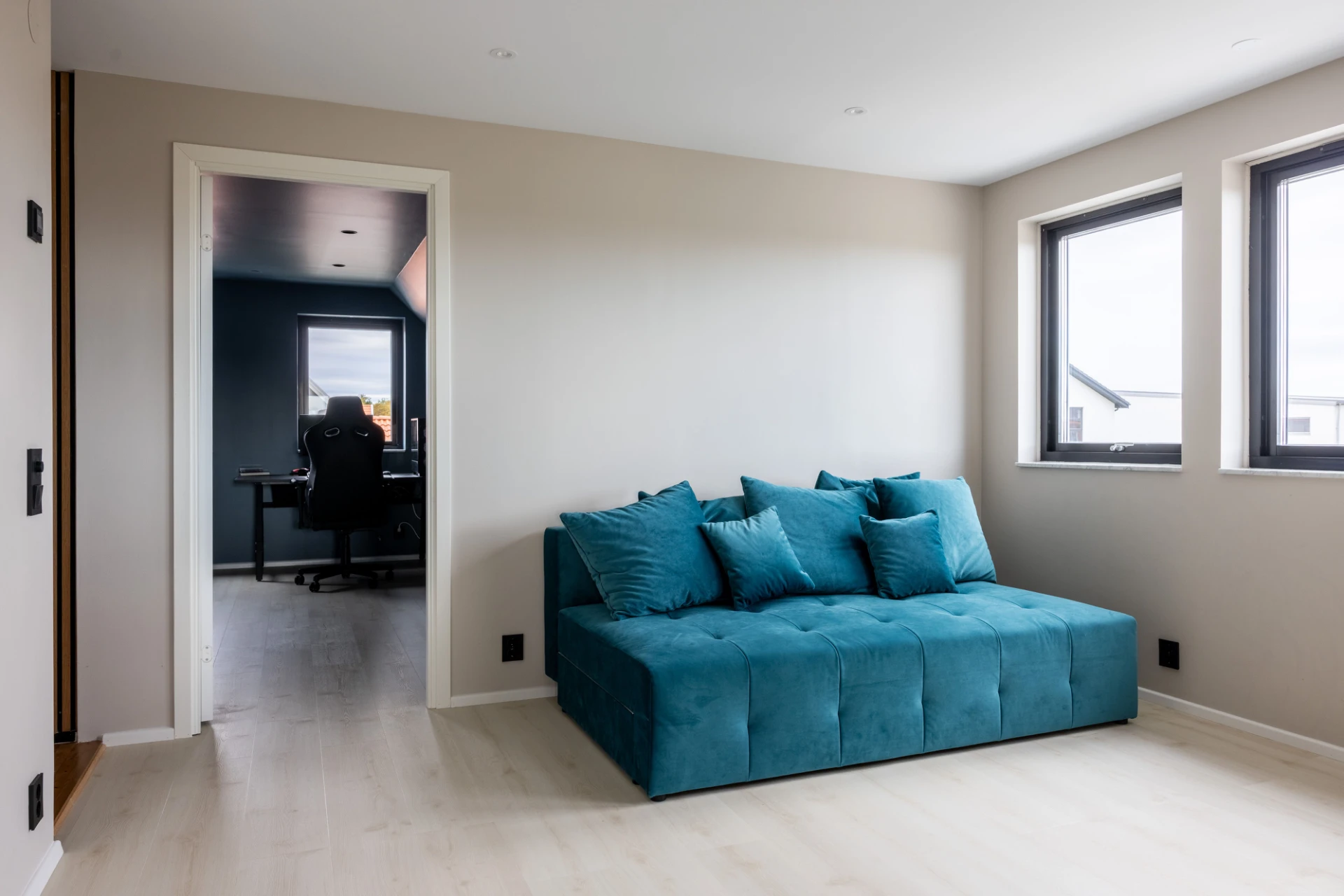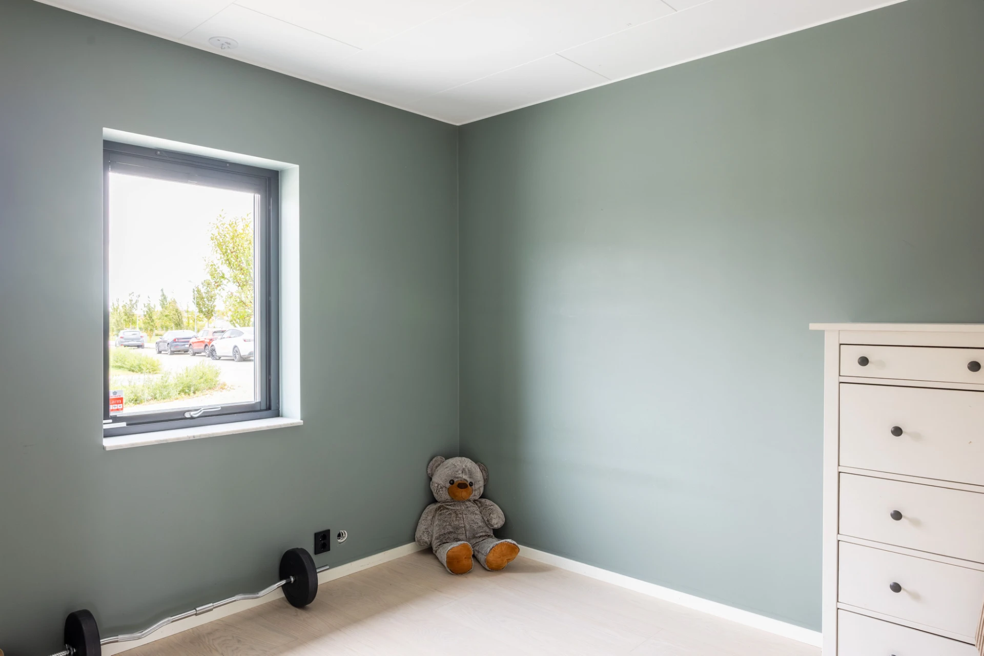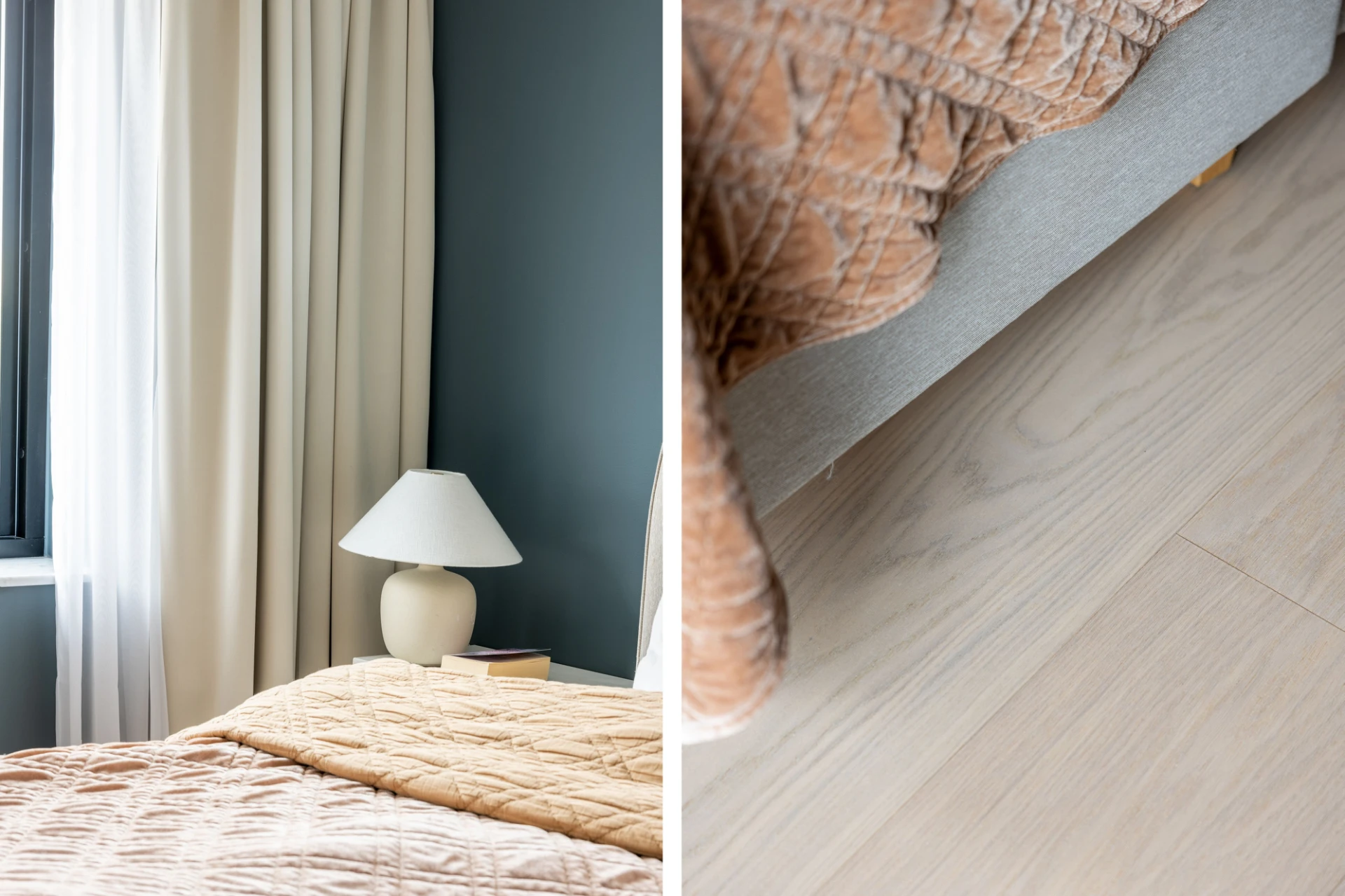 Ljus enstavs ekparkett och blå/grå väggar. Förvaring i garderob (Elfa).