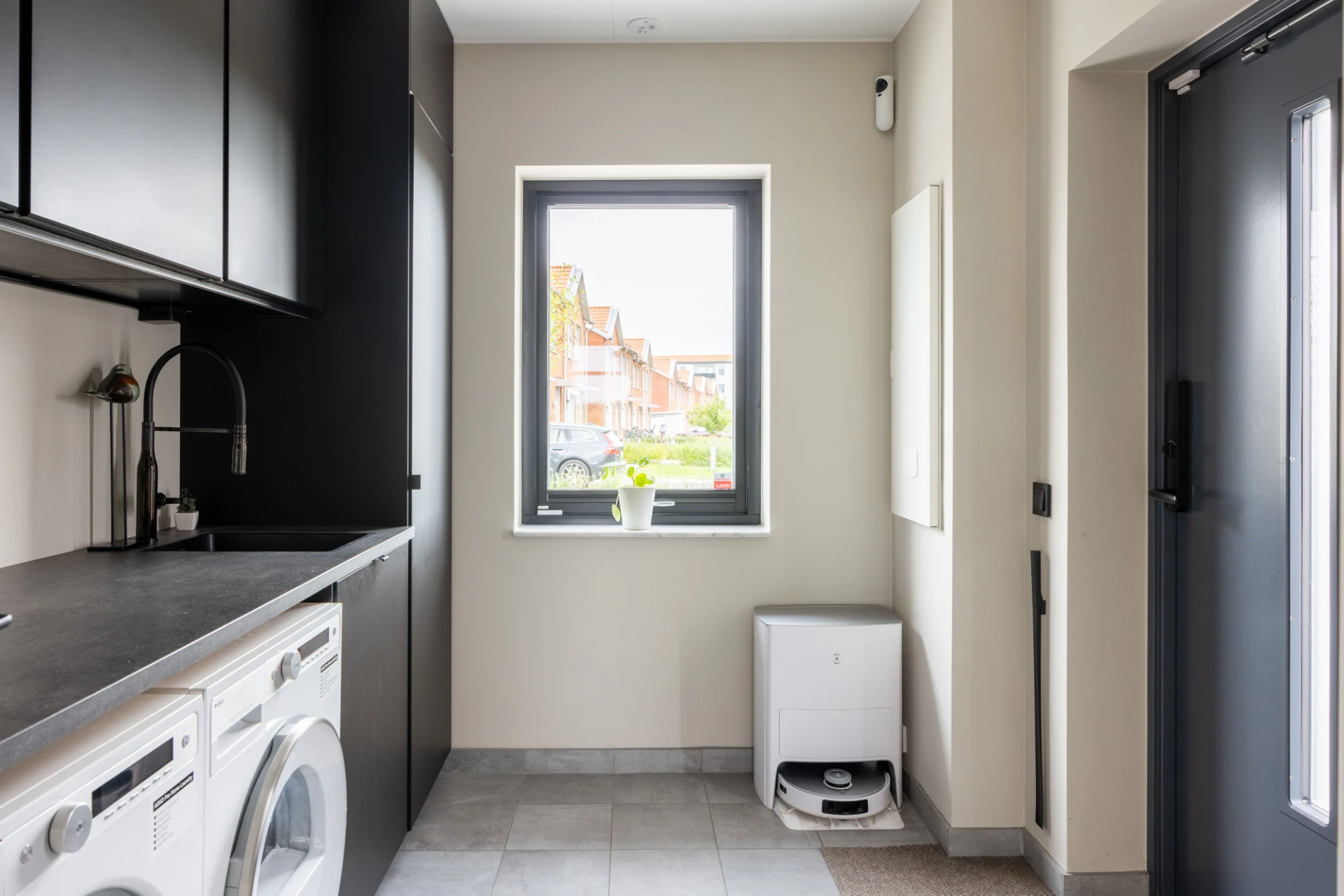 Grå klinkergolv och beige väggar. Tvättrummet är utrustat arbetsbänk, tvättmaskin torktumlare och vask.