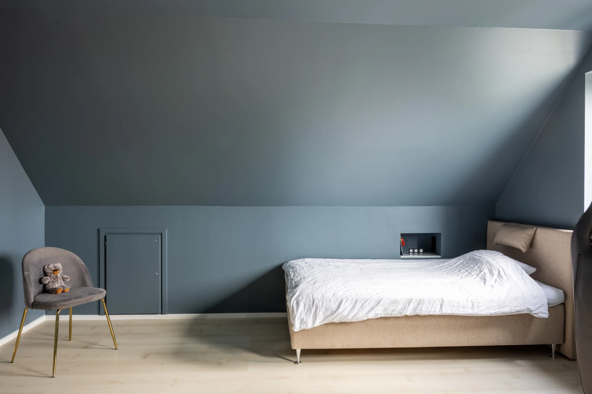 Ljus enstavs vinylgolv och blå/grå väggar. Förvaring i hyllor samt skåp i kattvind.