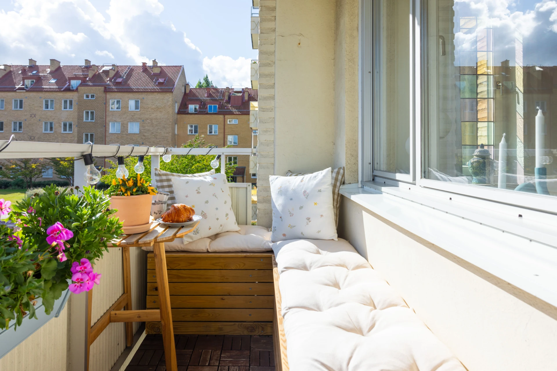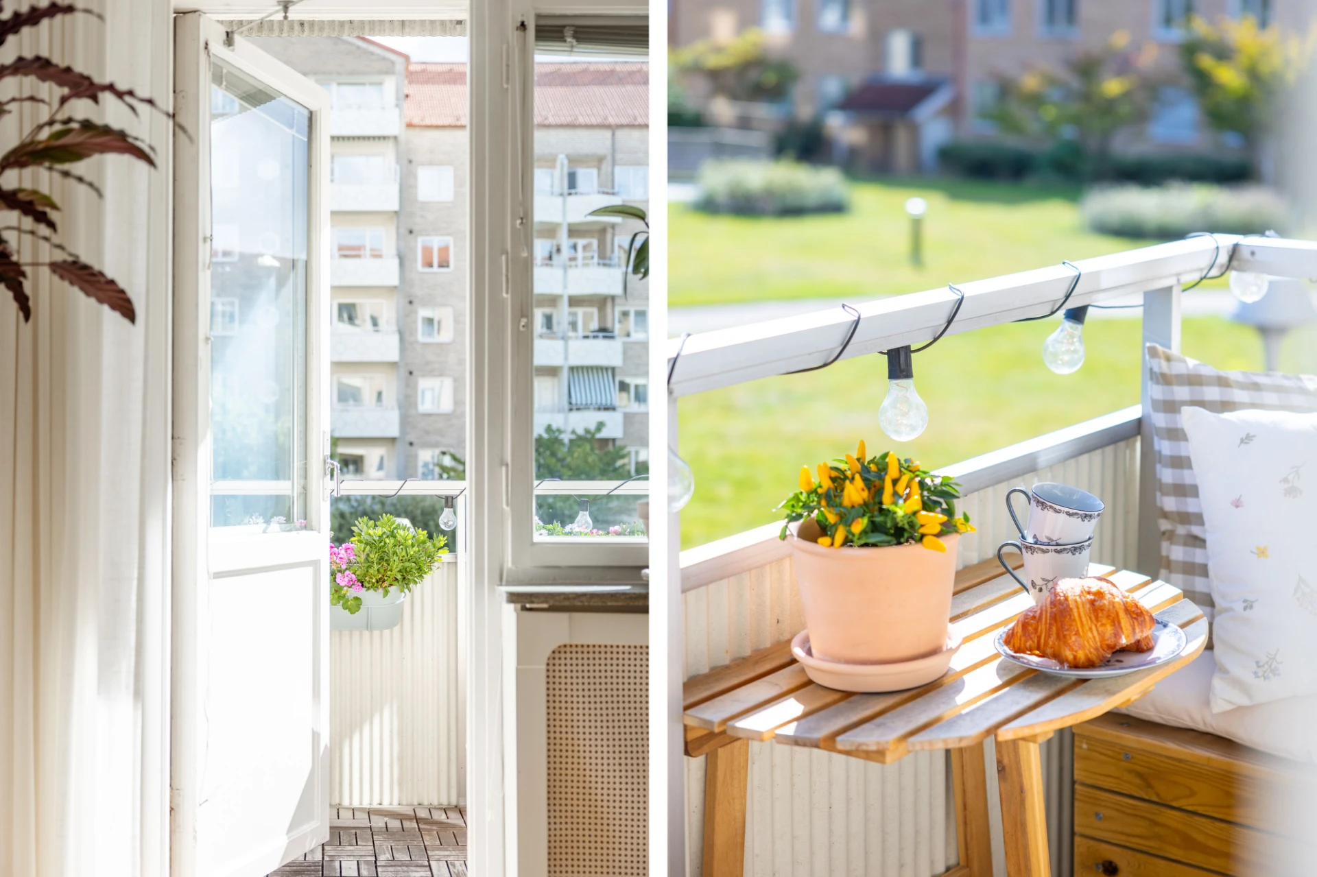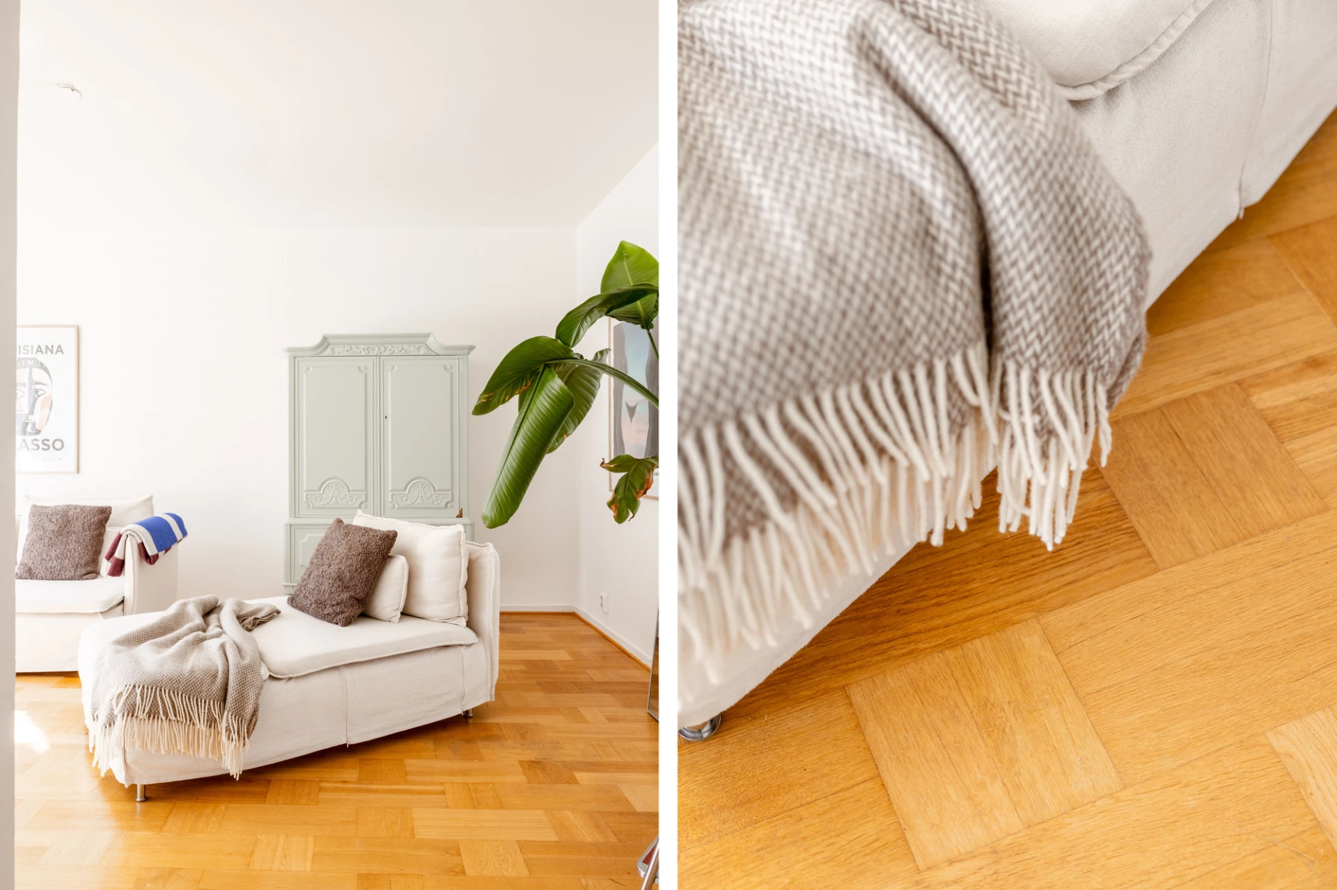 Parkettgolv och vita väggar. Utgång till stor möblerbar balkong.