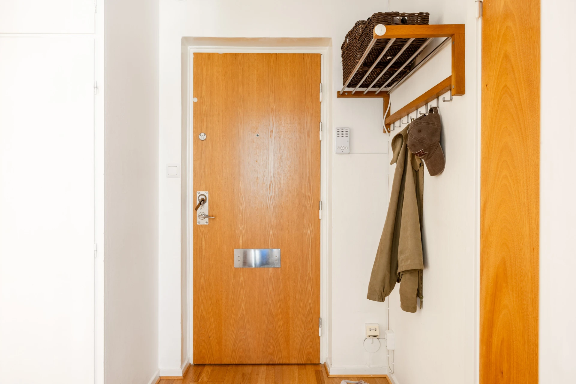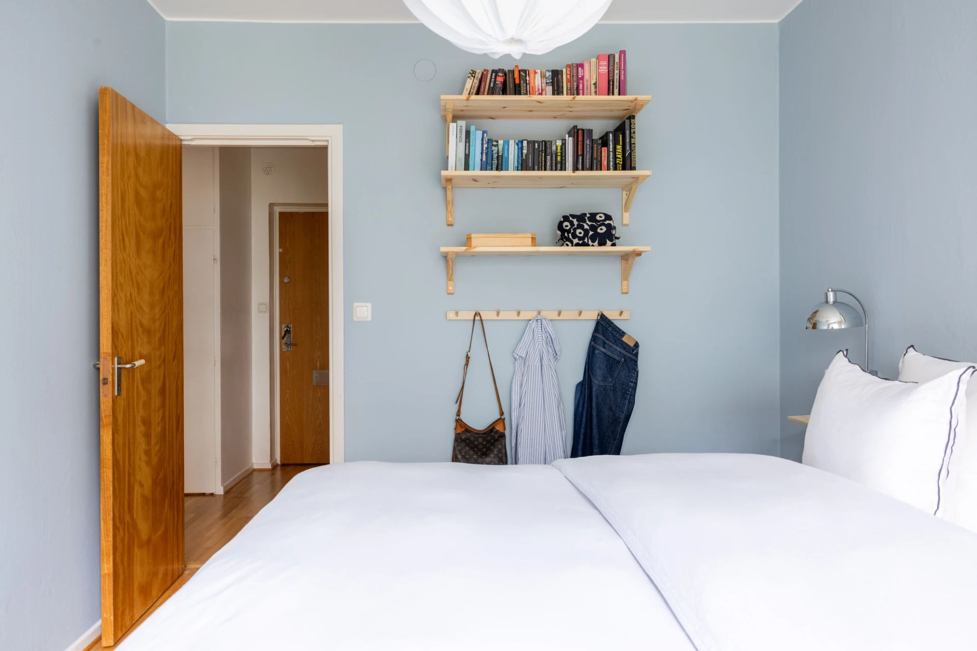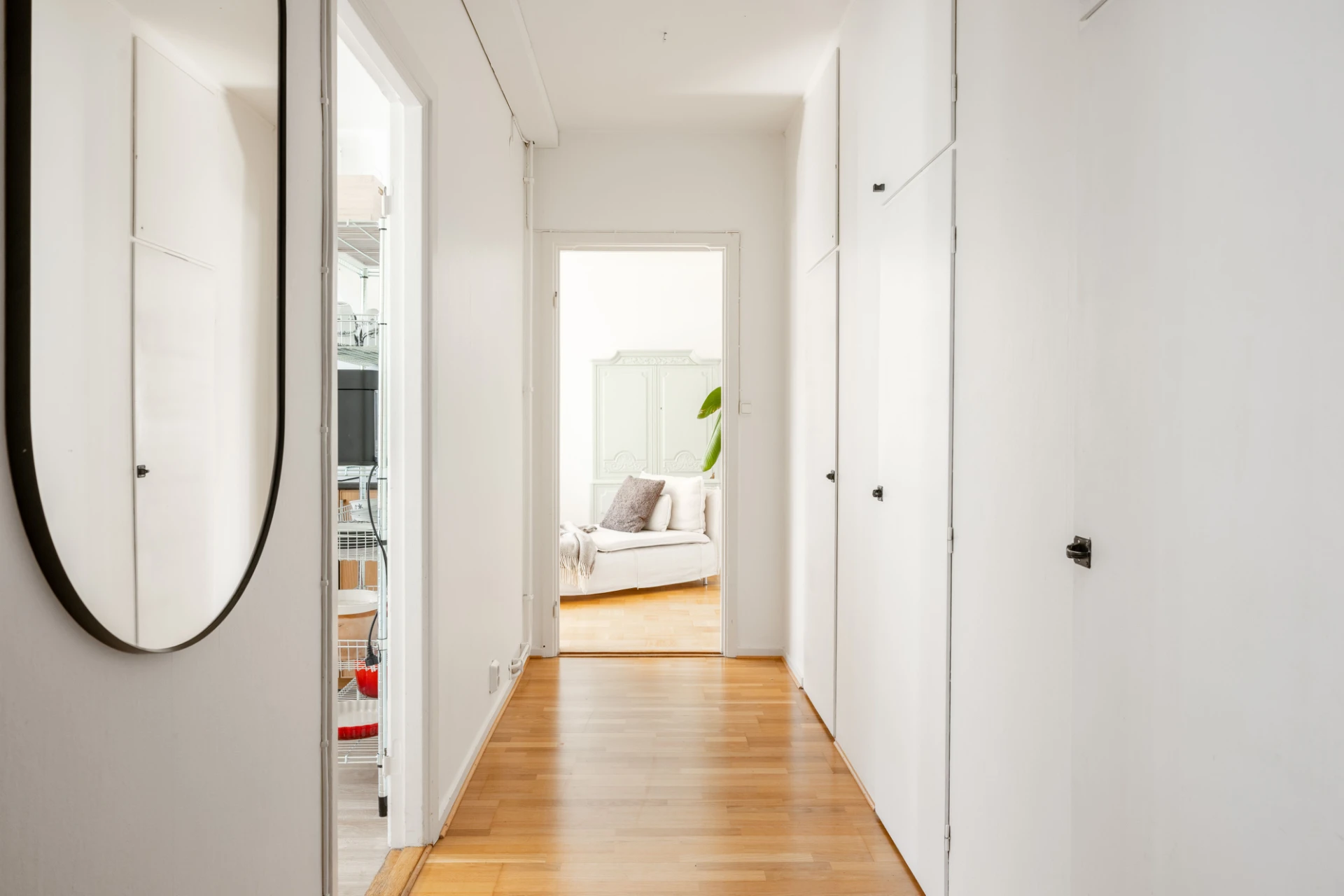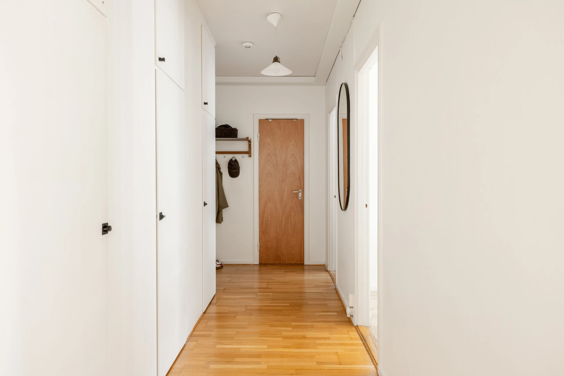 Parkettgolv och vita väggar. Förvaring i platsbyggda garderober.