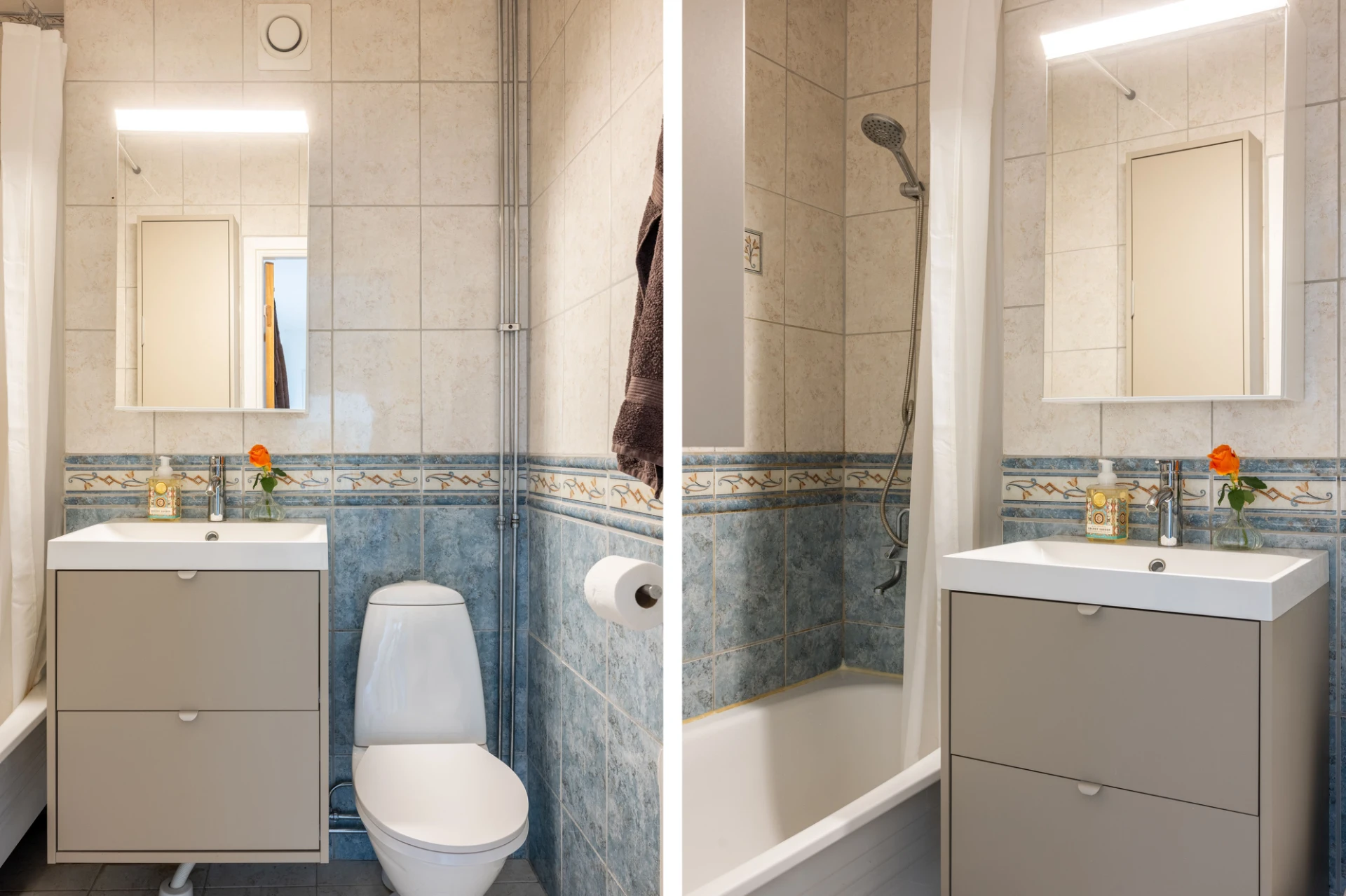 Grå klinker och grå/blå kakel. Badrummet är utrustat med toalett, handfat med kommod, spegelskåp med belysning, badkar samt badrumsskåp.