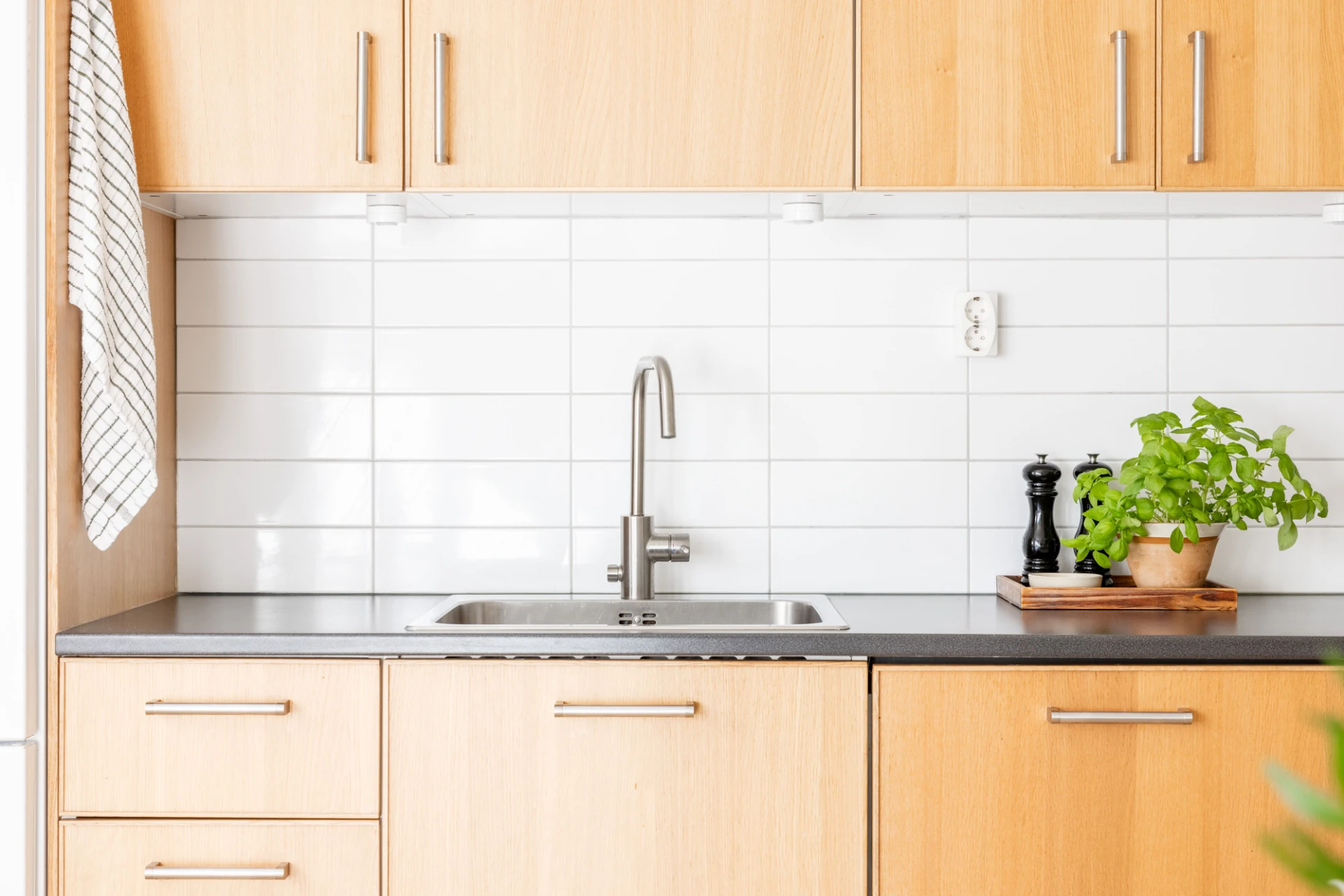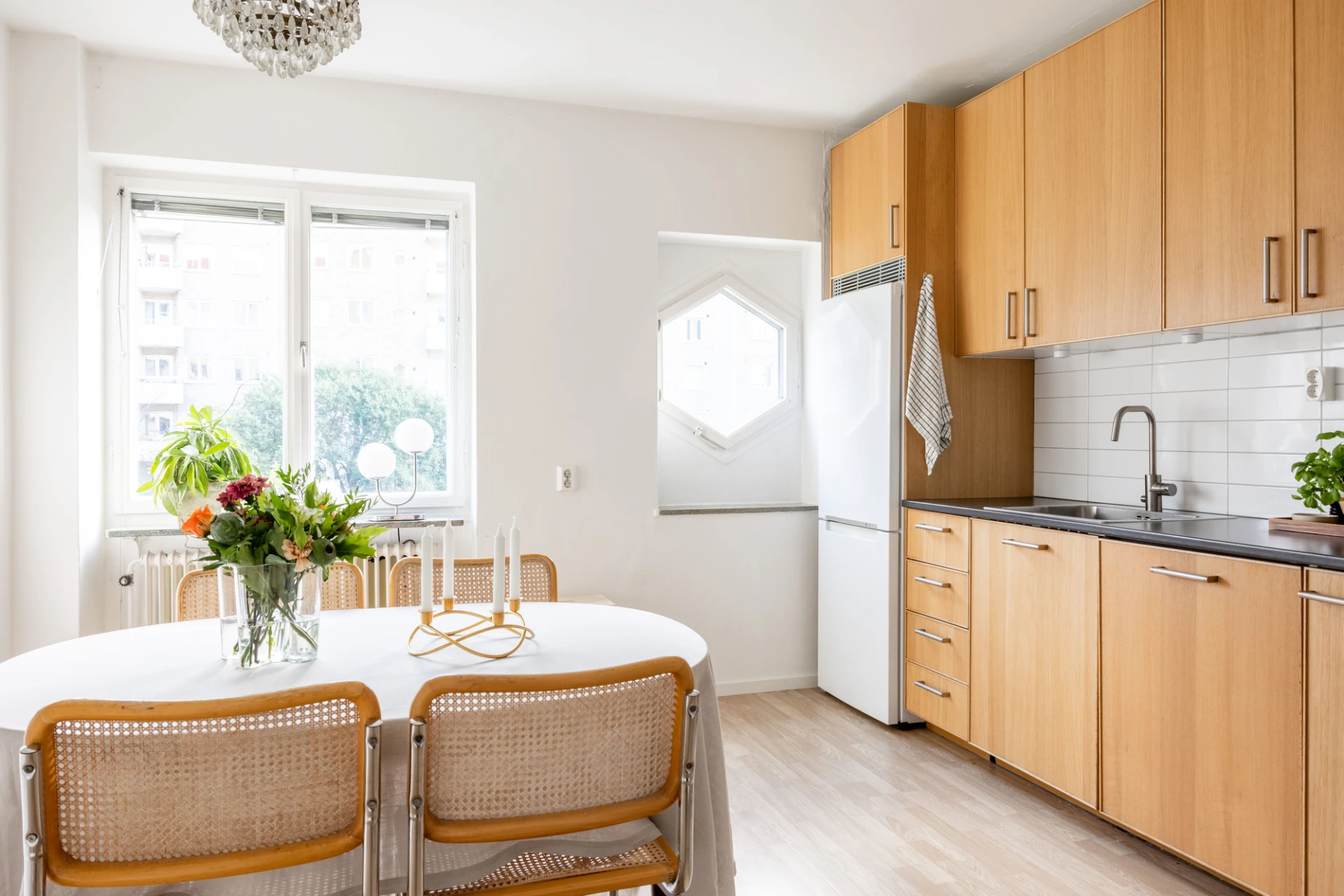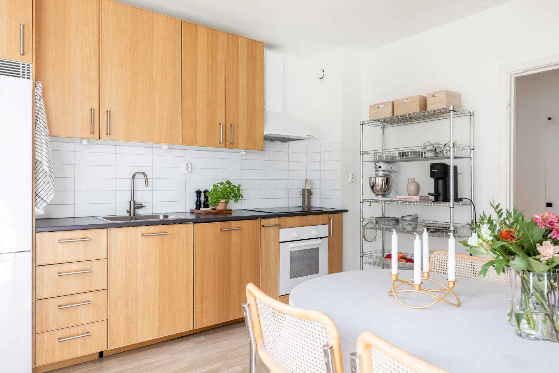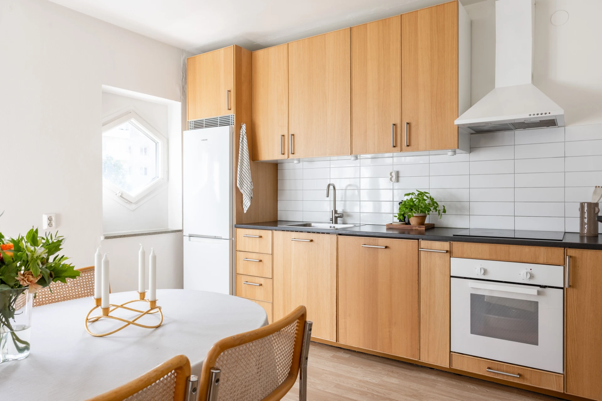 Parkettgolv och vita väggar. Köksinredning i trä med vit kakel ovan arbetsyta i mörk laminat. Köket är utrustat med kyl/frys, inbyggd diskmaskin, induktionshäll, köksfläkt och ugn.