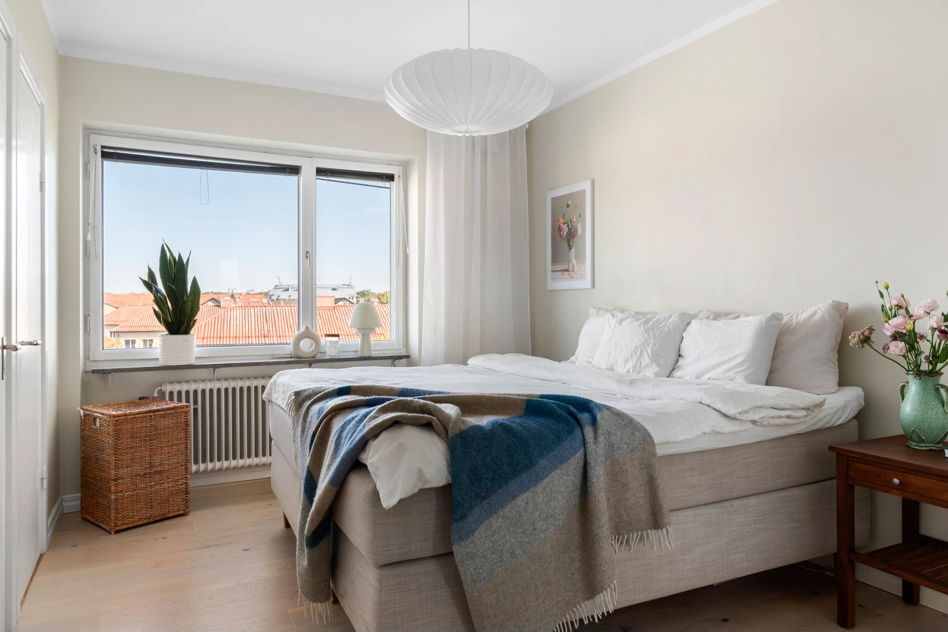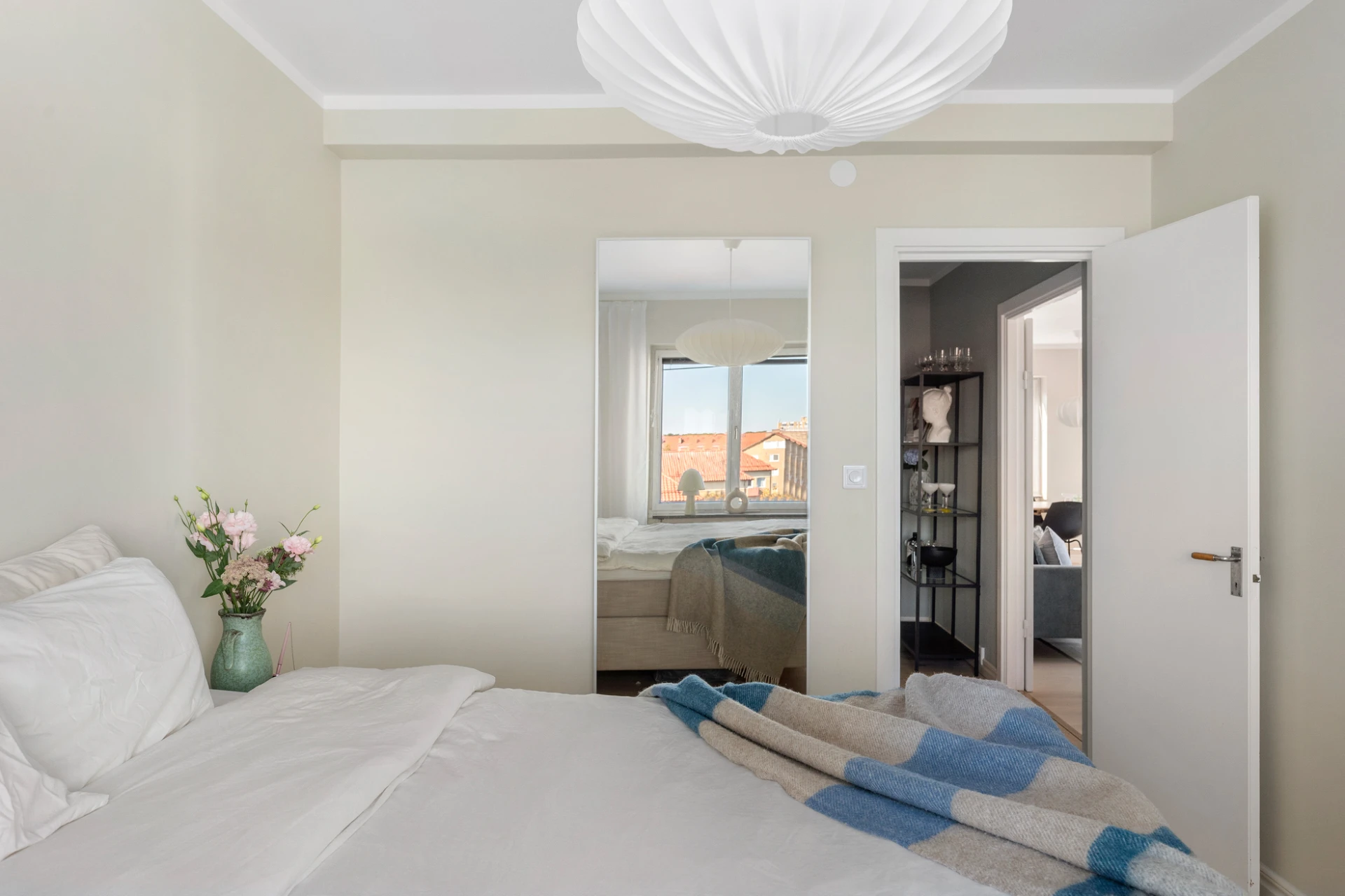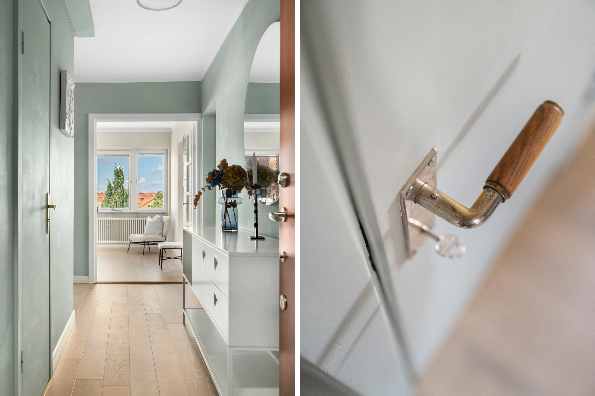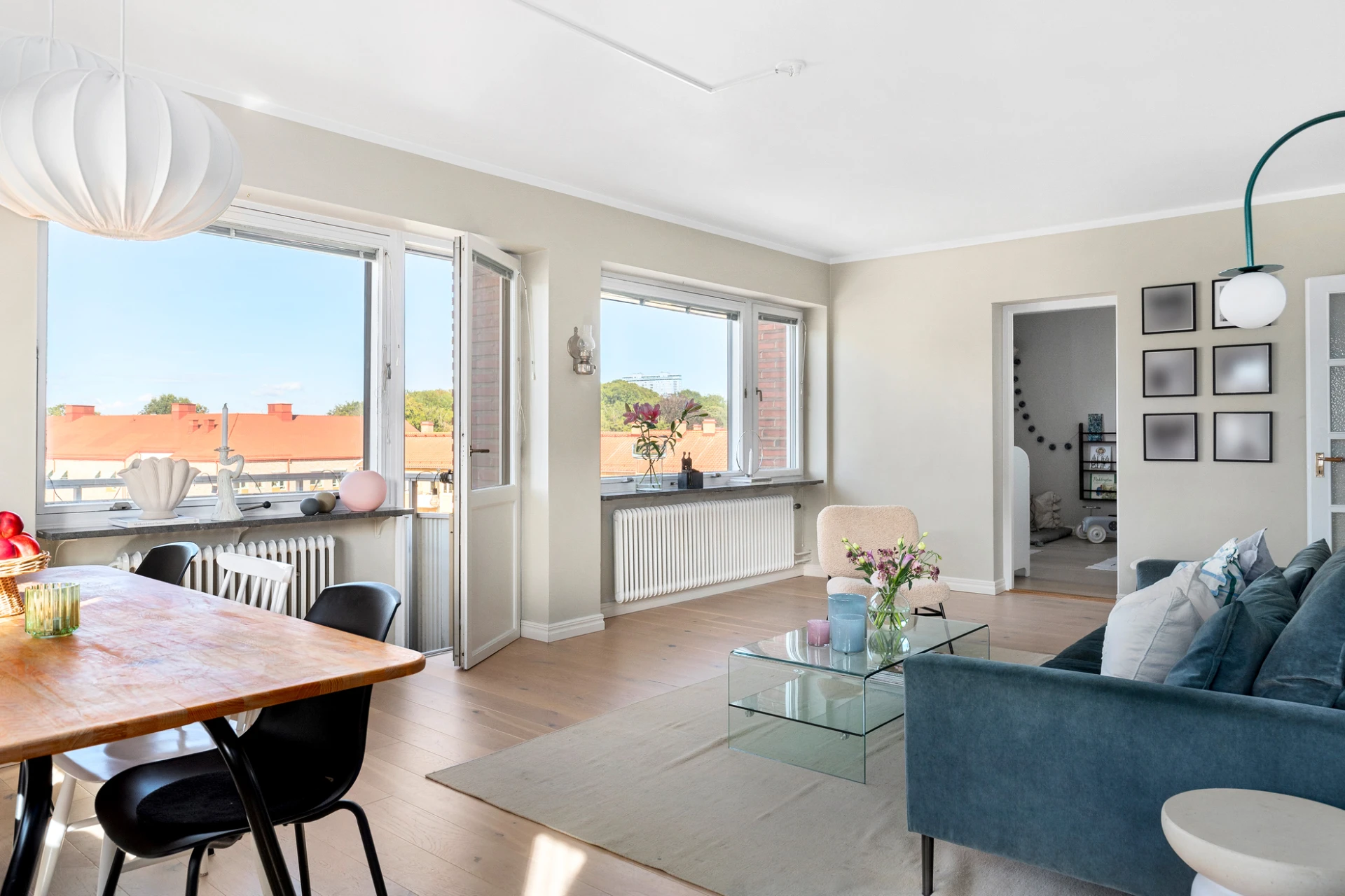 Högt upp i huset väntar en ljus och välplanerad bostad där stilrena materialval möter en luftig planlösning. Tack vare fönster i tre väderstreck flödar ljuset in och skapar en härlig känsla av rymd genom hela hemmet. Det öppna sambandet mellan kök och vardagsrum bjuder in till sociala middagar och umgänge, samtidigt som planlösningen gör det enkelt att möblera efter behov. De två sovrummen är rymliga med generösa förvaringsmöjligheter, vilket ger både komfort och funktion i vardagen. Bostaden är smakfullt renoverad i modern stil, men med inslag som påminner om husets 50-talskaraktär och ger hemmet en extra dimension.