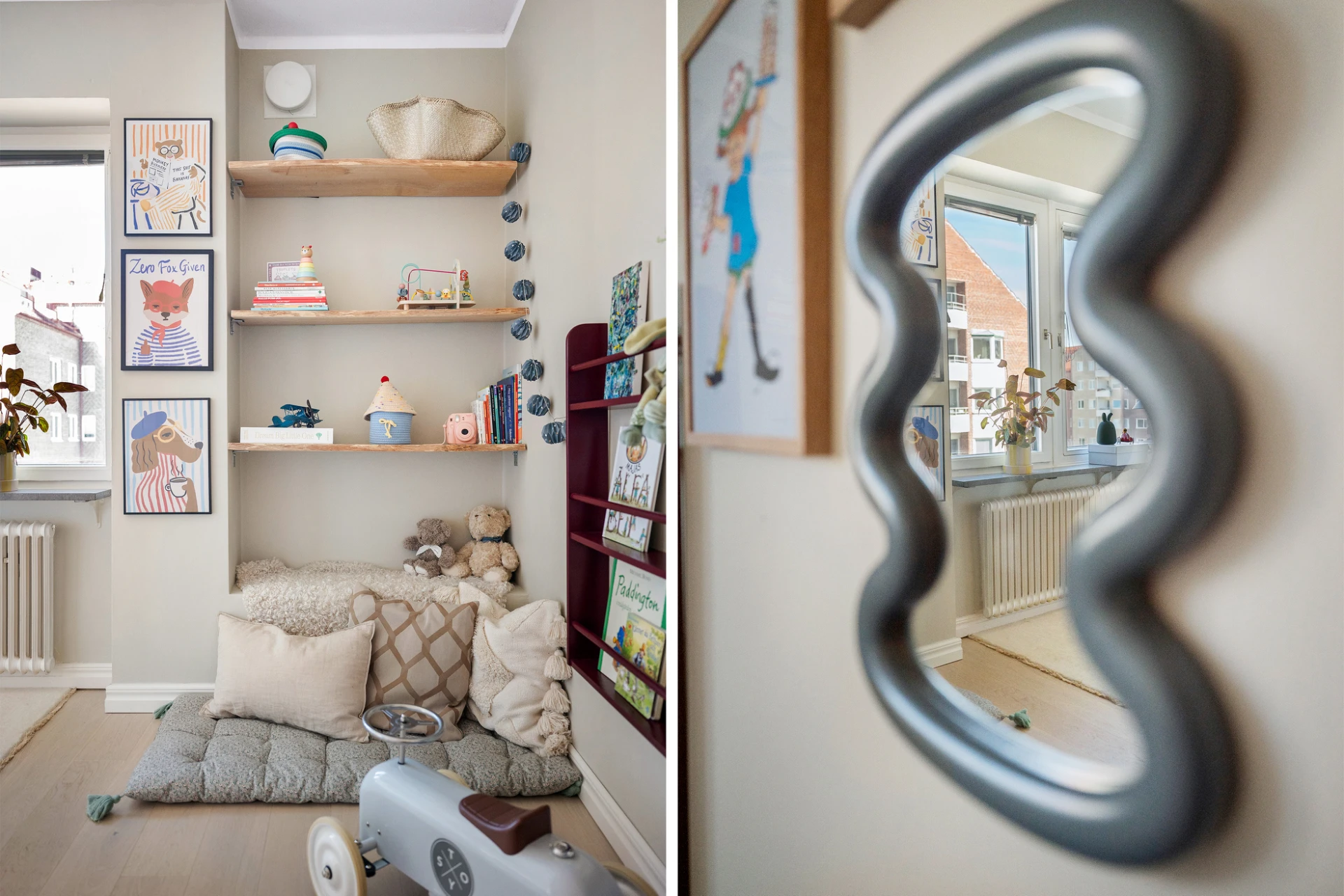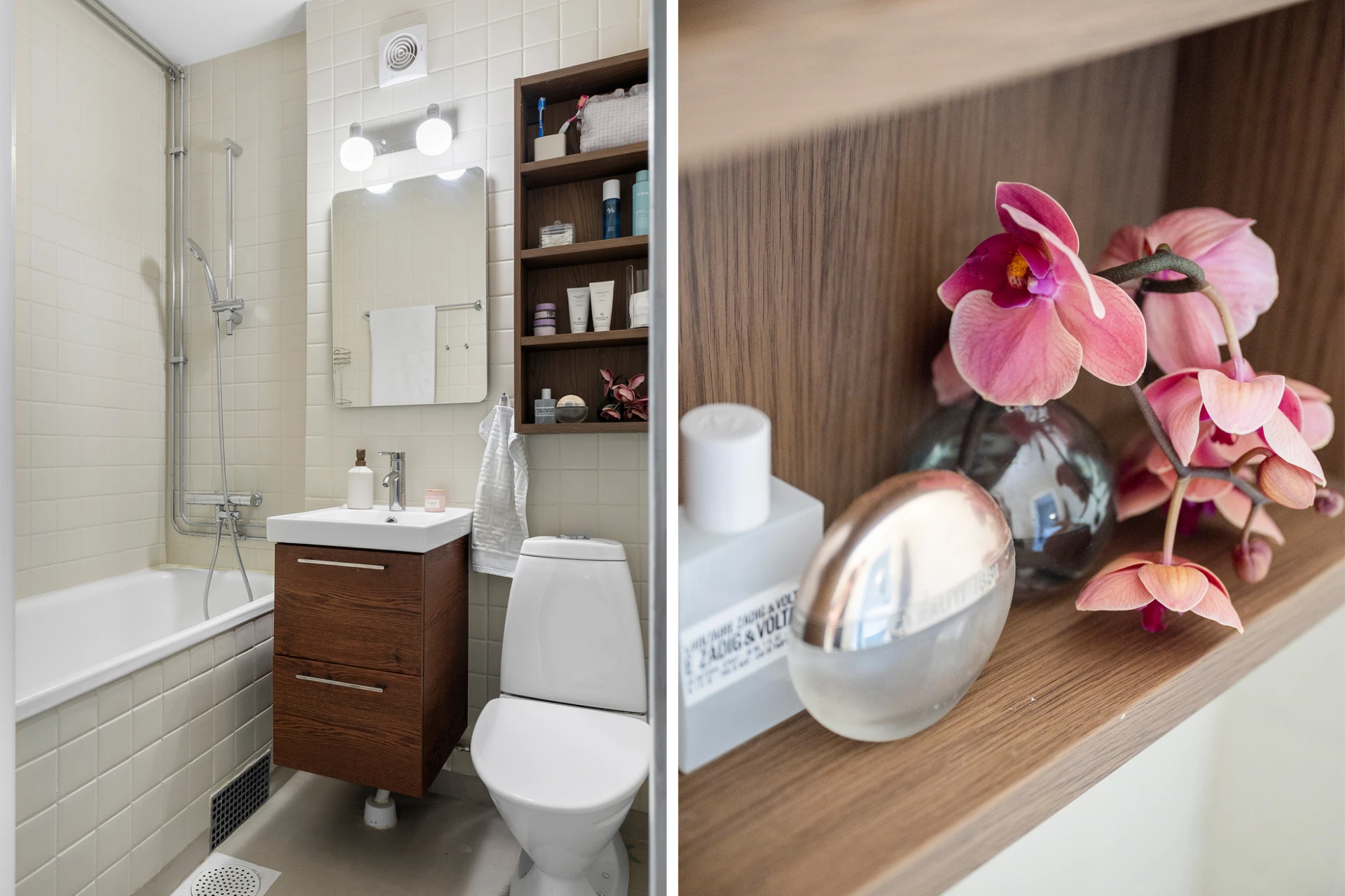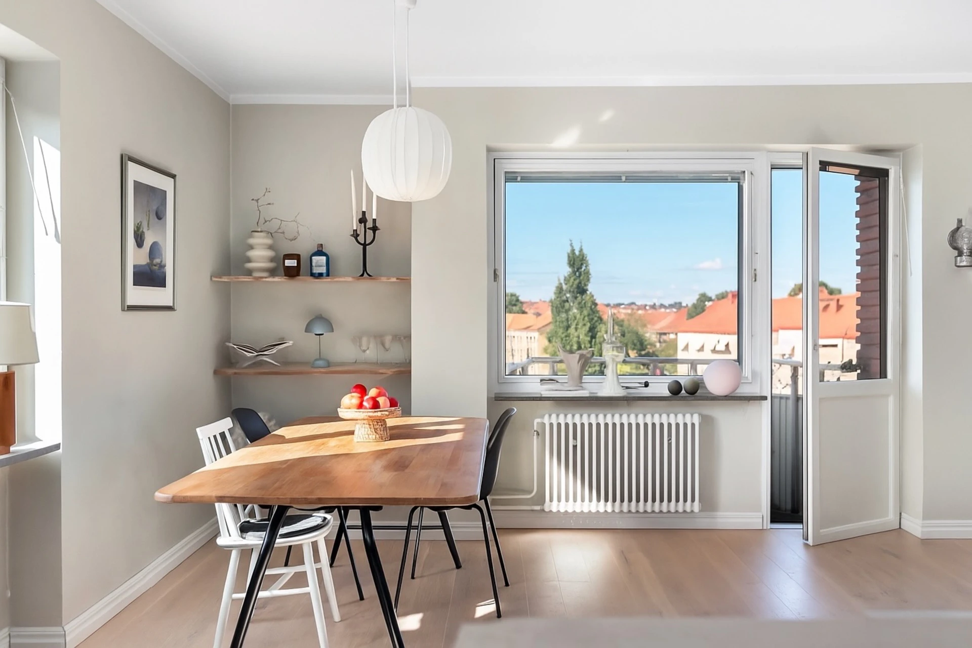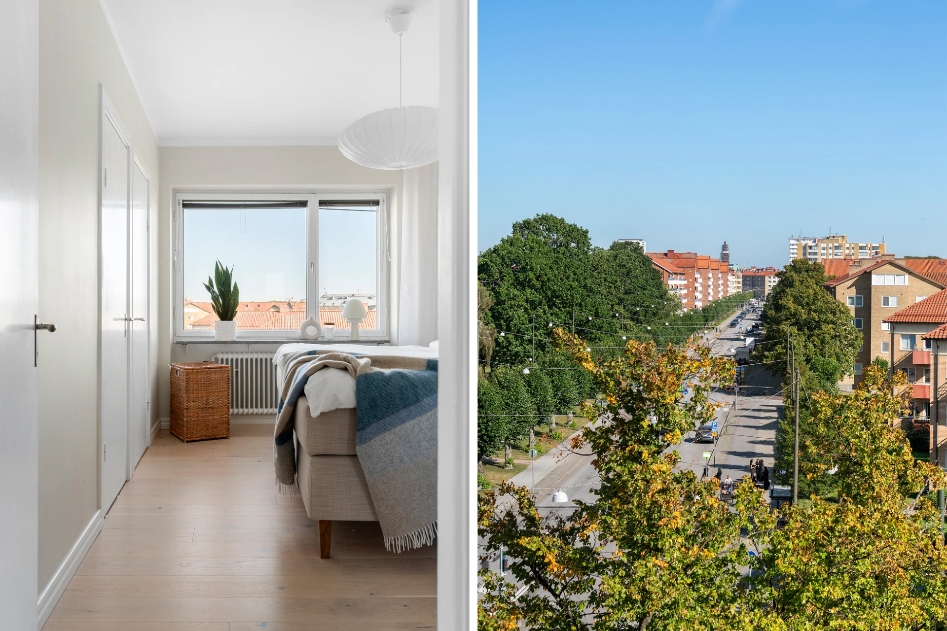 Högt upp i huset väntar en ljus och välplanerad bostad där stilrena materialval möter en luftig planlösning. Tack vare fönster i tre väderstreck flödar ljuset in och skapar en härlig känsla av rymd genom hela hemmet. Det öppna sambandet mellan kök och vardagsrum bjuder in till sociala middagar och umgänge, samtidigt som planlösningen gör det enkelt att möblera efter behov. De två sovrummen är rymliga med generösa förvaringsmöjligheter, vilket ger både komfort och funktion i vardagen. Bostaden är smakfullt renoverad i modern stil, men med inslag som påminner om husets 50-talskaraktär och ger hemmet en extra dimension.