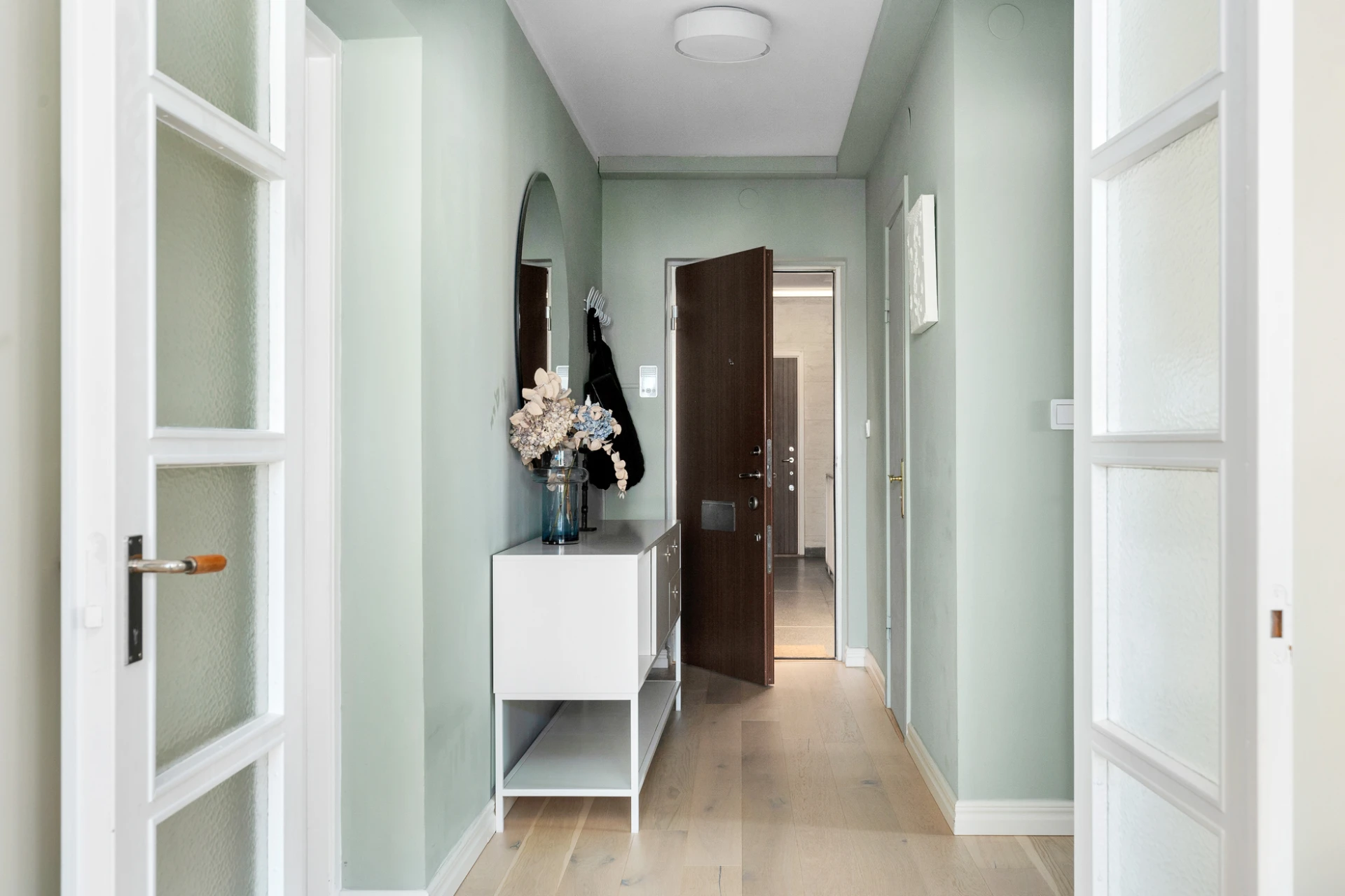 Parkettgolv och dovt gröna väggar samt klädkammare.