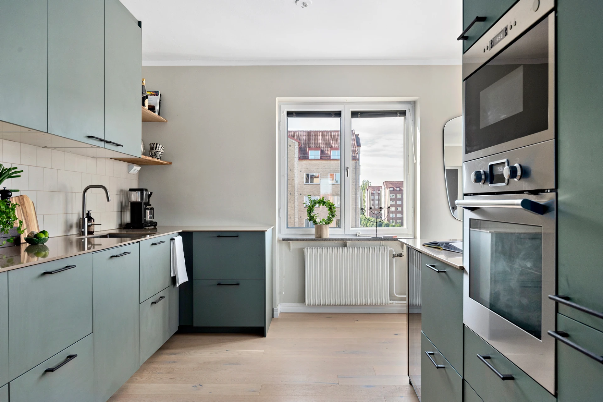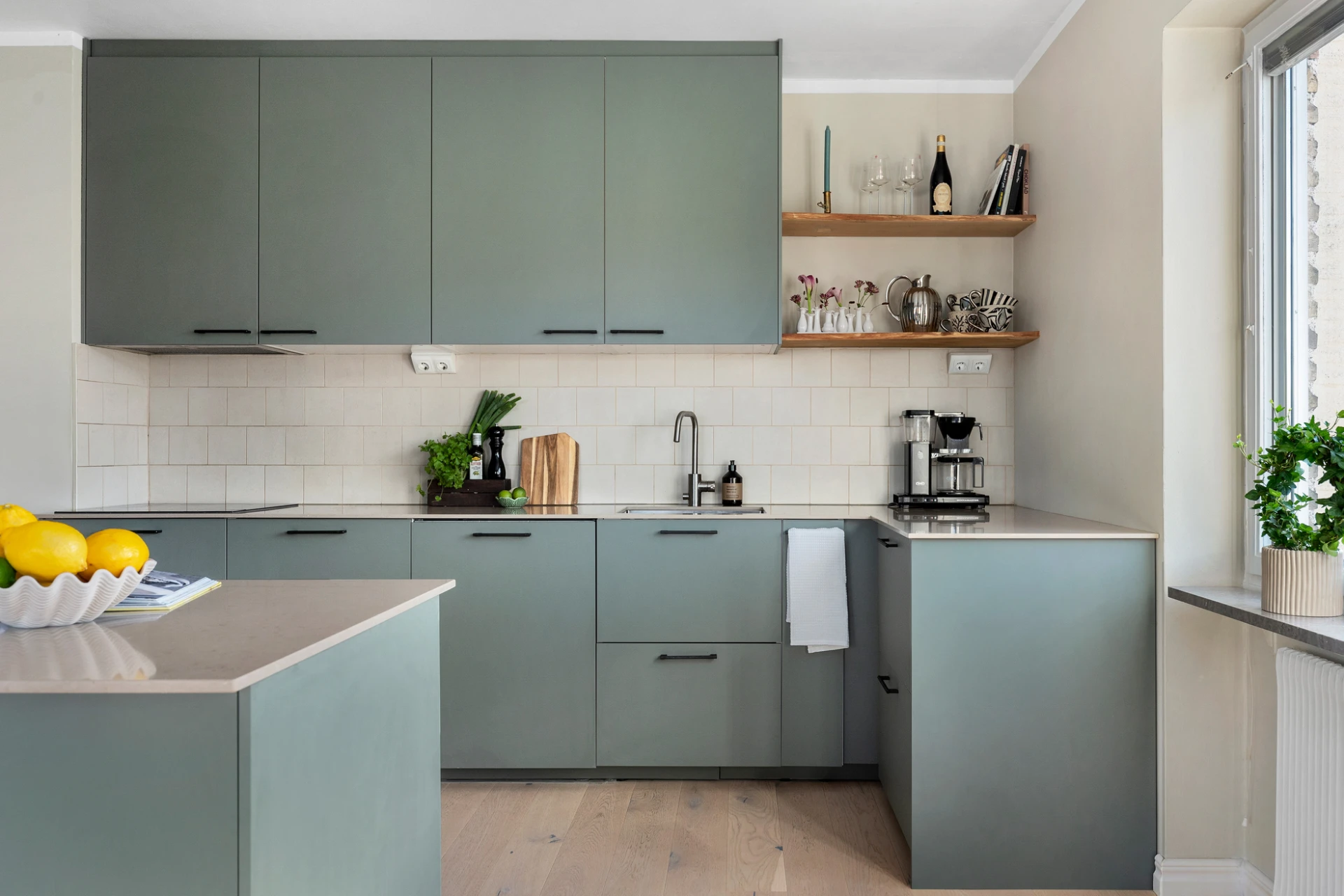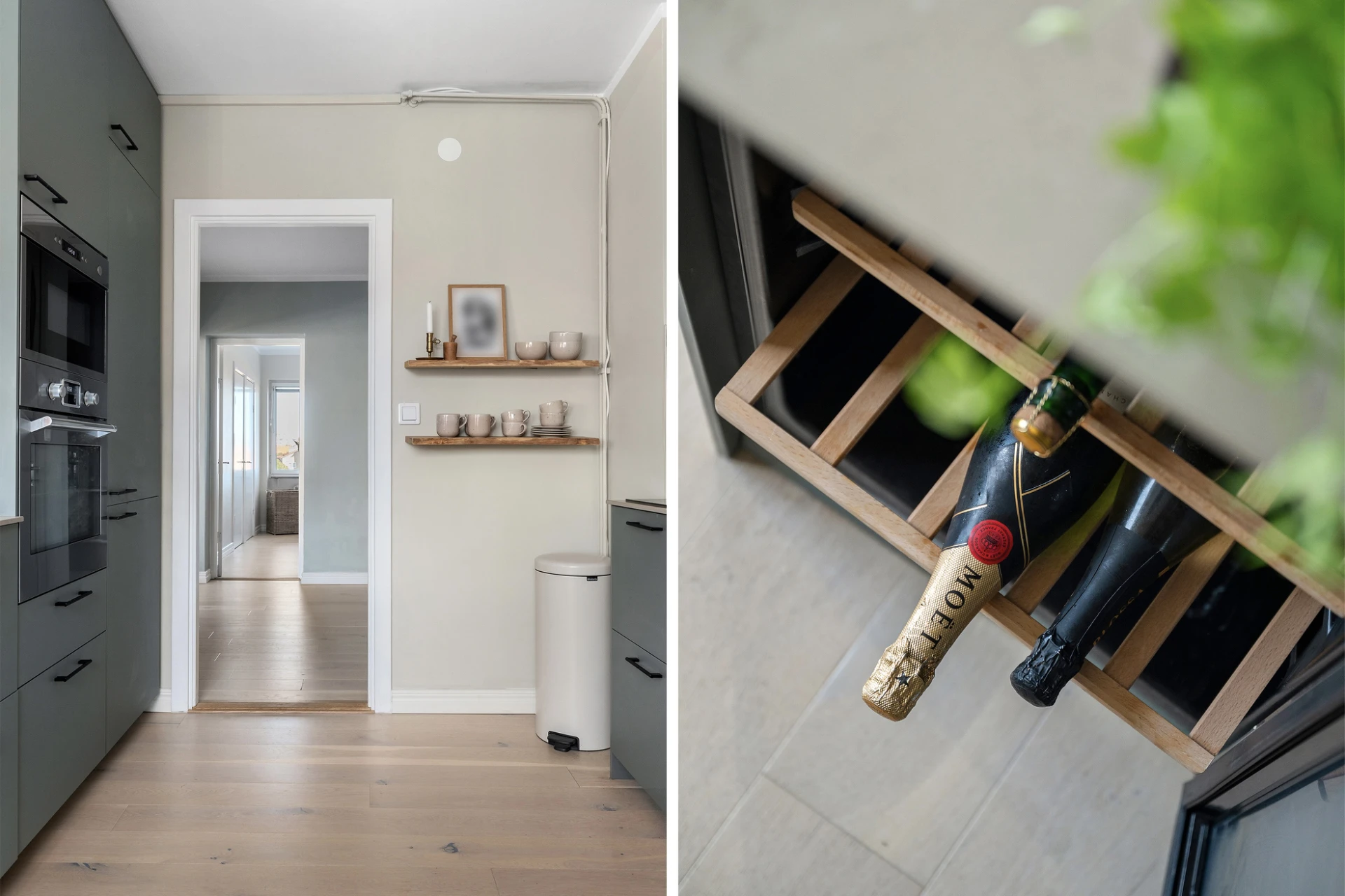 Parkettgolv och beige väggar. Mörkgrön köksinredning med beige kakel ovan bänkskiva i sten. Köket är utrustat me kyl,/frys, induktionshäll, ugn, mikrovågsugn, fläkt, integrerad diskmaskin, vask och köksö med vinkyl.