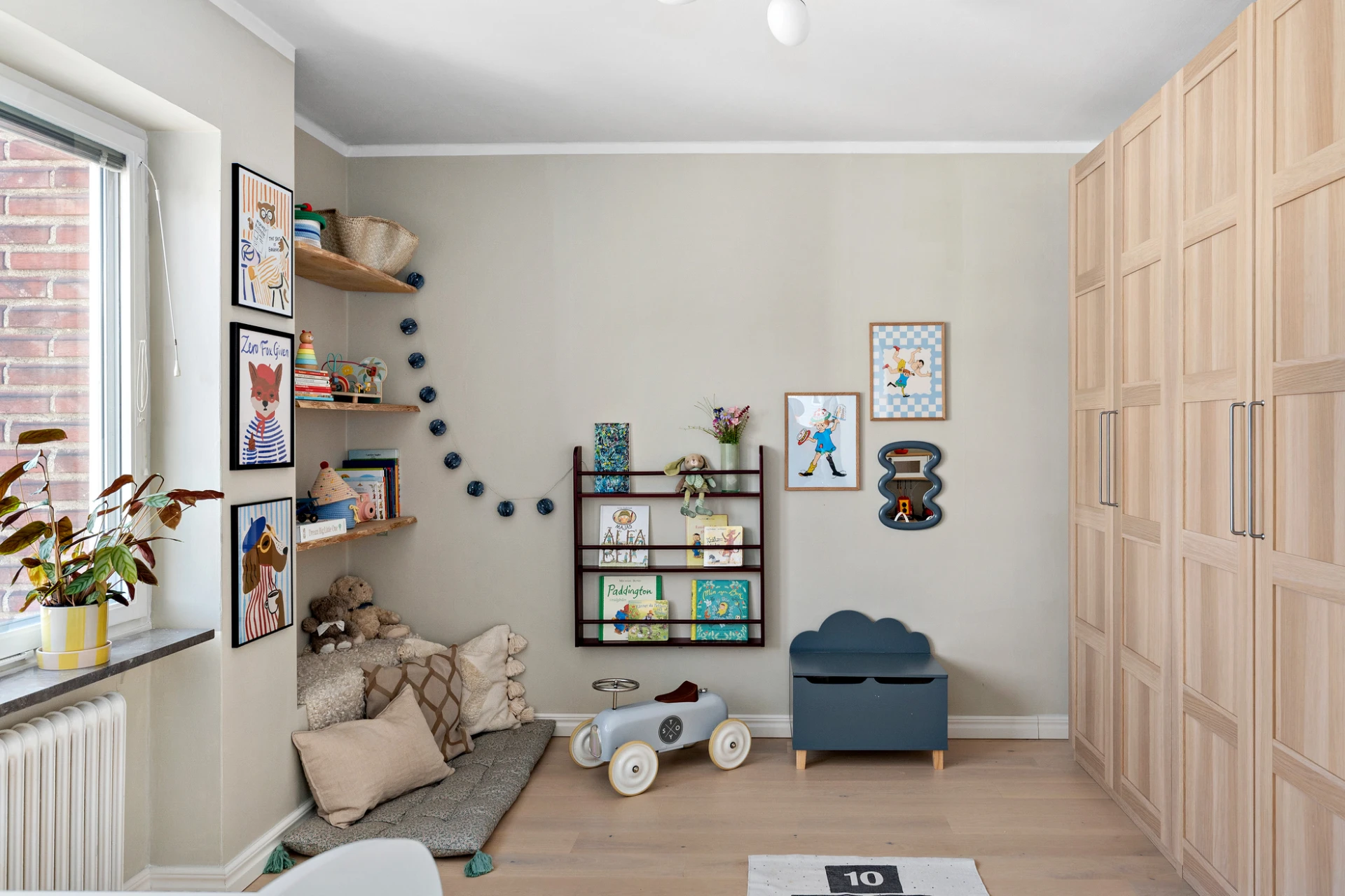 Parkettgolv och beige väggar. Fristående garderober och en inbyggd klädkammare.