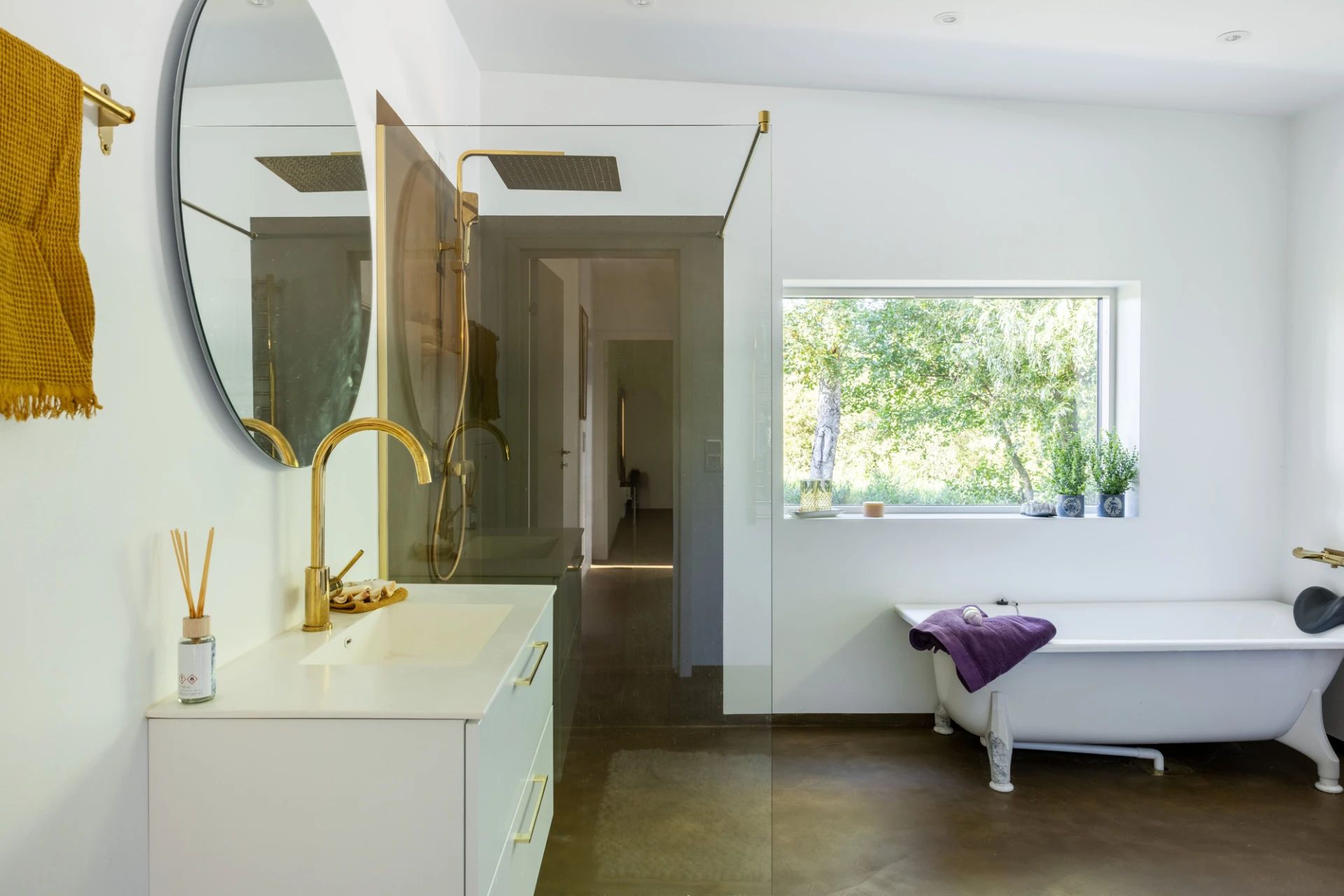 Mörkt golv och vita väggar. Badrummet är utrustat med WC, handfat med kommod, spegel med belysning, takdusch med skiljevägg i glas, badkar, tvättmaskin, torktumlare och luftvärmepump.