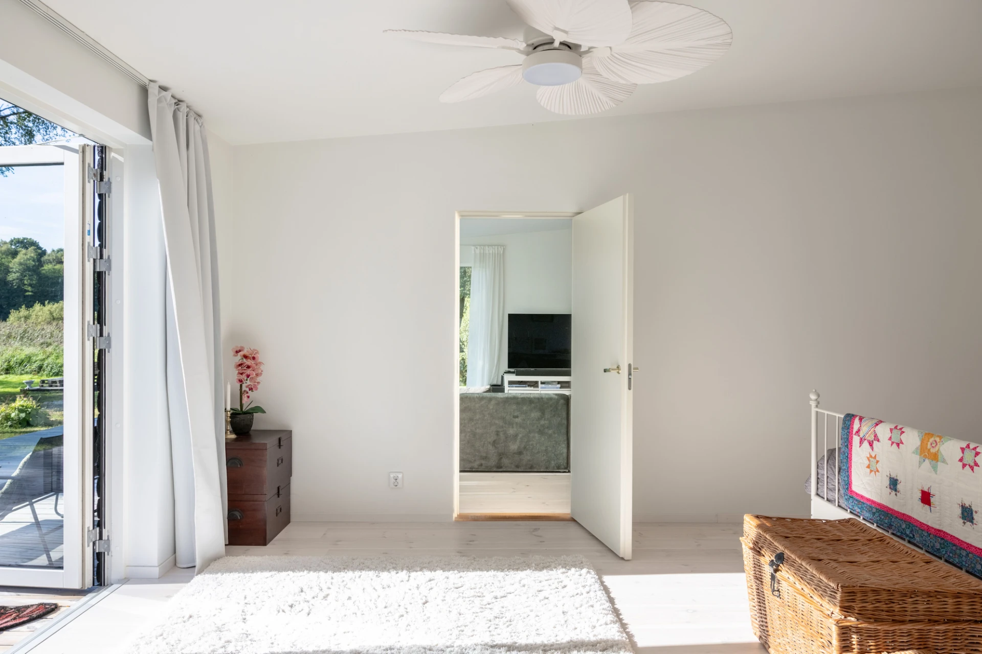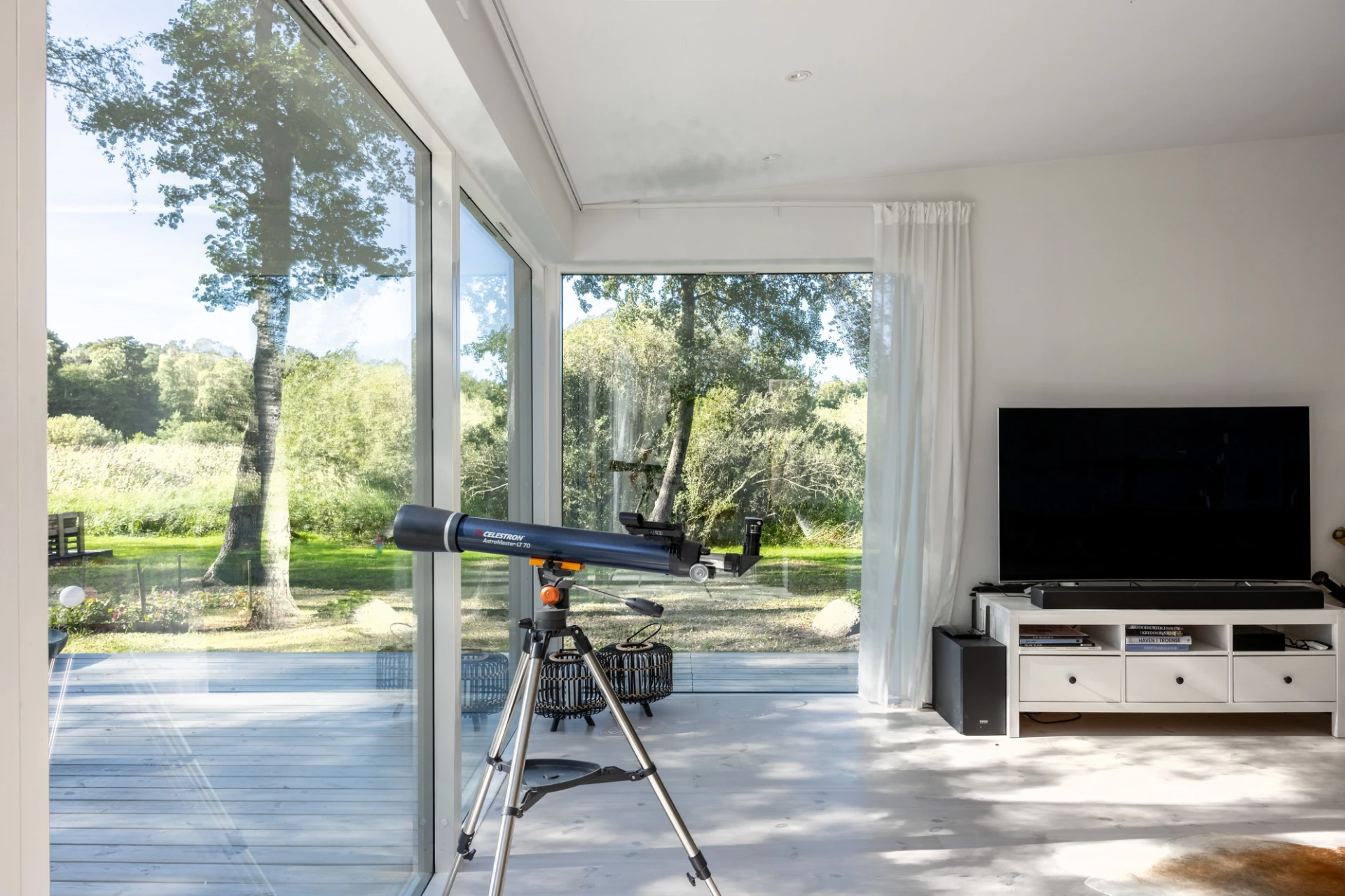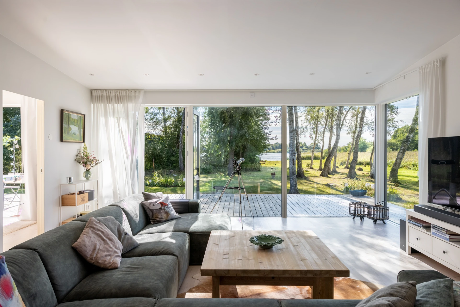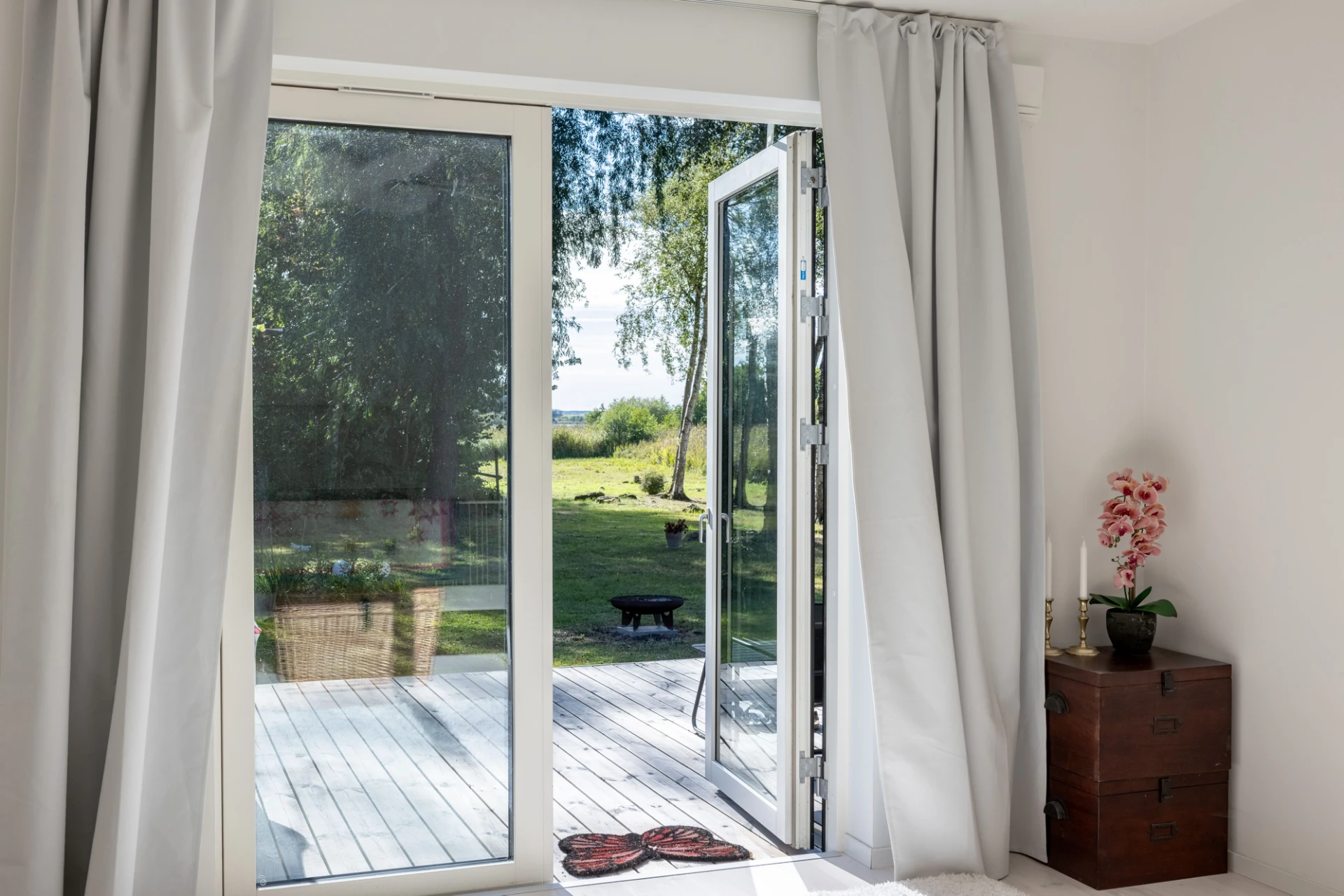 Vitlaserad parkett och vita väggar. Här finns en braskamin samt stora fönsterpartier med öppningsbar sektion mot utemiljön.
