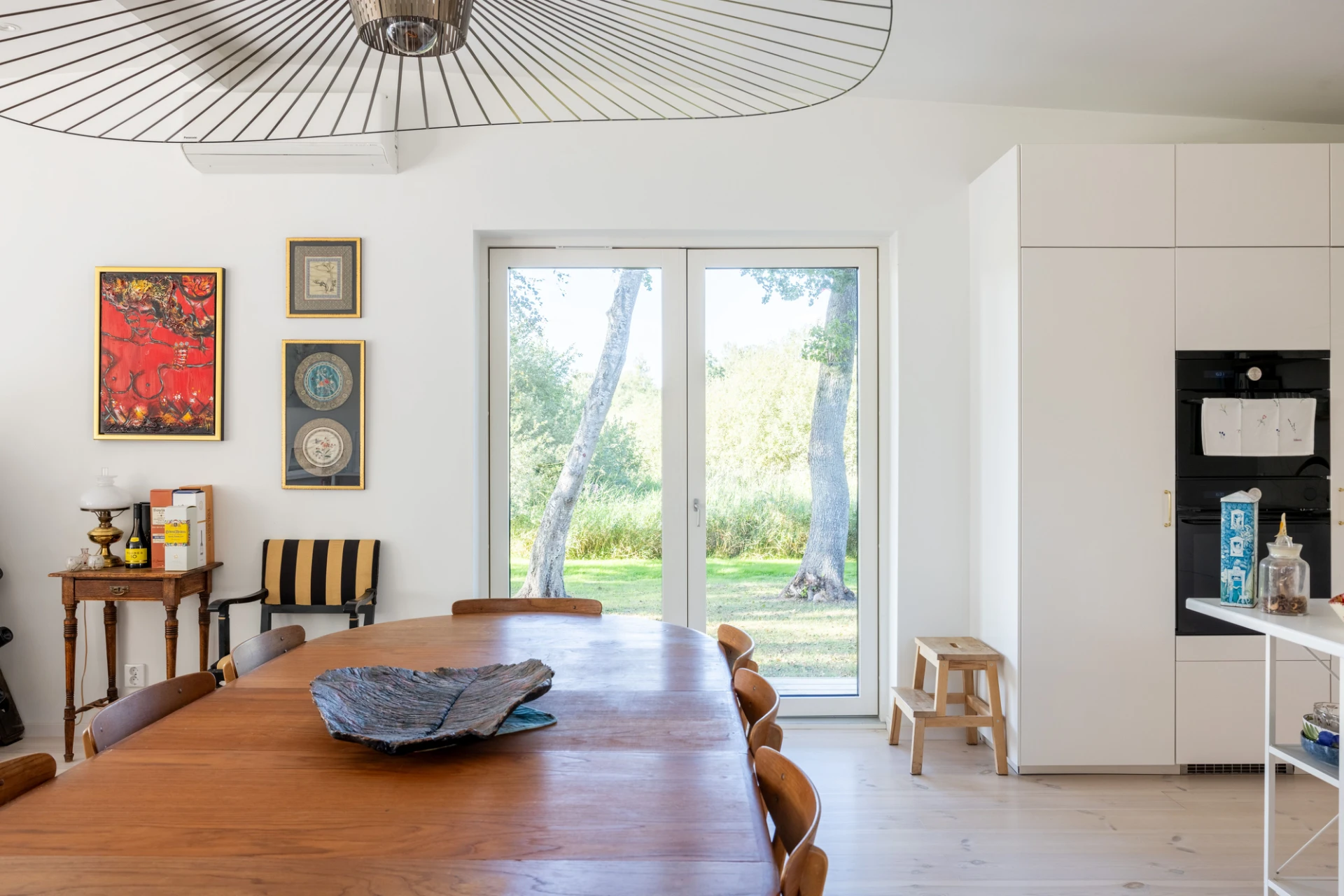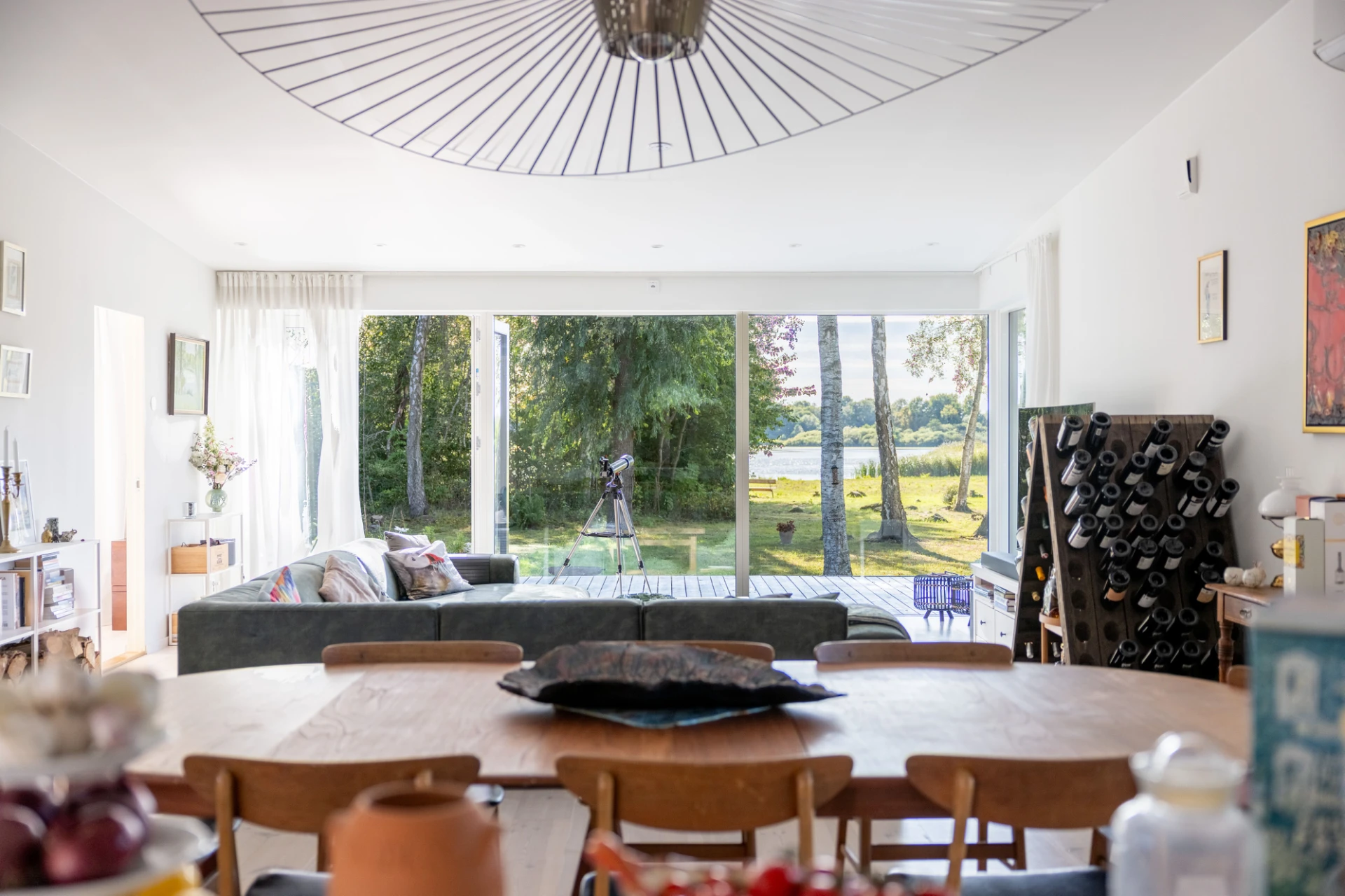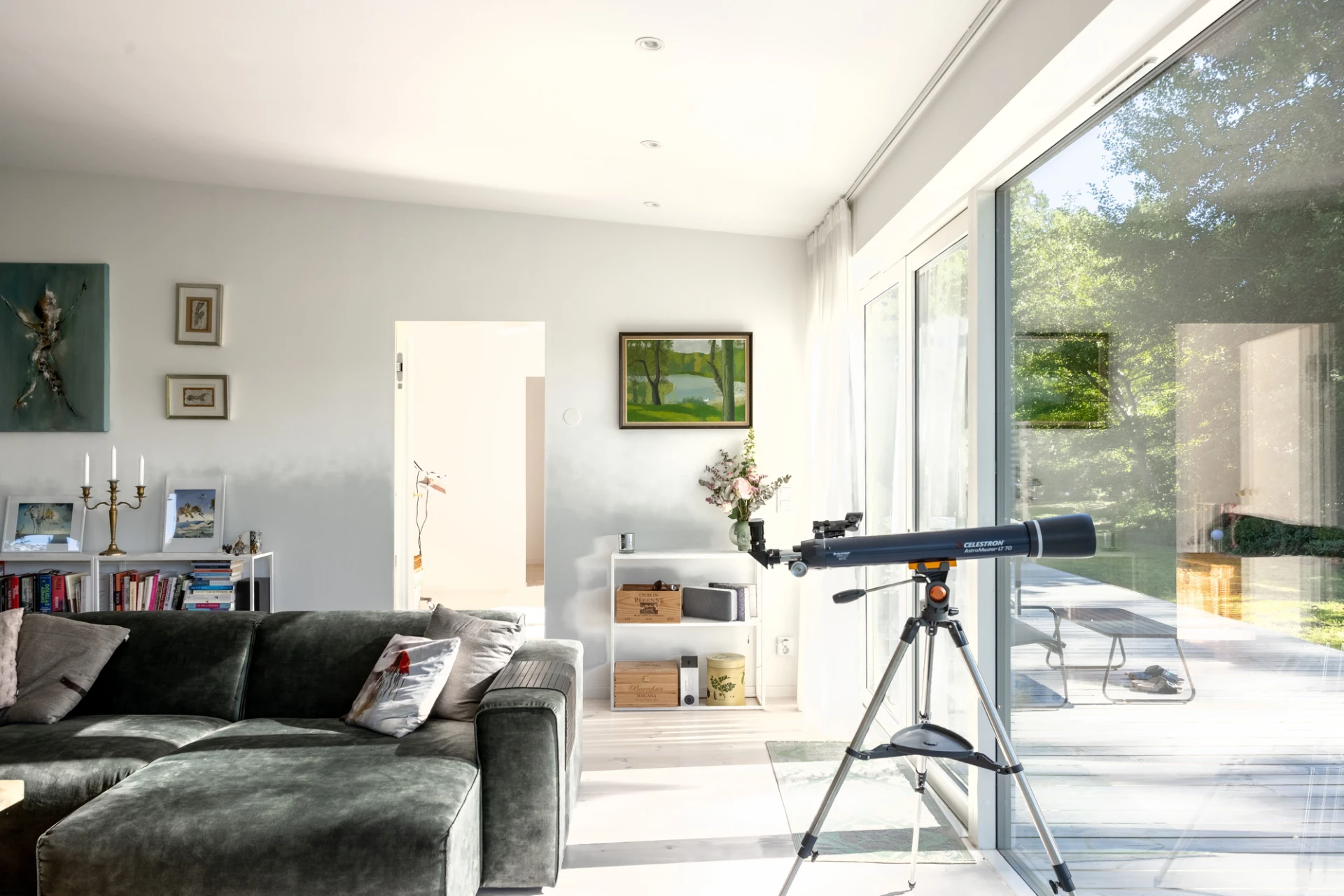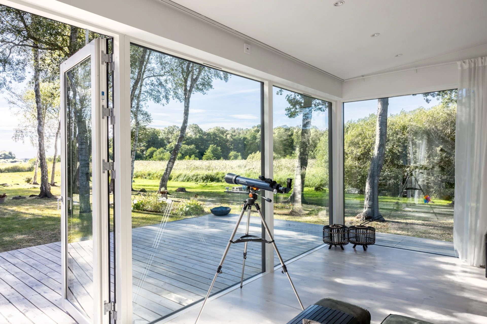 Vitlaserad parkett och vita väggar. Här finns en braskamin samt stora fönsterpartier med öppningsbar sektion mot utemiljön.