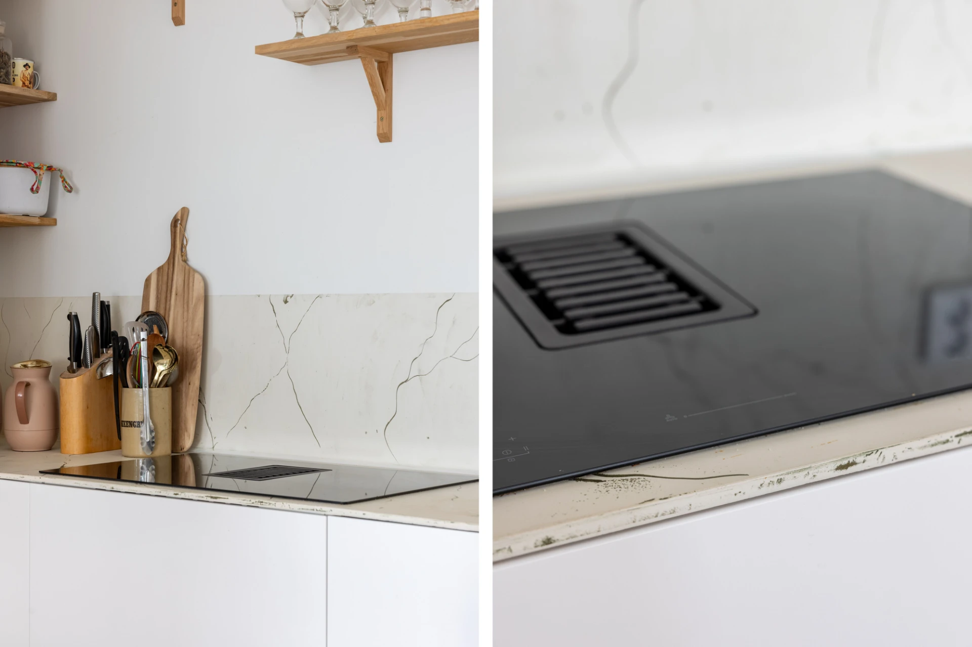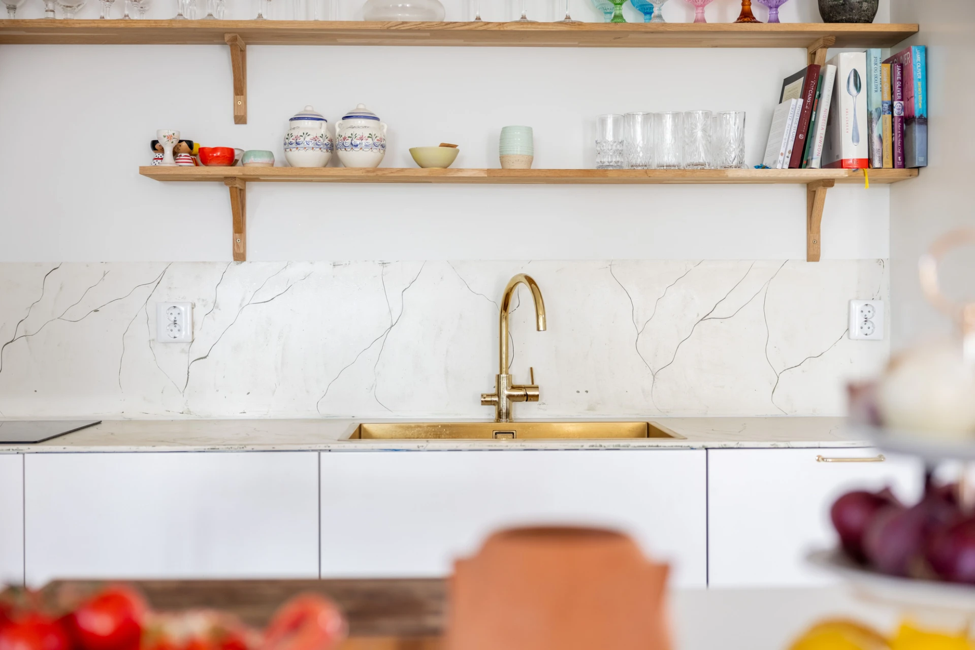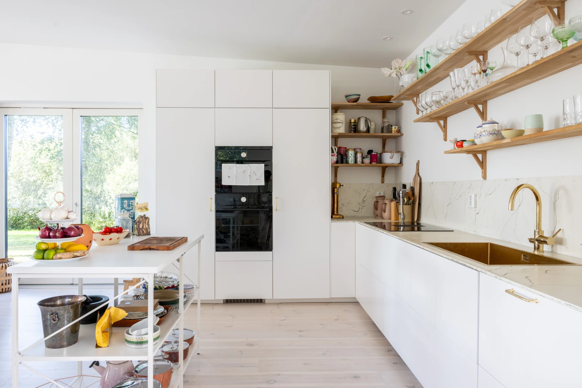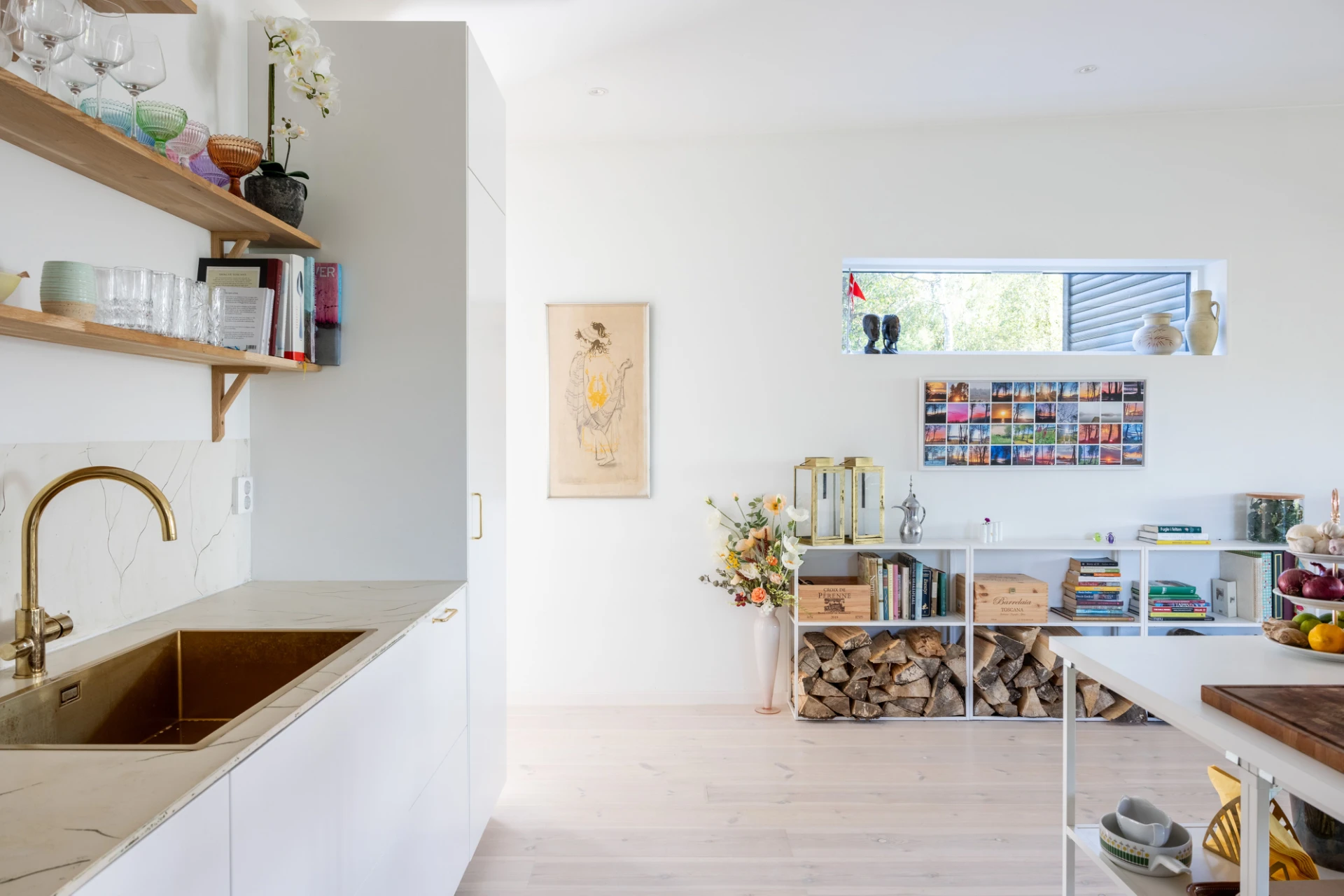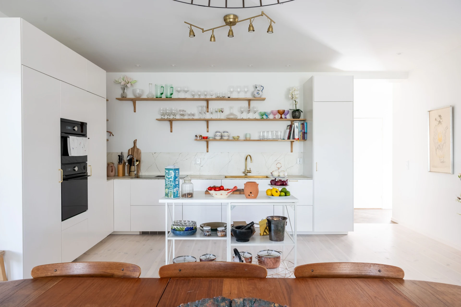Vitlaserad parkett och vita väggar. Vit köksinredning samt enhetligt stänkskydd och bänkskiva i ljusmelerad marmor. Köket är utrustat med integrerad kyl och frys, inbyggd ugn, inbyggd mikrovågsugn, integrerad diskmaskin och induktionshäll med inbyggd fläkt.