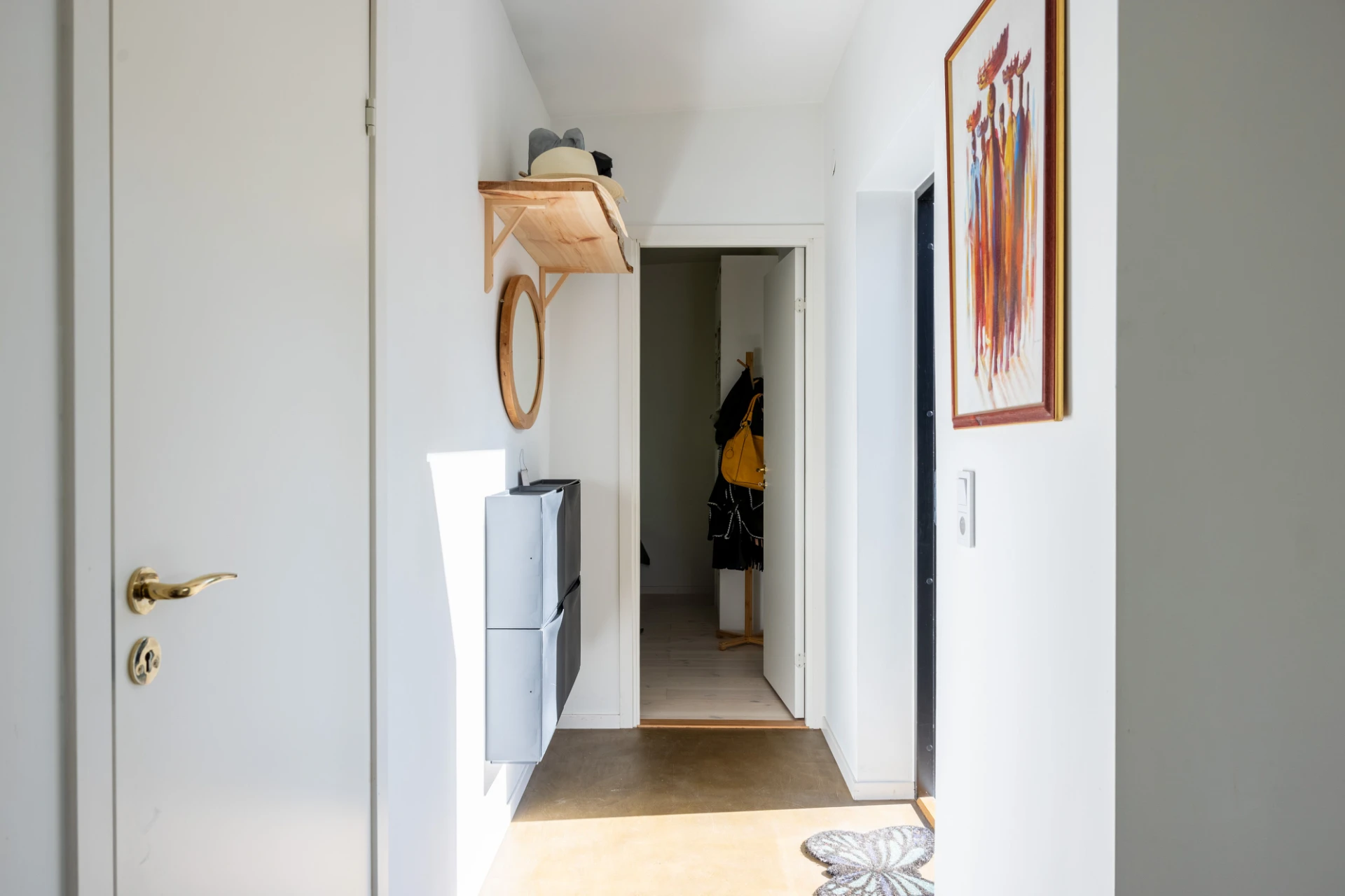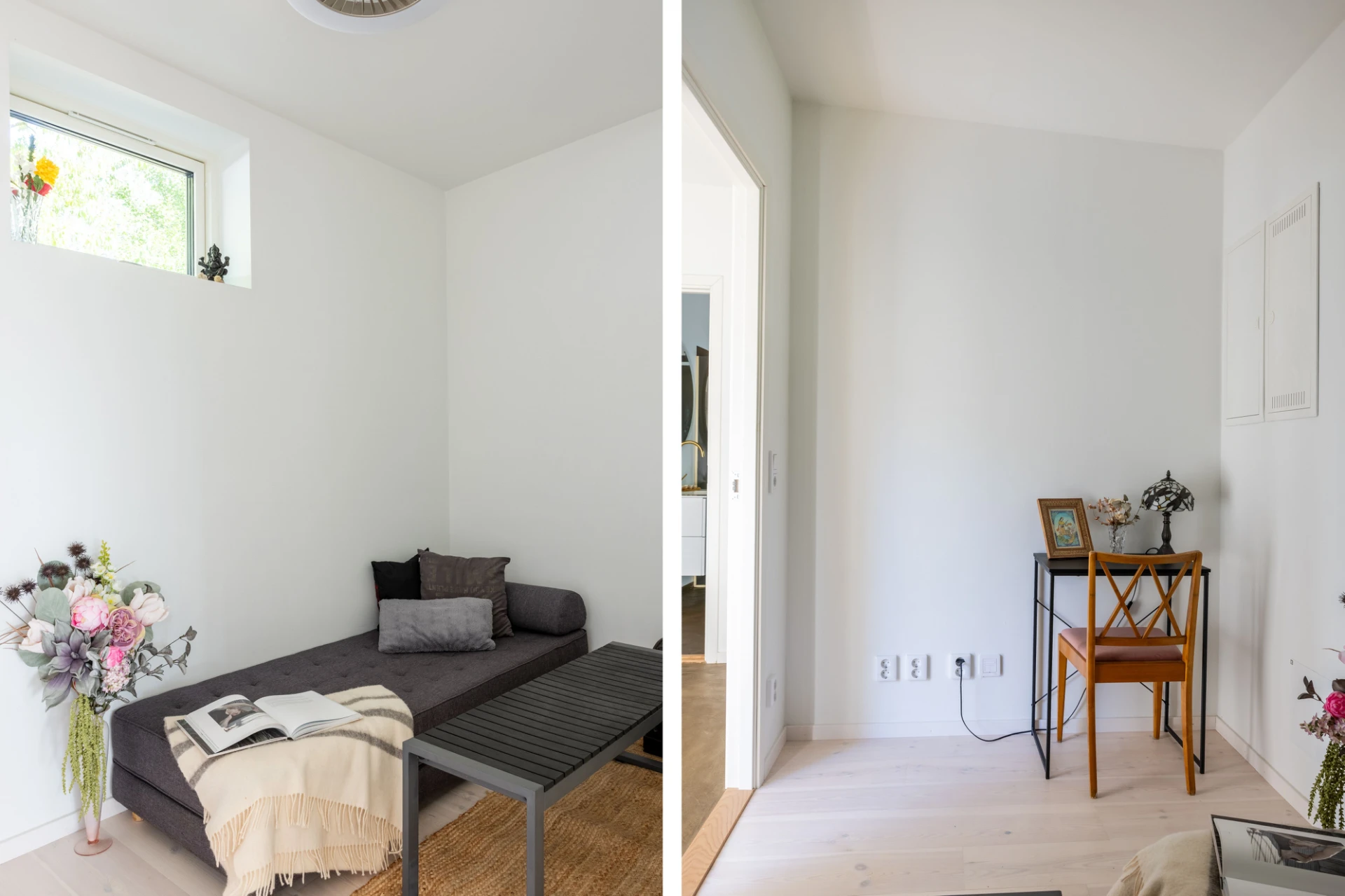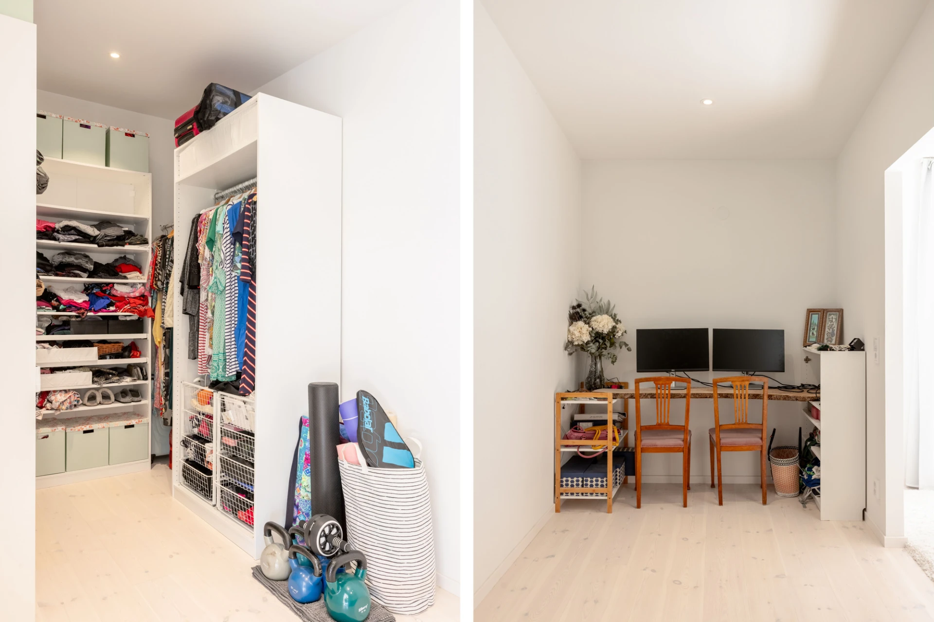 Vitlaserad parkett och vita väggar.