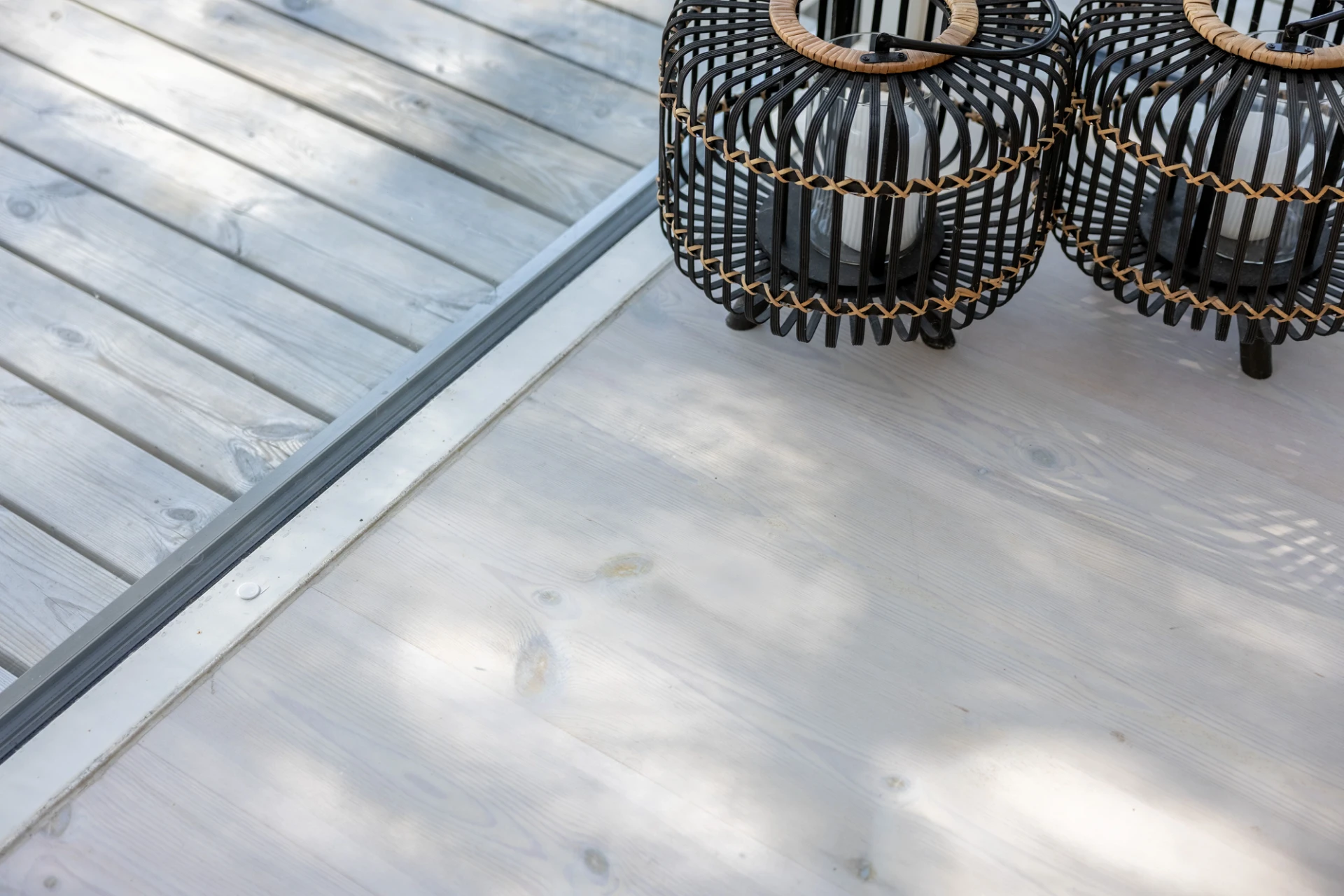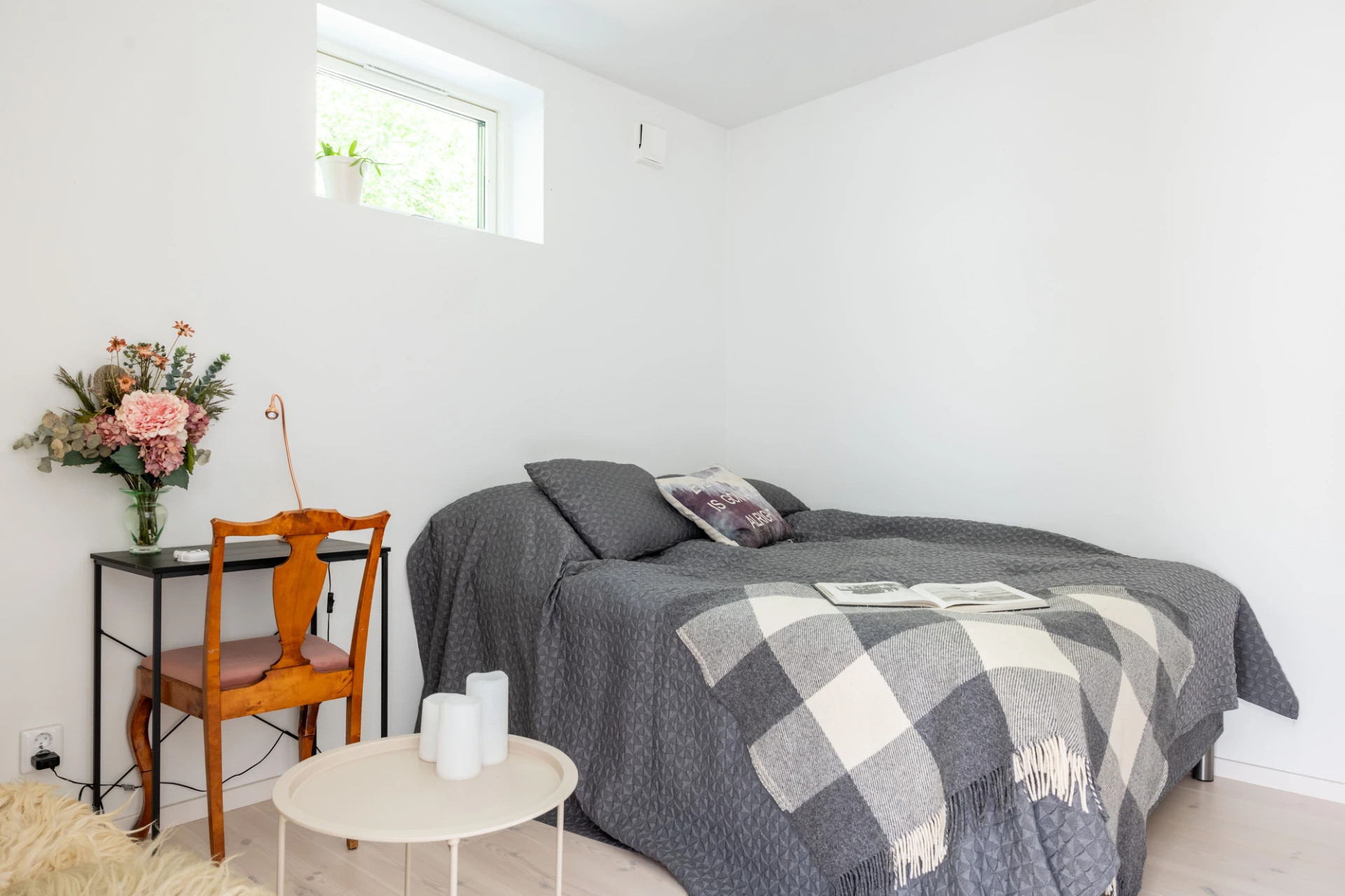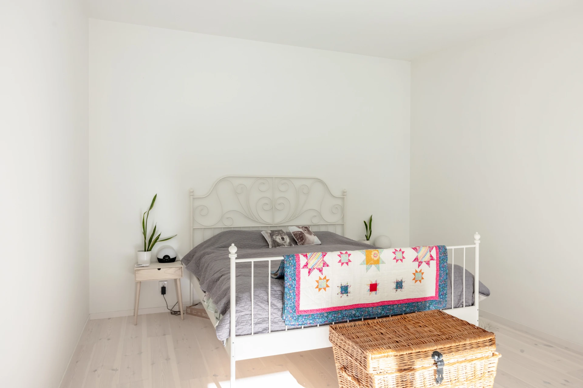 Vitlaserad parkett och vita väggar.