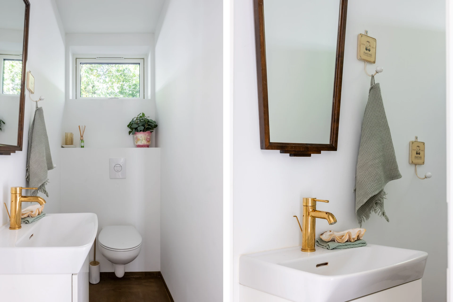 Mörkt golv och vita väggar. Här finns WC, handfat med kommod och spegel.