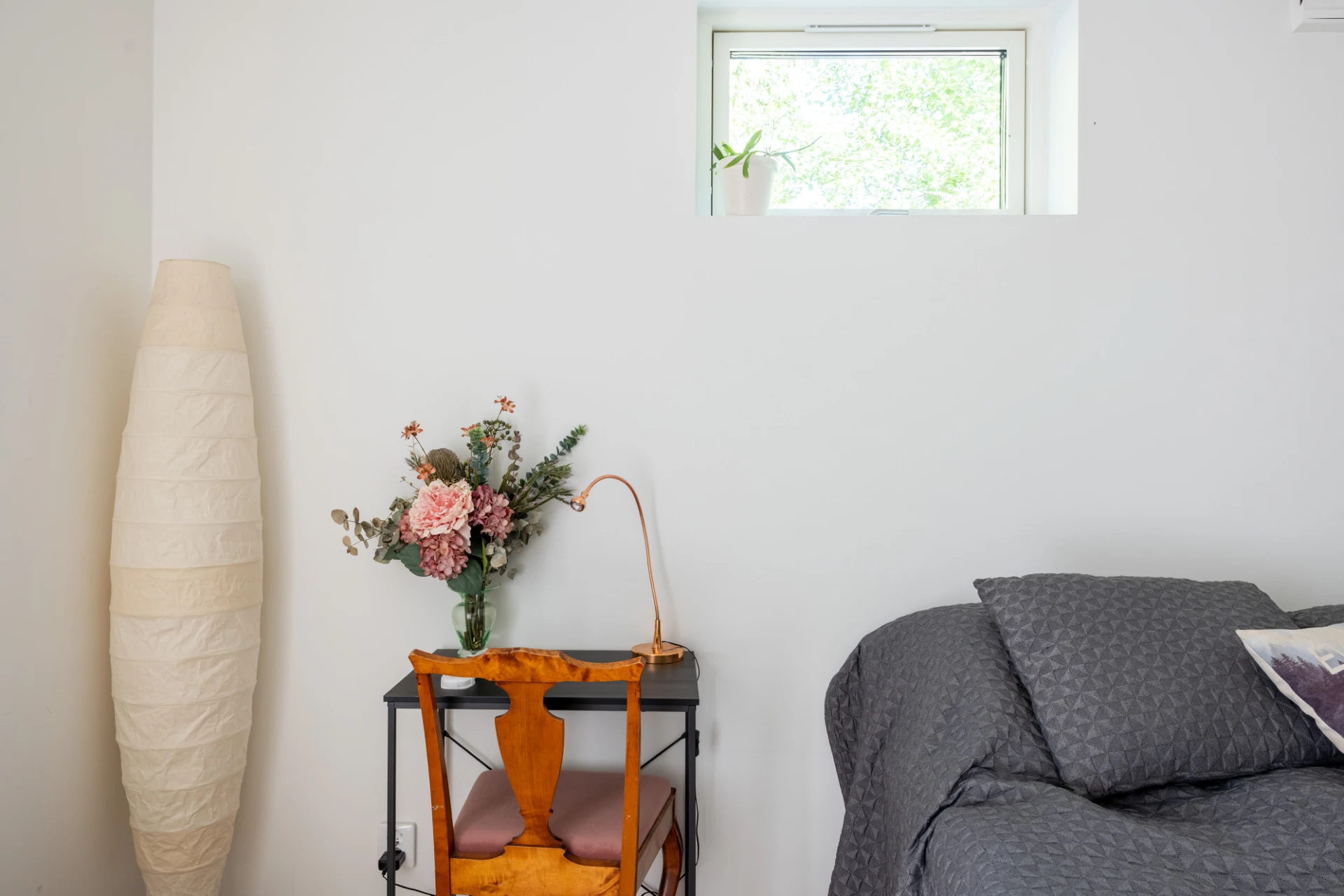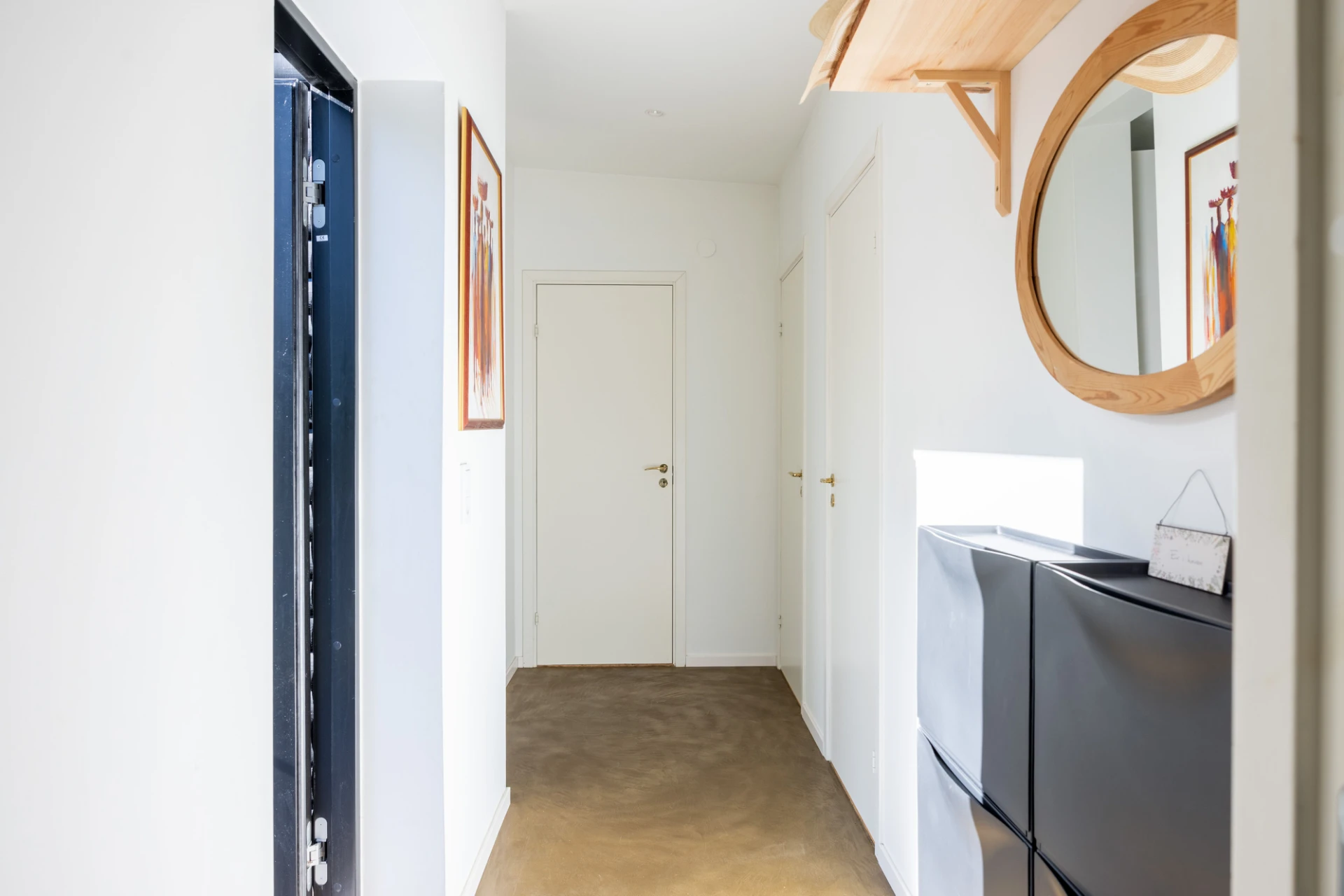 Mörkt golv och vita väggar.