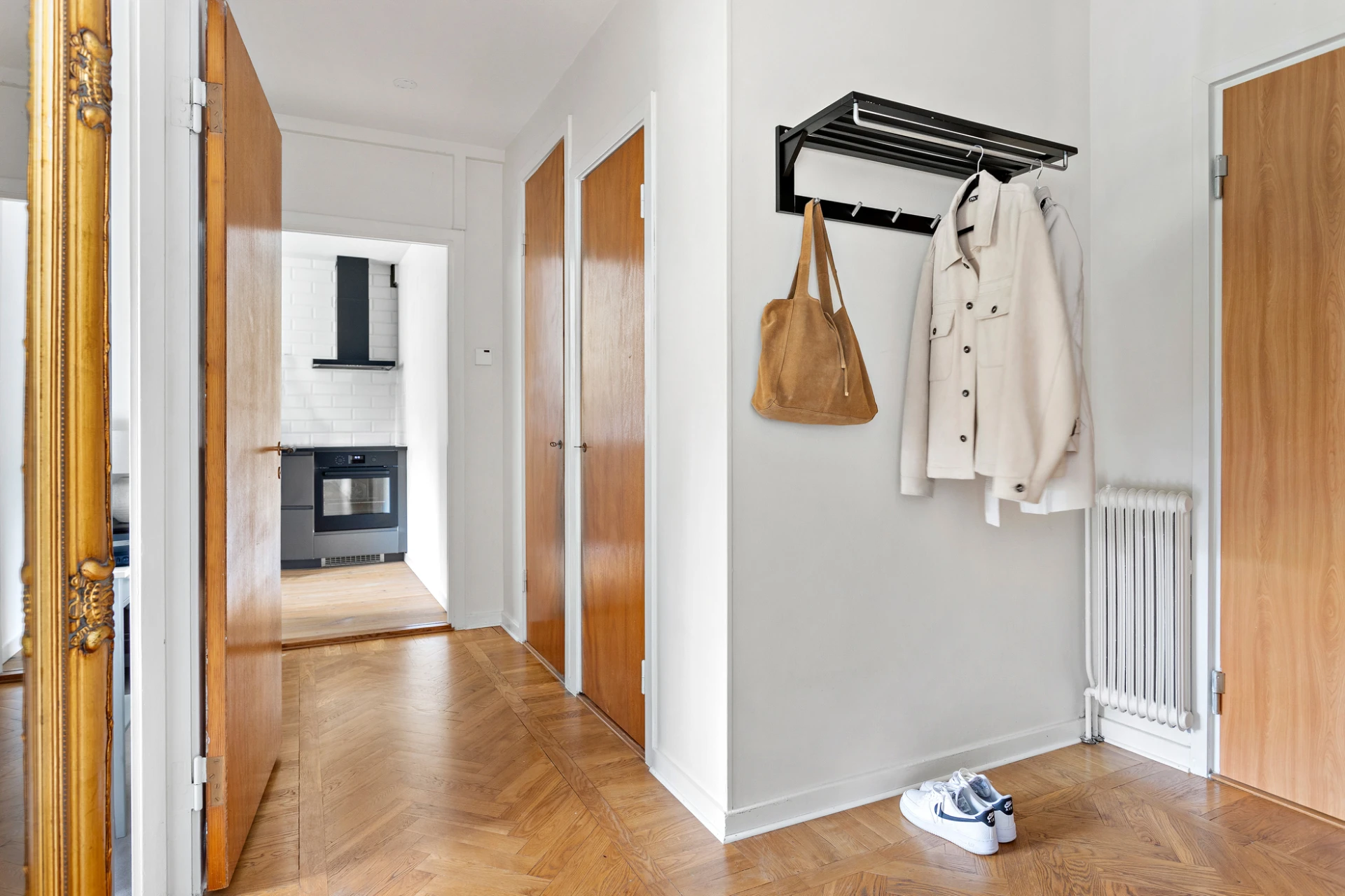 Fiskbensparkett och vita väggar. Här finns stor klädkammare.