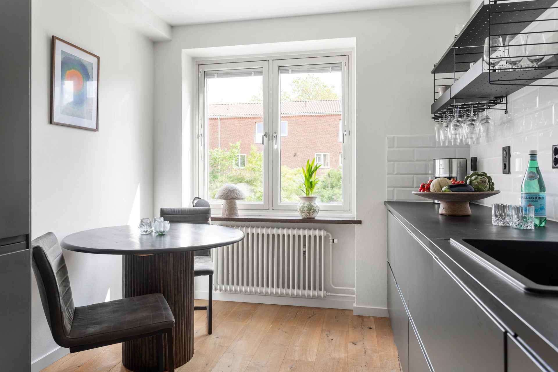 Det renoverade köket är både stilrent och funktionellt, med gott om arbetsytor och förvaring – perfekt för både vardagsmatlagning och trevliga middagar med vänner. Intill köket finns plats för en matgrupp vid fönstret, där solen gärna tittar in under dagens ljusa timmar.