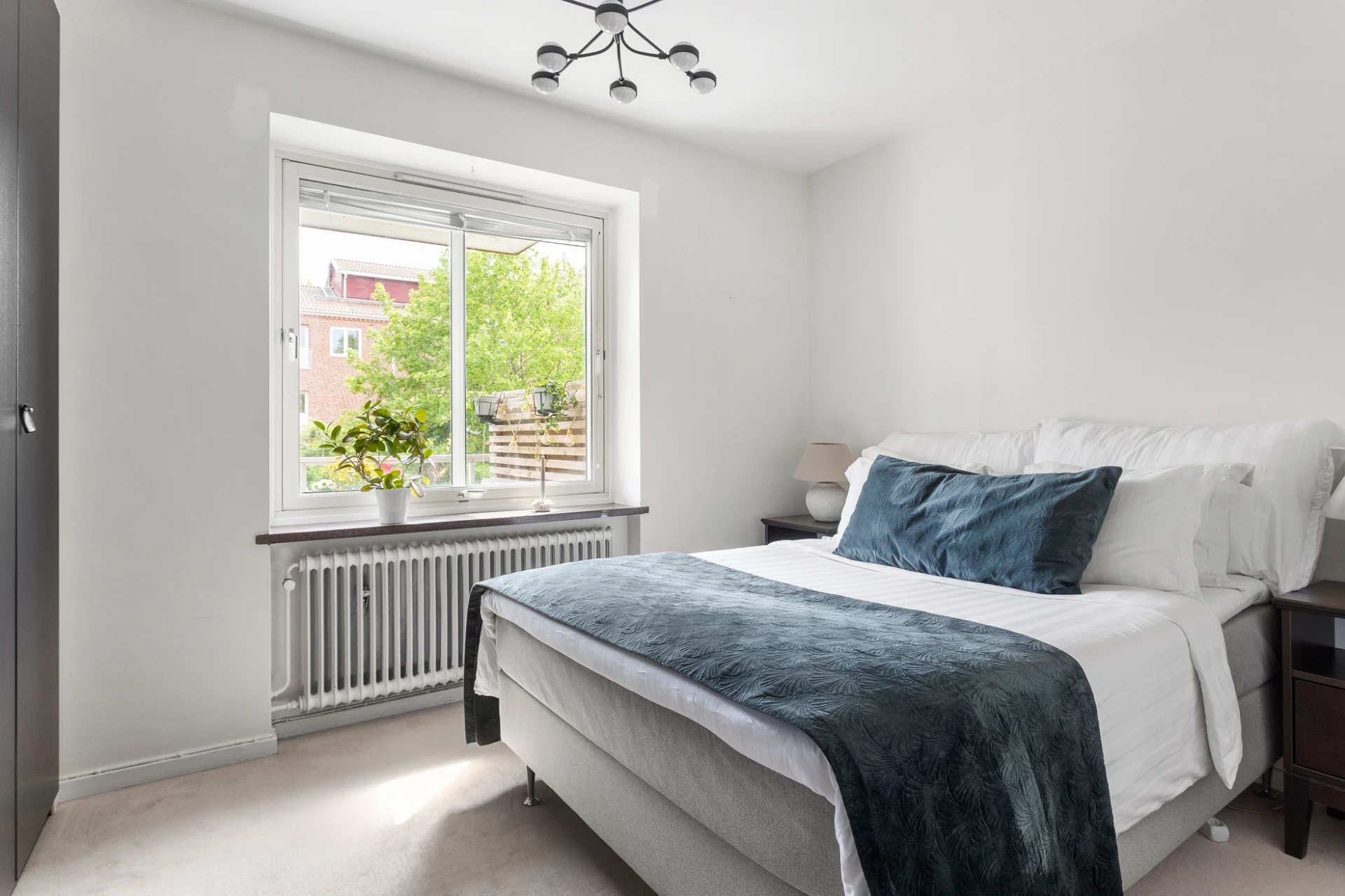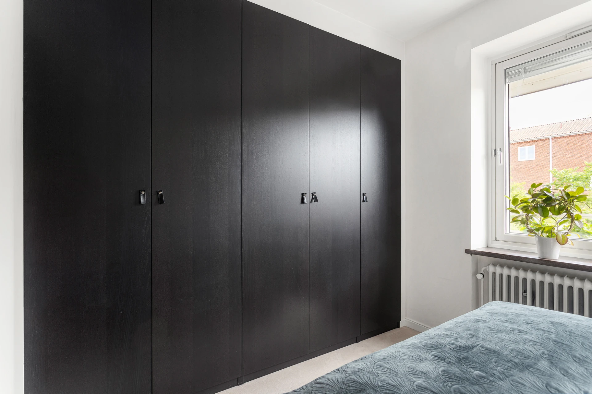 Heltäckningsmatta och vita väggar. Här finns plats för stor säng och generöst med inbyggd förvaring.