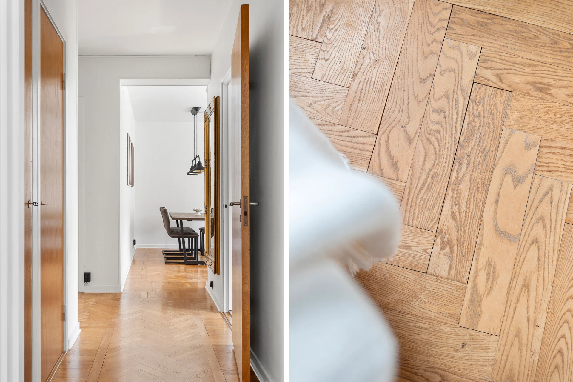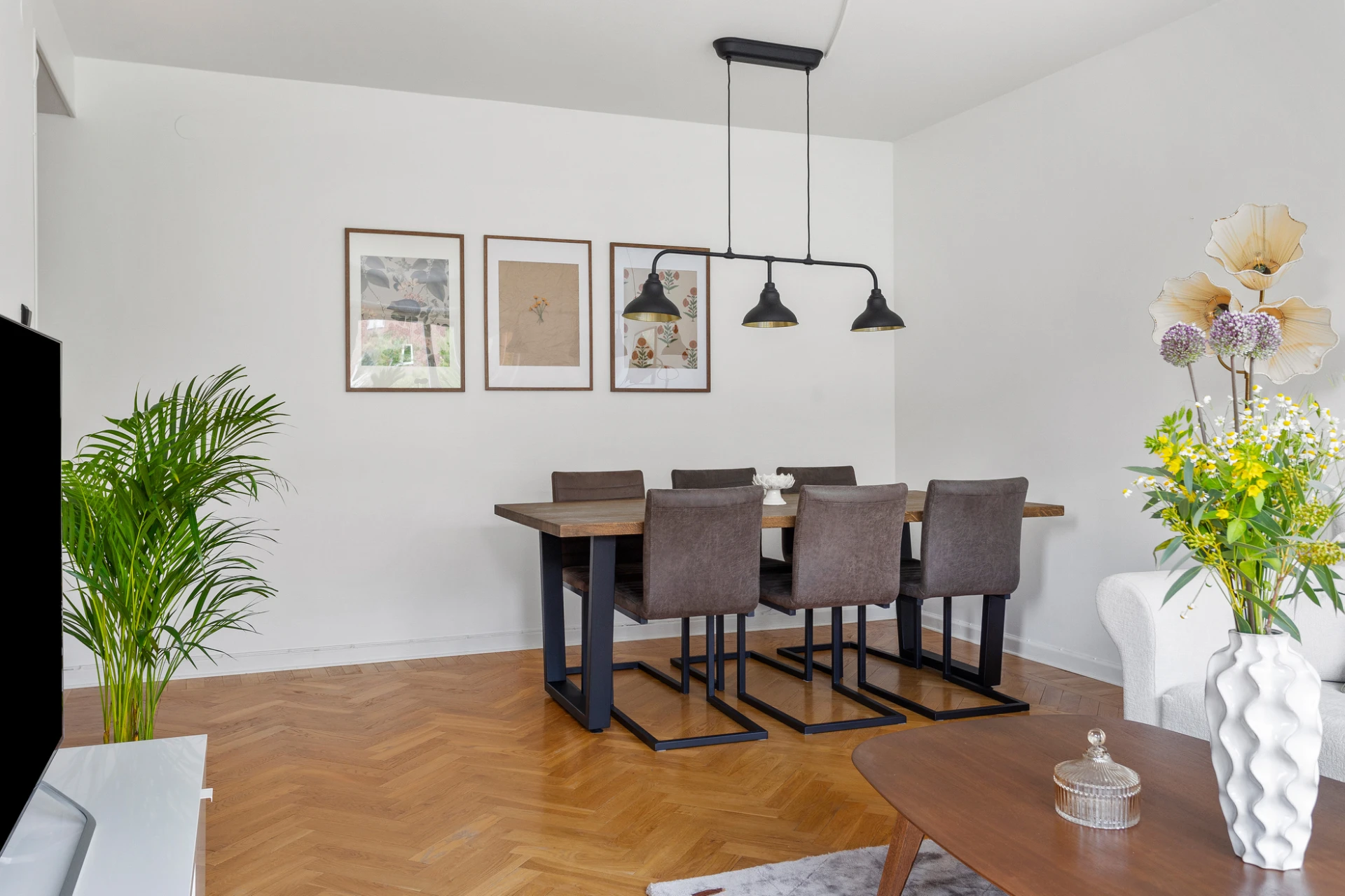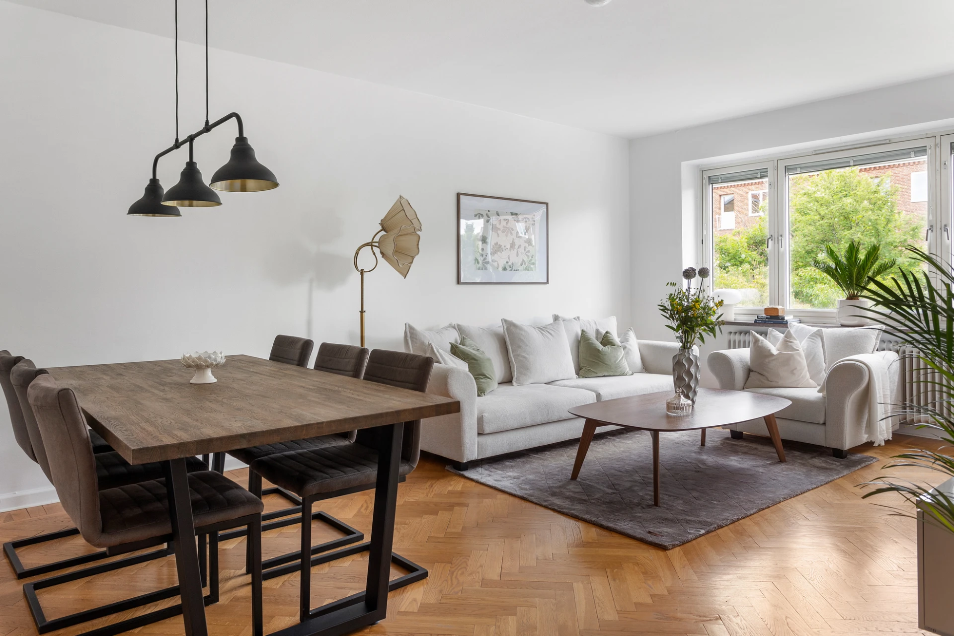 Fiskbensparkett och vita väggar. Här finns plats för såväl stor matgrupp som soffgrupp. Från denna del når vi även balkongen.